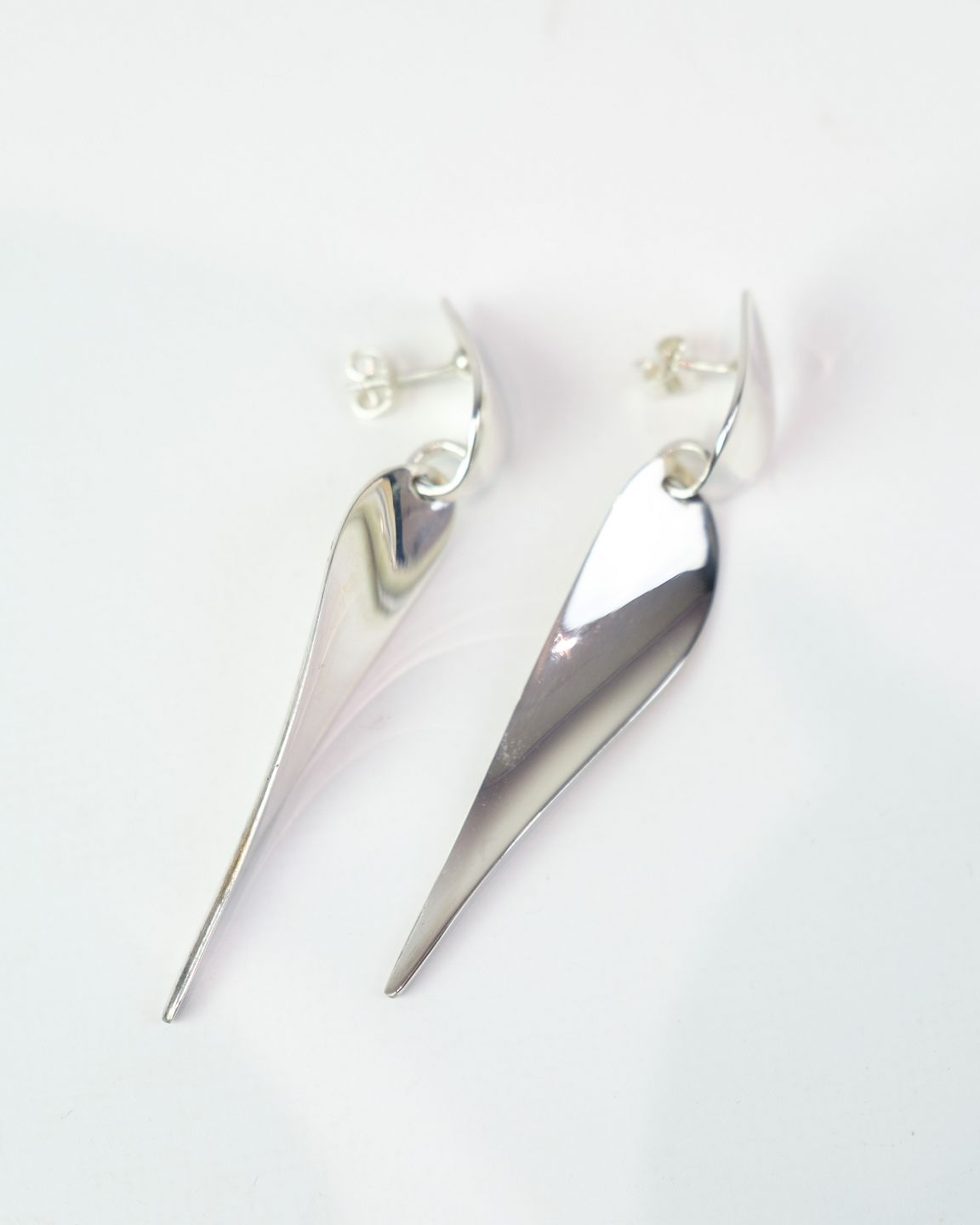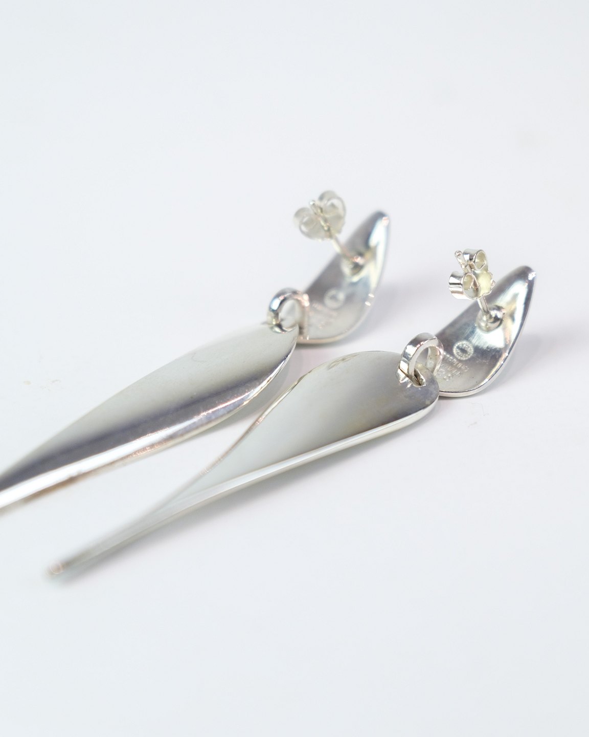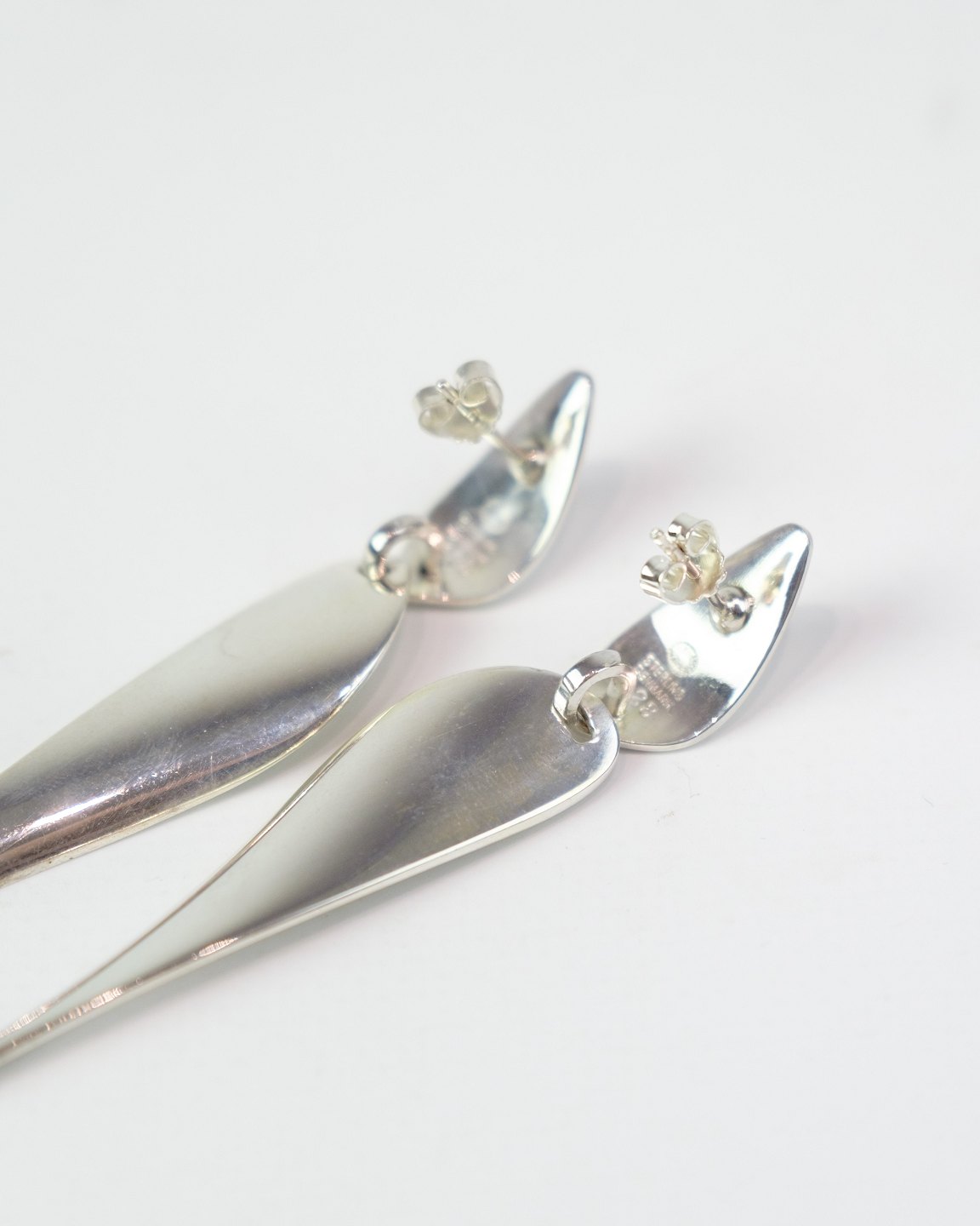 Long Drop-øreringe designet af Nanna Ditzel for Georg Jensen. Udført i sterlingsølv (925S) og kendt for deres dråbeinspirerede form, der elegant følger ansigtets bevægelse.