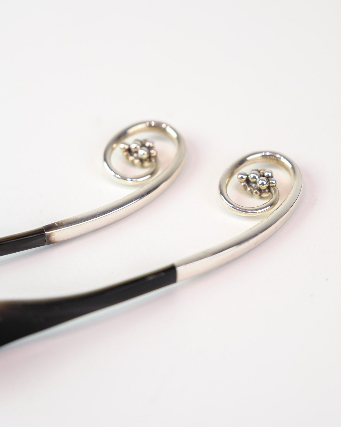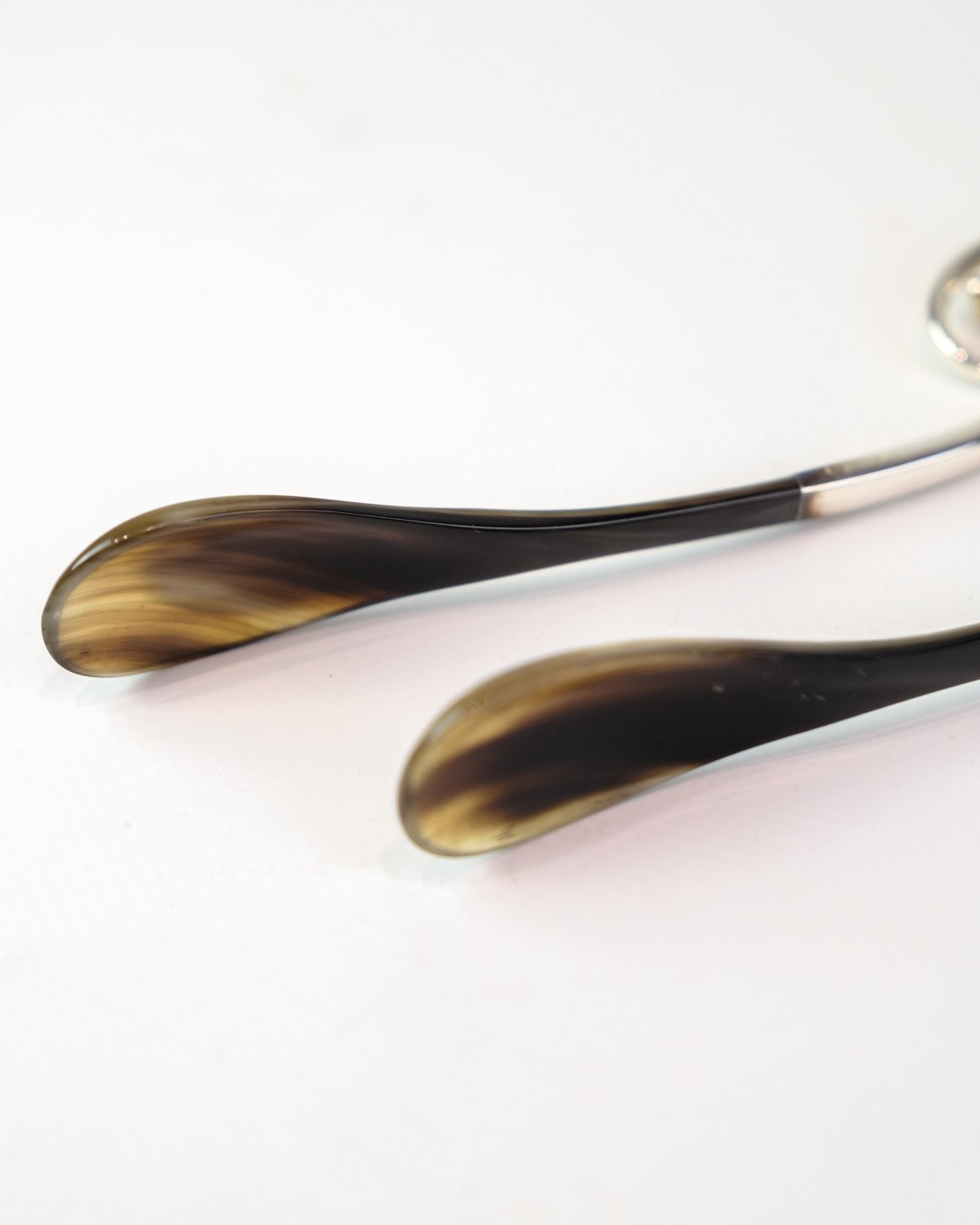 Elegant Kaviarske fra Georg Jensen udført i sterlingsølv. Kaviarskeen er udført i 925 sterlingsølv og horn fra opdrættet kvæg. Den er håndlavet med omhu gennem en tidskrævende proces, og sterlingsølvet har til slut fået en oxideret finish, som fremhæver de smukke håndlavede detaljer. Da horn er et natur materiale, kan der forekomme variationer i udseendet, og derfor er ikke to skeer ens.