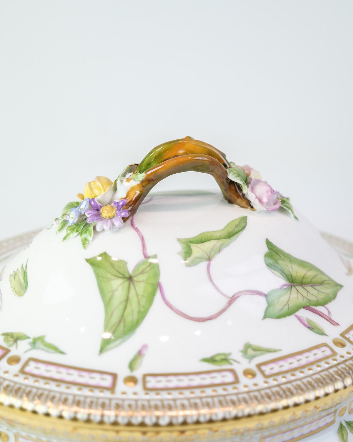 Kontakt os vedrørende prisTerrin fra Royal Copenhagens Flora Danica-serie, udført i porcelæn og håndmalet med dekoration nr. 20/3559. Terrinen er rigt dekoreret med naturtro blomster og forsynet med låghank og to sidehanke udformet som grenmotiver med blomster og blade i farver.