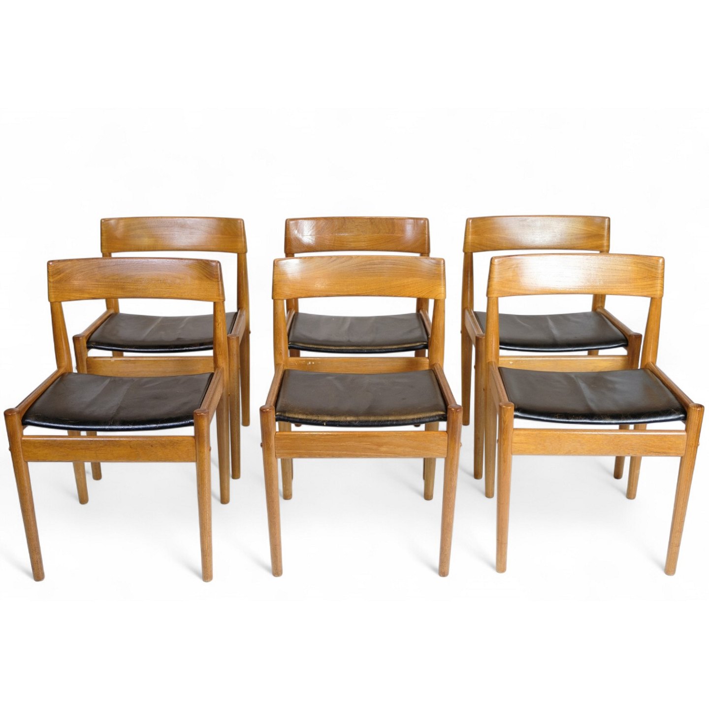 Set aus sechs Esszimmerstühlen aus Teak mit Sitzen aus original gepolstertem schwarzem Leder. Der Stuhl wurde von Grete Jalk entworfen und von Poul Jeppesen produziert. Das Modell erhielt die Nummer P J 3-2. Die Stühle stammen aus den 1960er-Jahren und befinden sich in gutem Zustand mit altersbedingter Patina an den Sitzflächen.