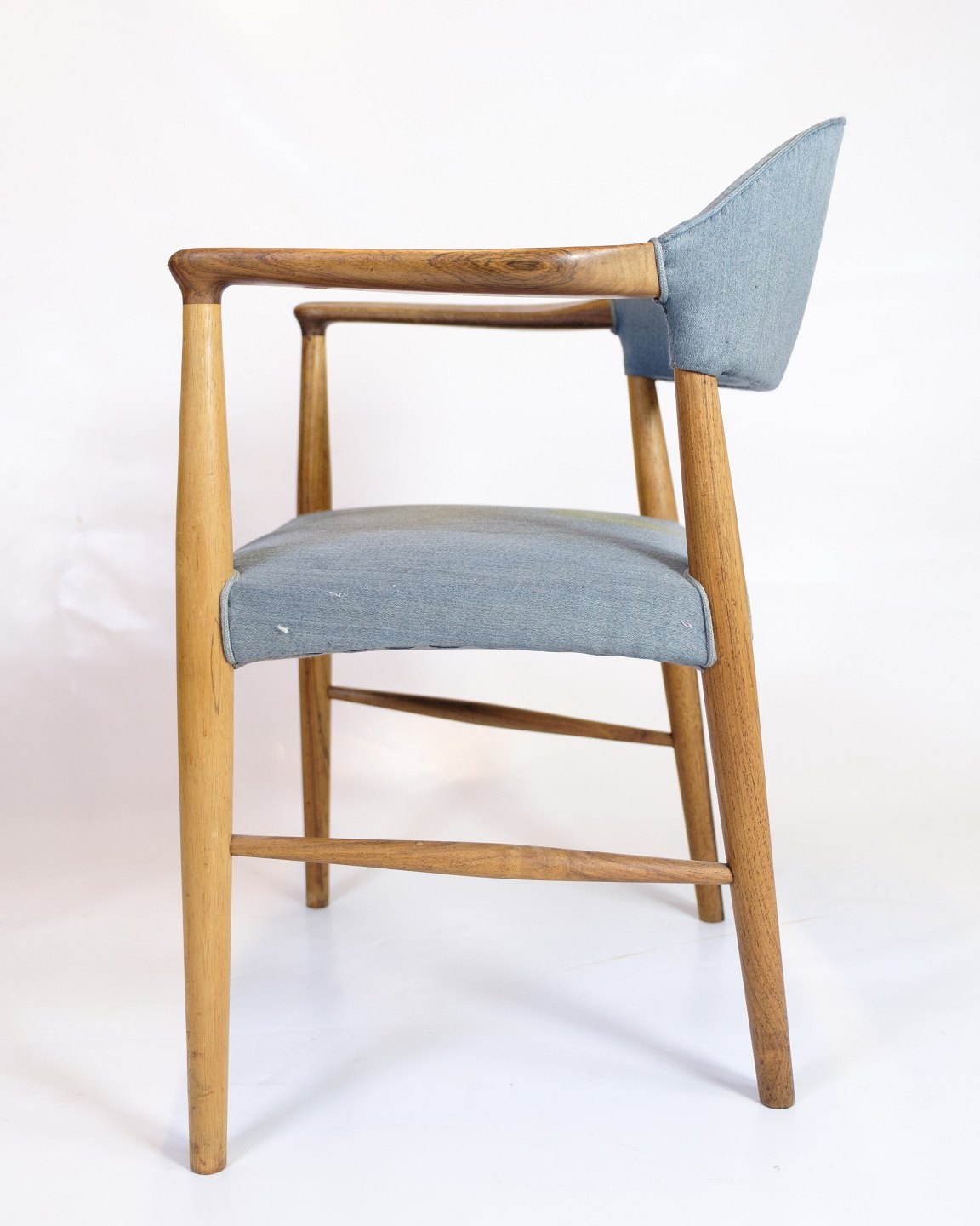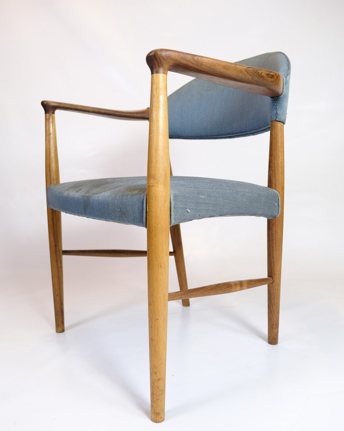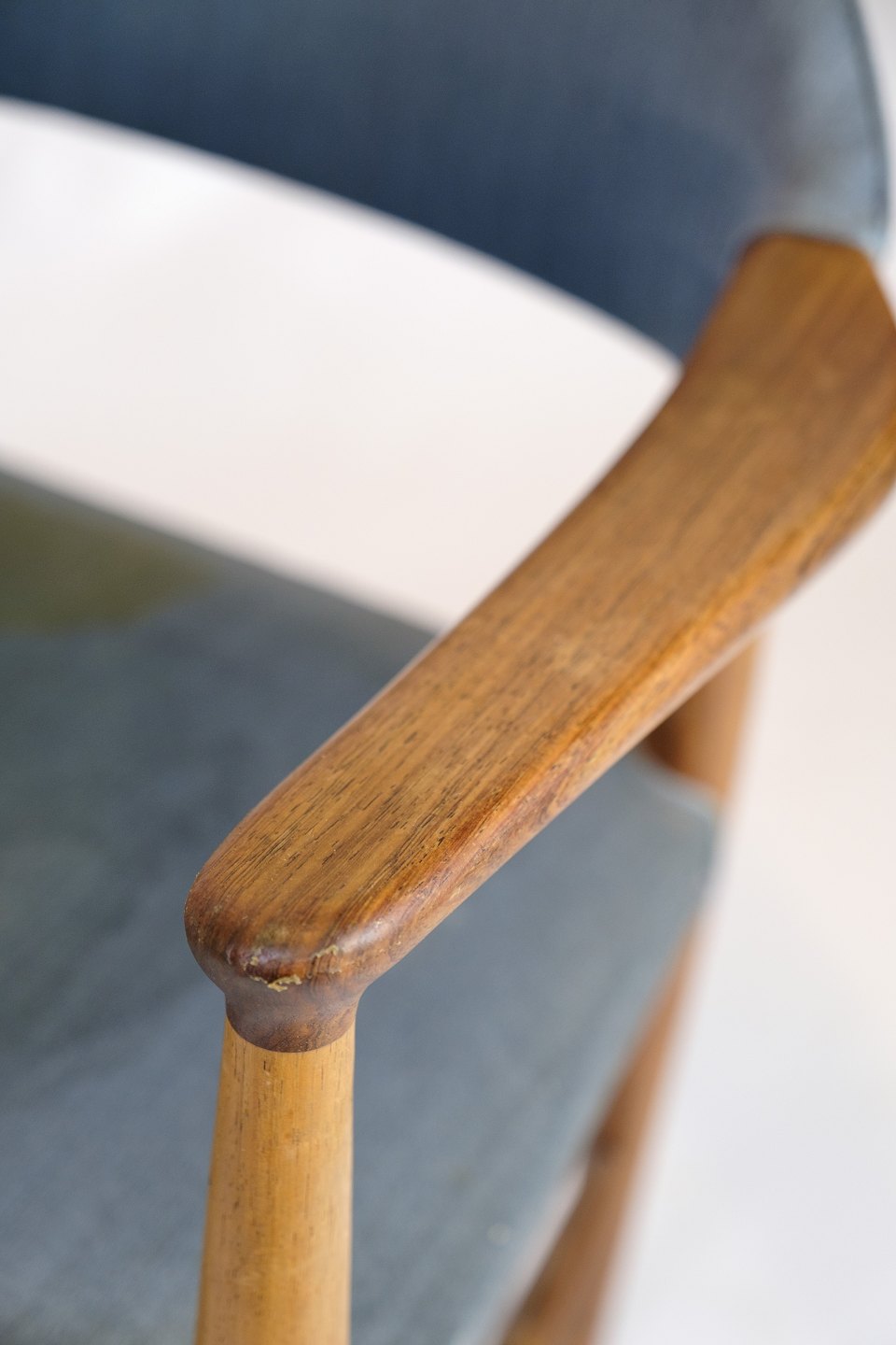 Dansk armstol i teaktræ med blåt stofsæde designet af Kurt Olsen i 1960’erne.