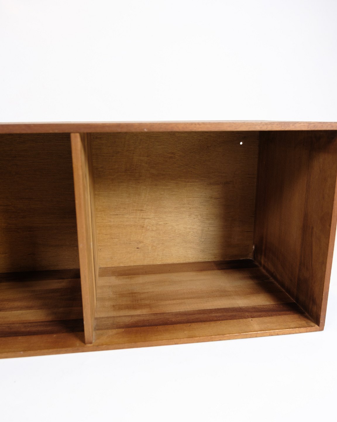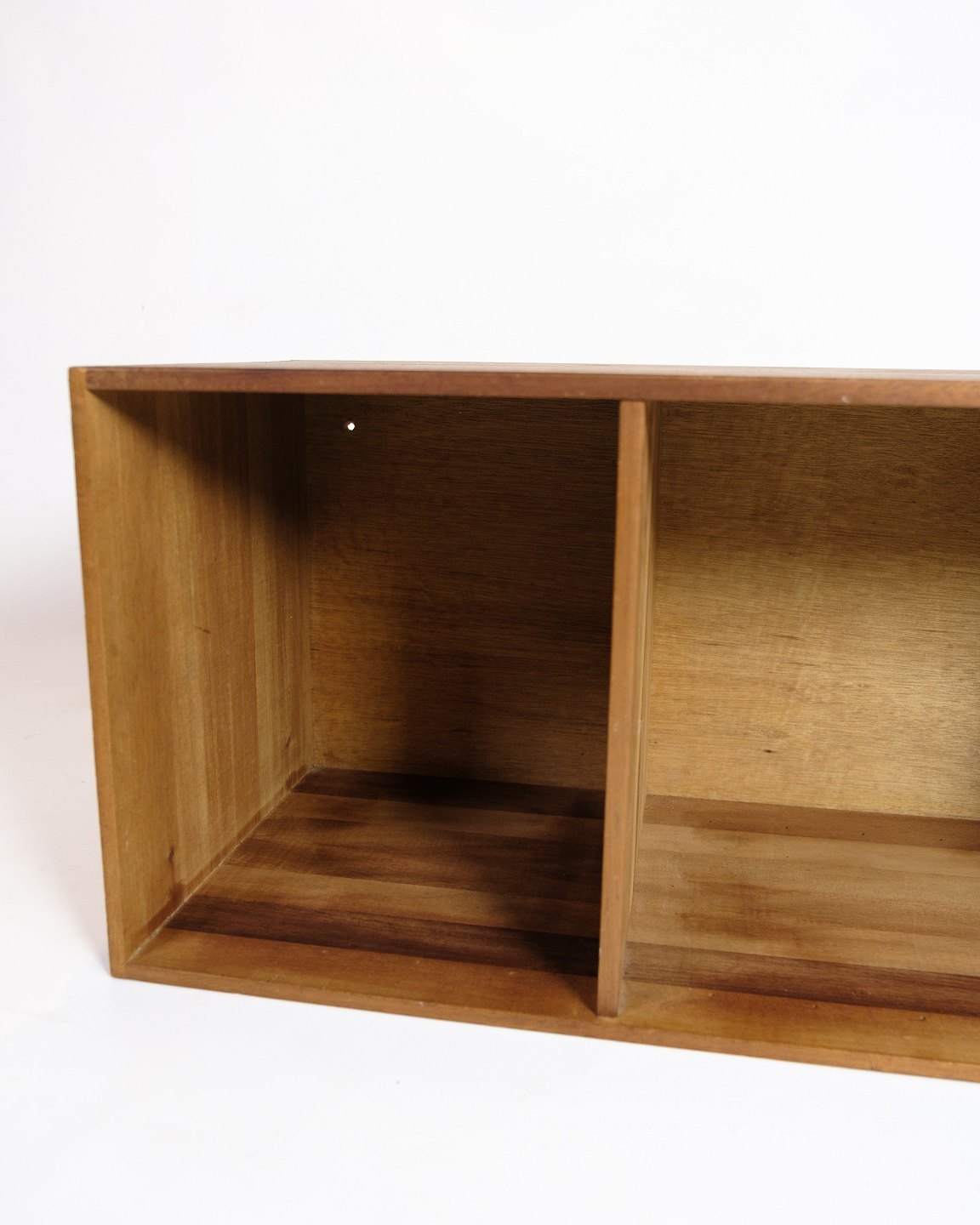 SolgtBogreol i teak med tappede samlinger, dansk design fra 1960’erne. Reolen er inddelt i to rum og egner sig godt som både vægmonteret enhed eller stående modul i en reolsammensætning.