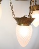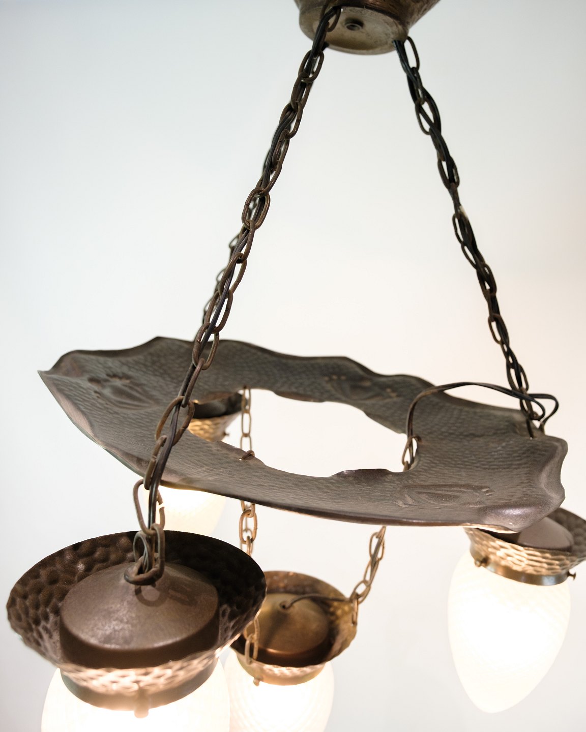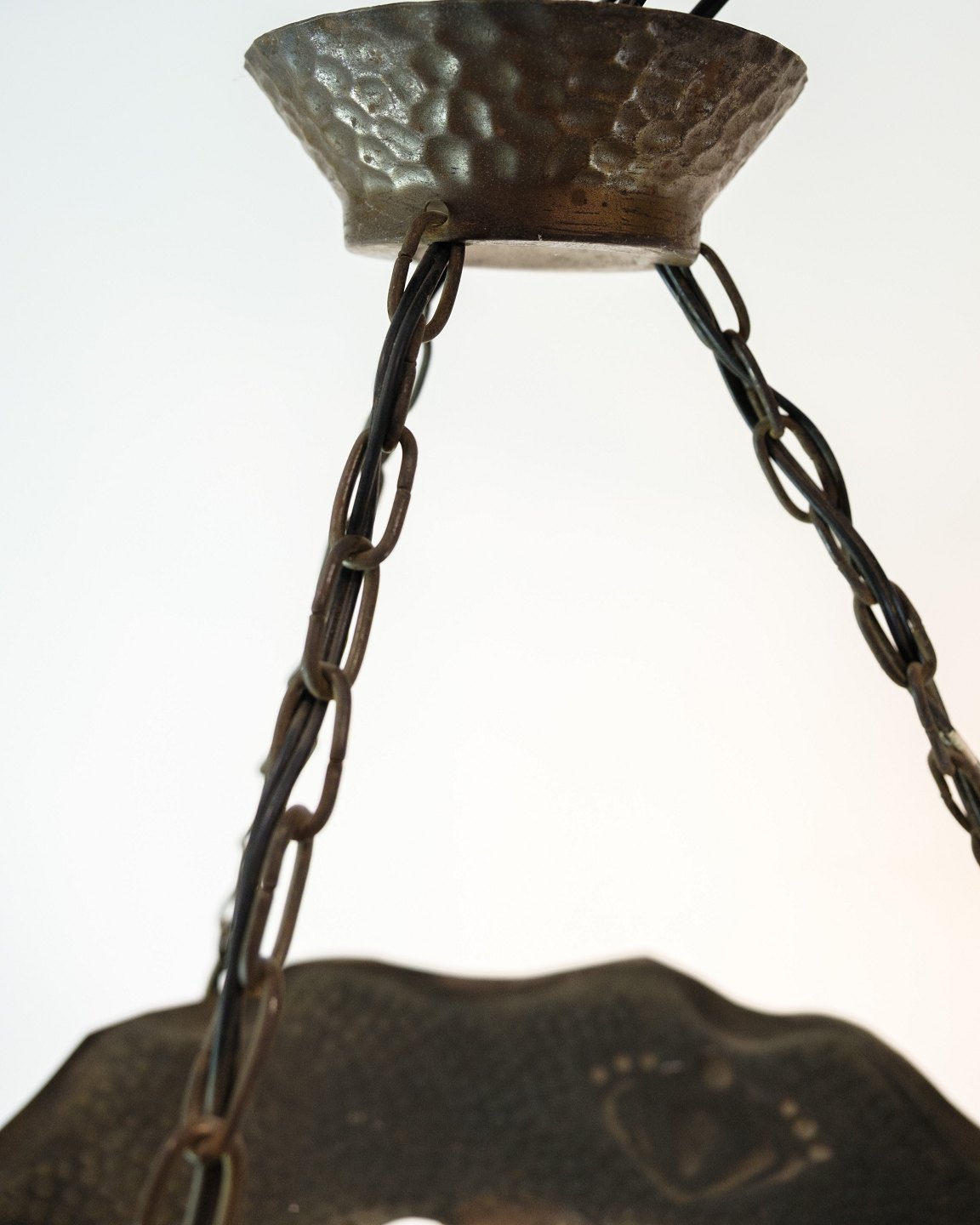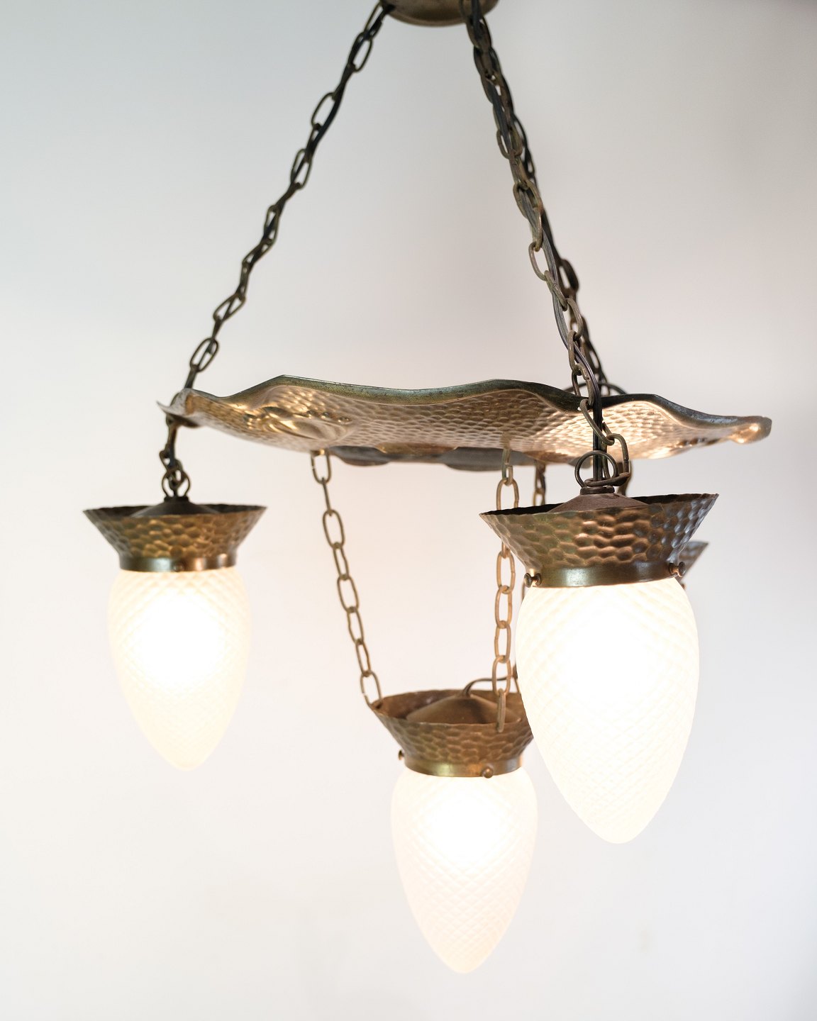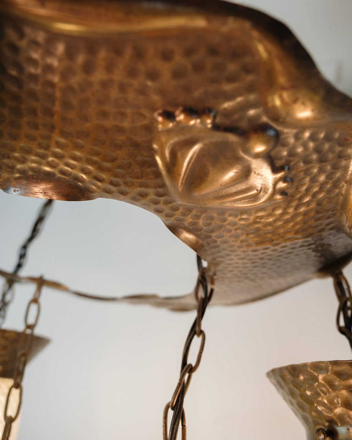 Art Nouveau chandelier from the 1920s in patinated, hammered brass with four arms and teardrop-shaped glass. Elegant classic ceiling lamp.