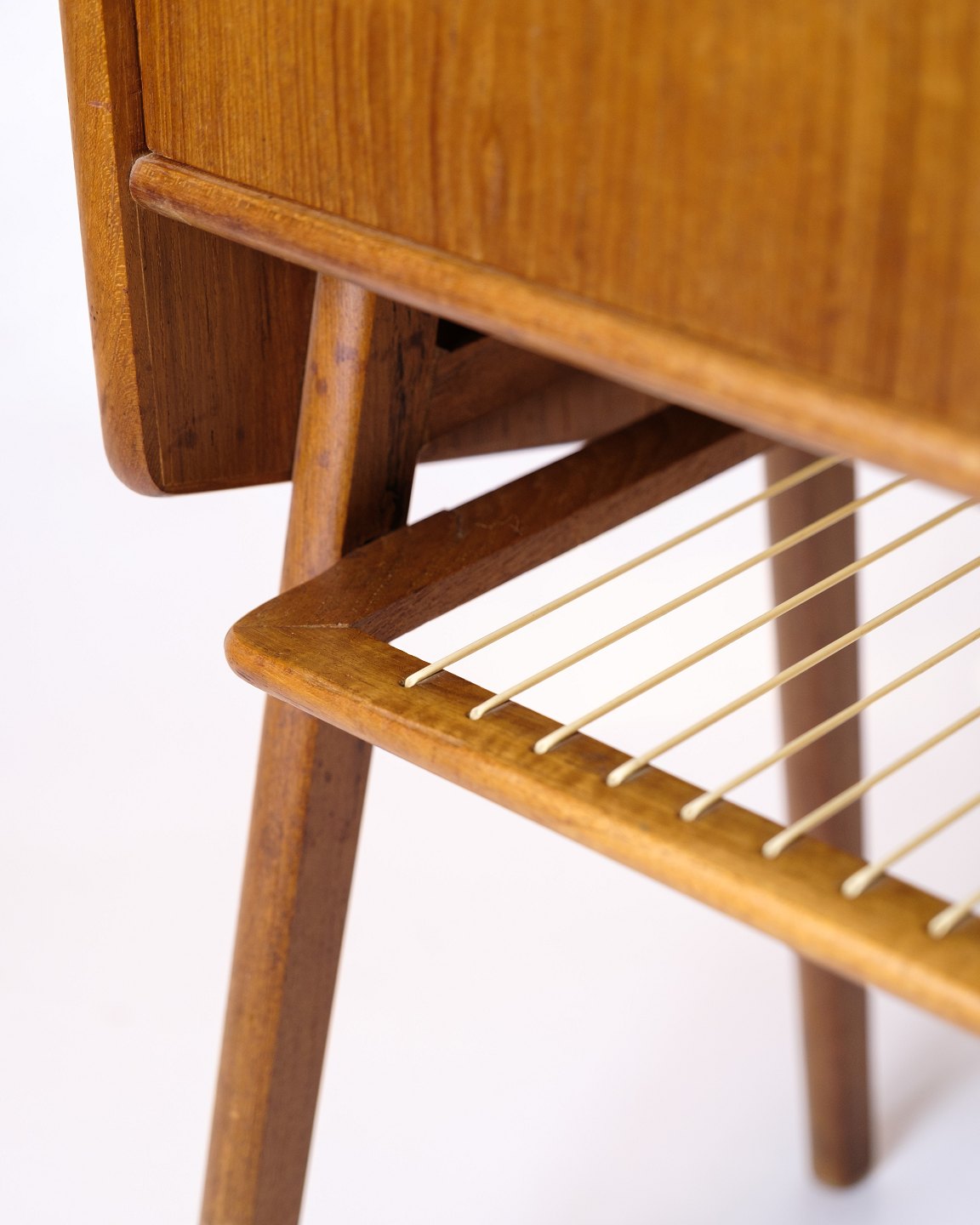Side table/nightstand in teak with drawer and wicker shelf. Danish design from the 1960s. Elegant and functional furniture in great condition.