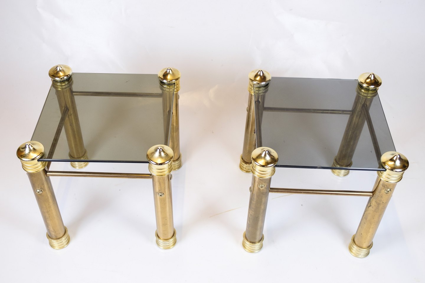Sæt af 2 vintage nat-/sideborde fra 1970’erne med messingben og sort glasplade. Elegant retrodesign i flot stand.