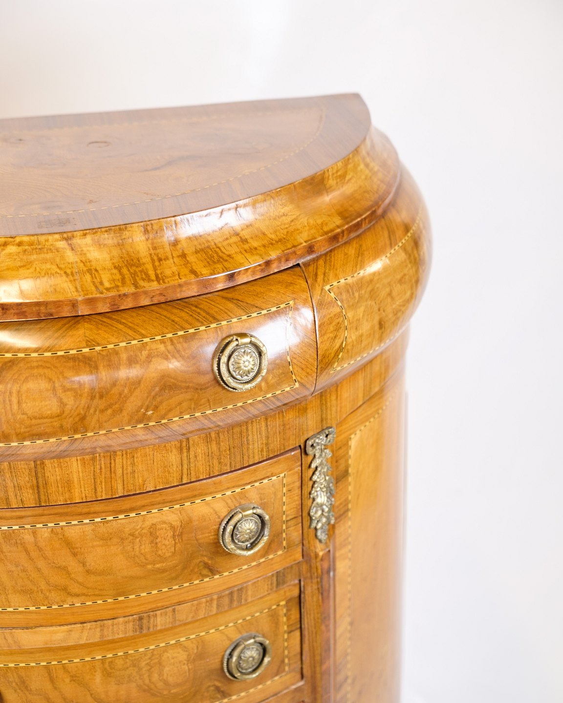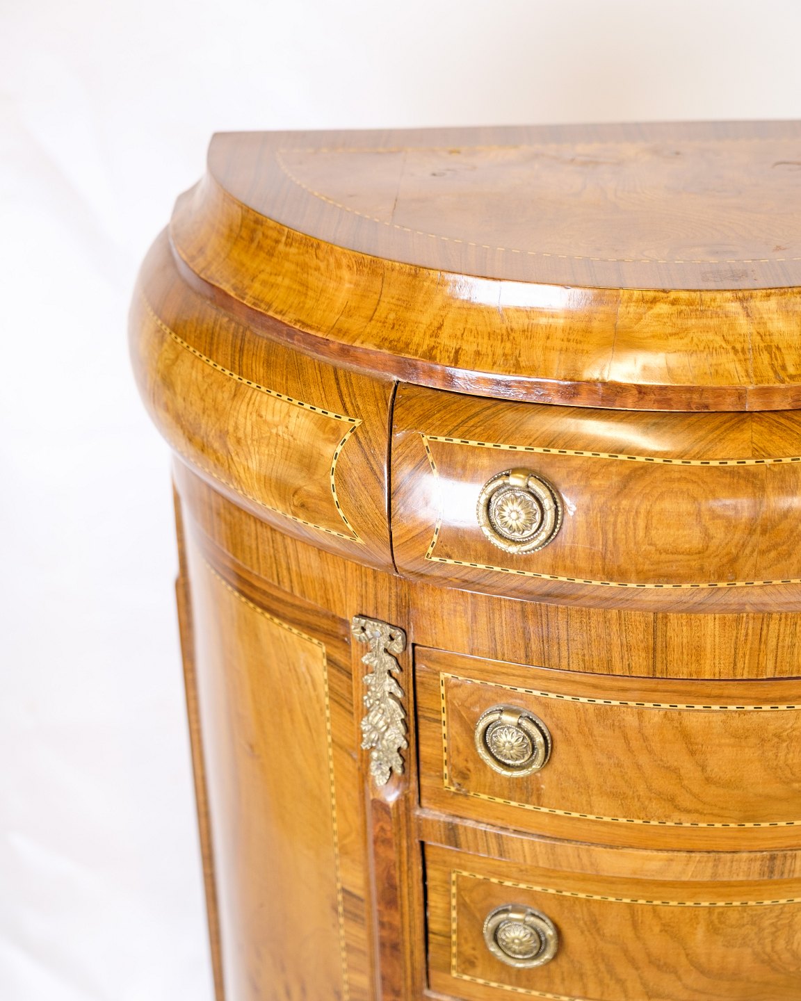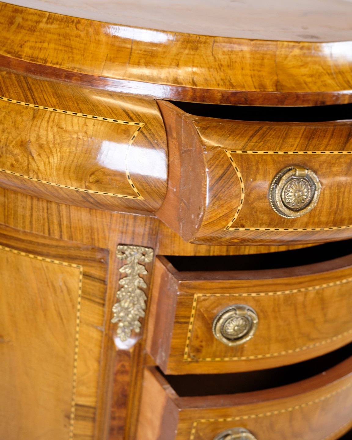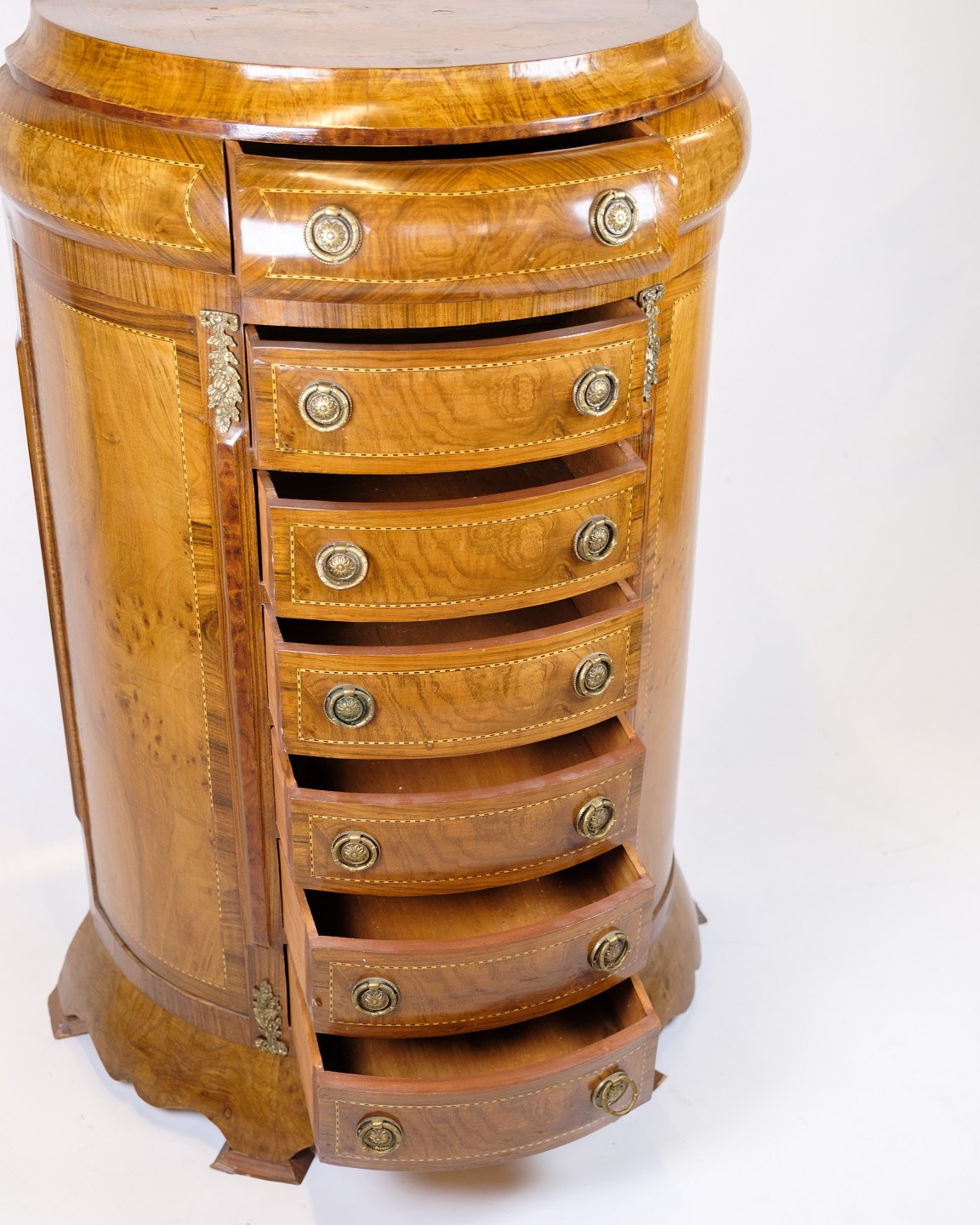 Antique high chest of drawers from the 1890s made in the Klunke style. The chest of drawers is made of rosewood with a beautiful curved front and original brass handles.
