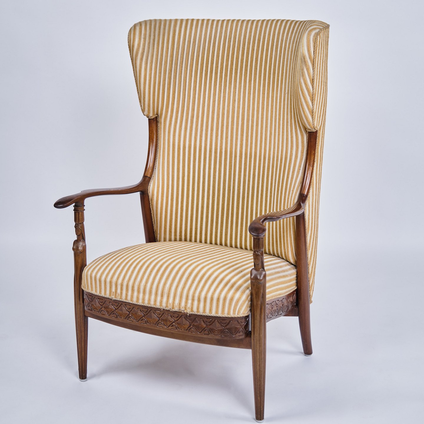 Kontakt os vedrørende prisØreklapstol fra 1930’erne. Palisander træ med stribet polstring. Klassisk snedkerarbejde.