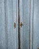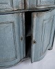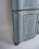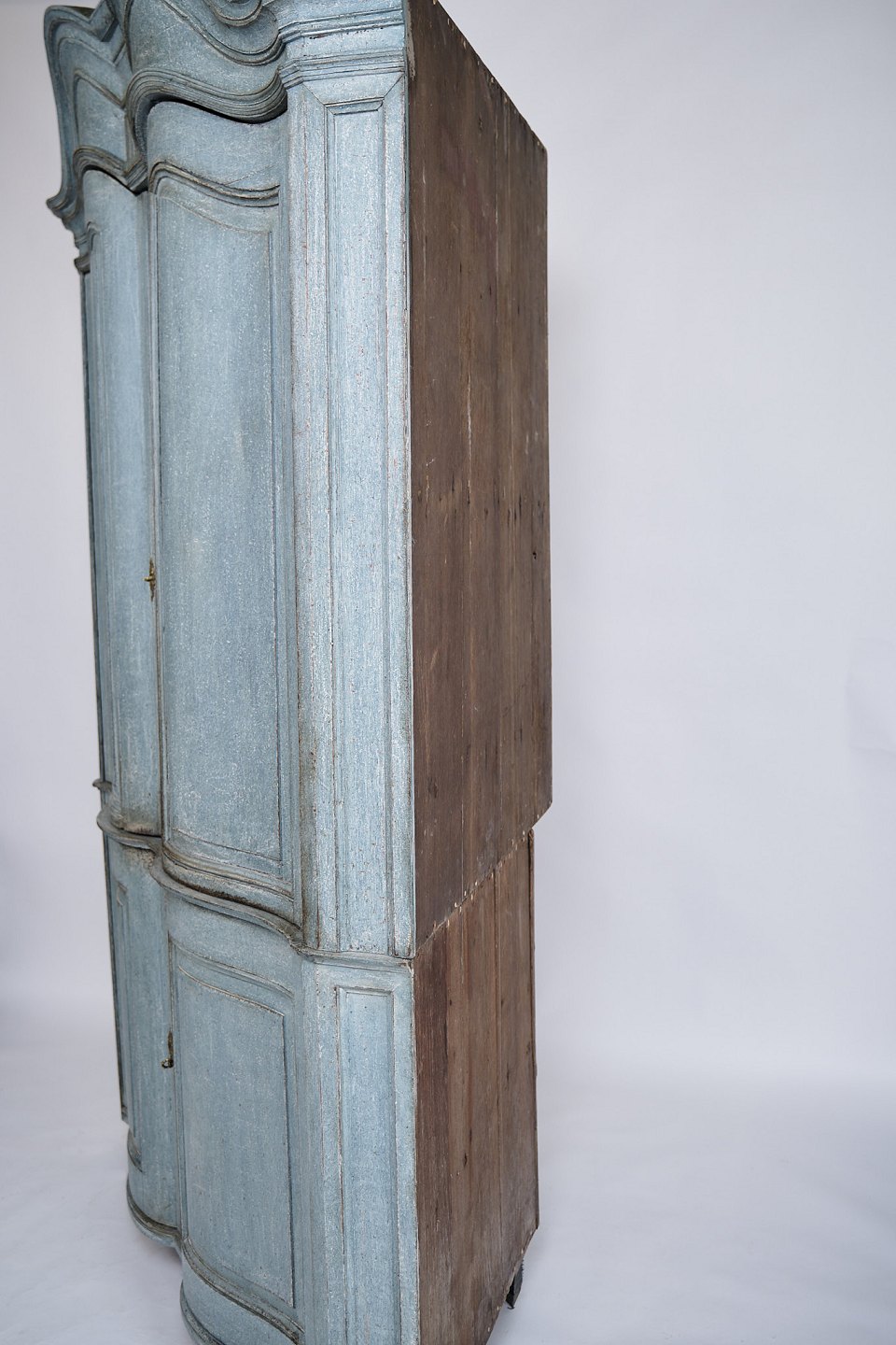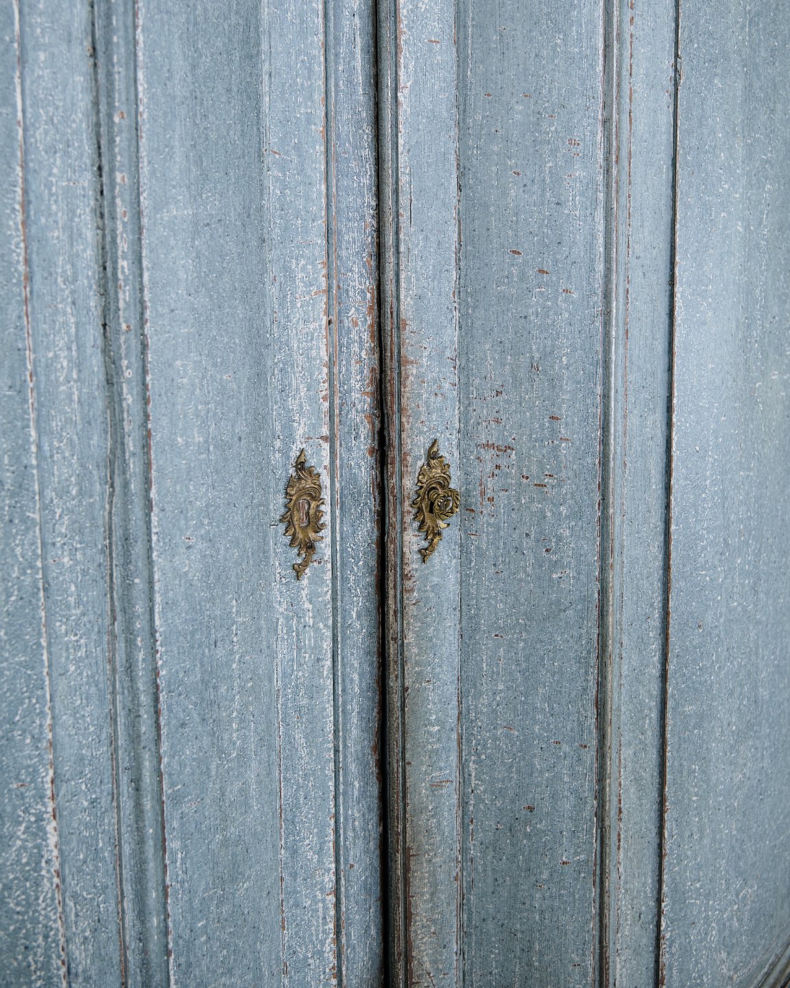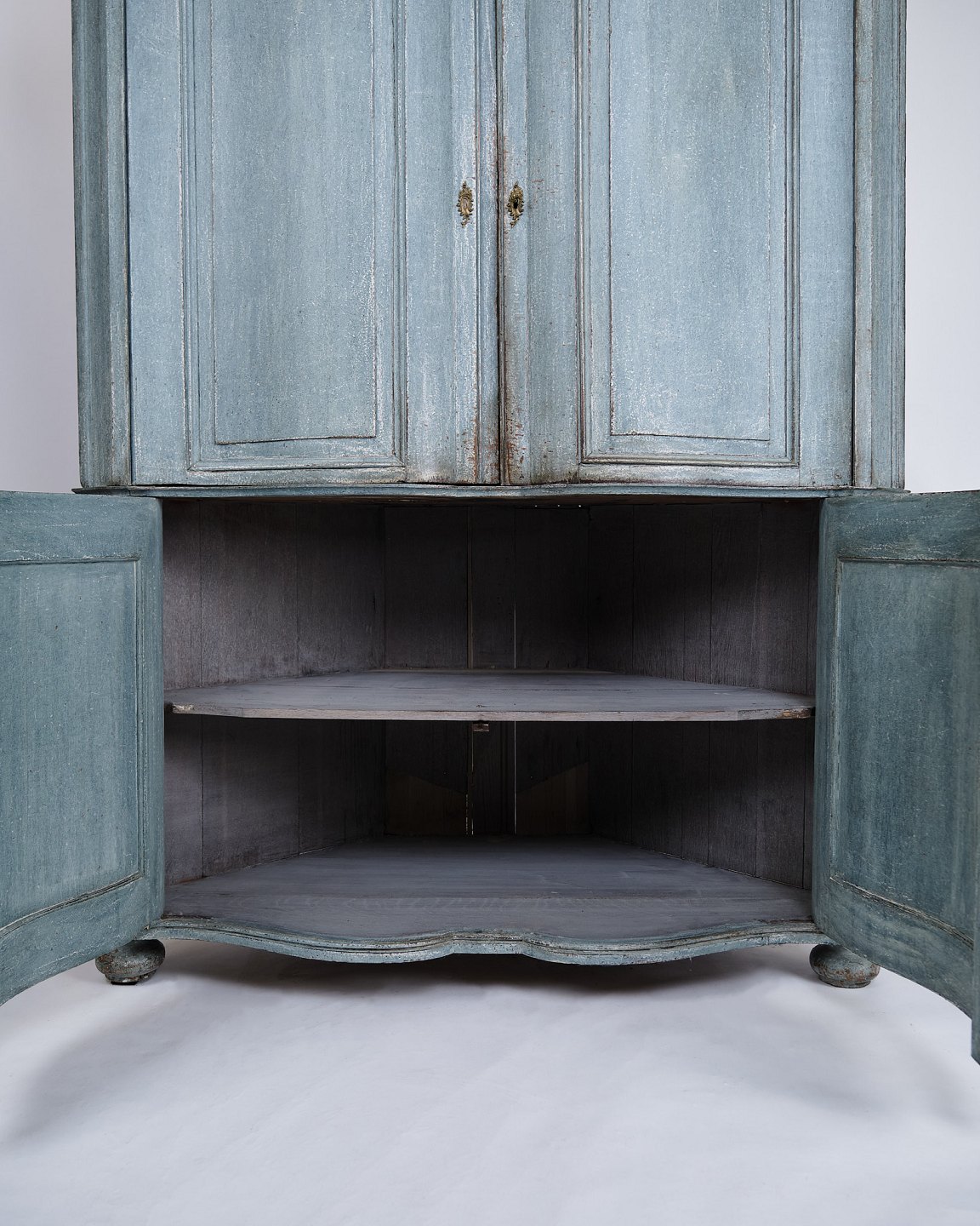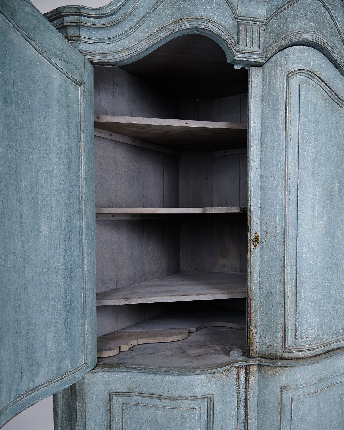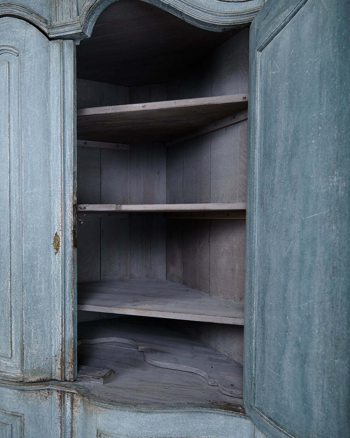 Large baroque corner cabinet from the 1780s. Original blue paint, curved doors and brass fittings. Rare and authentic antique furniture.