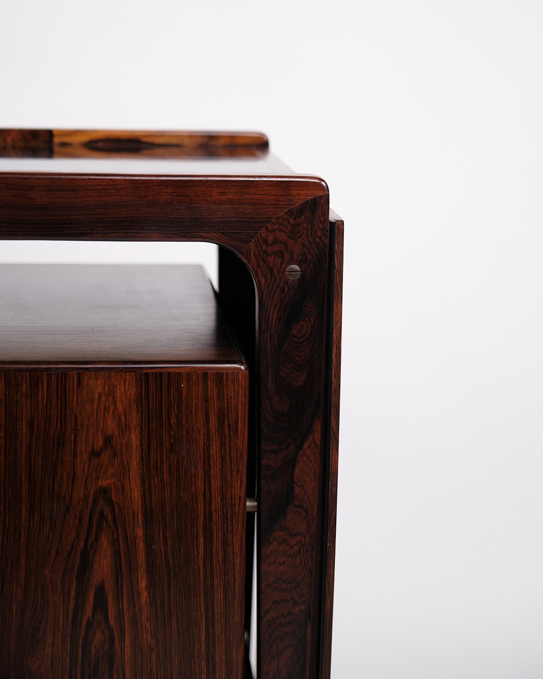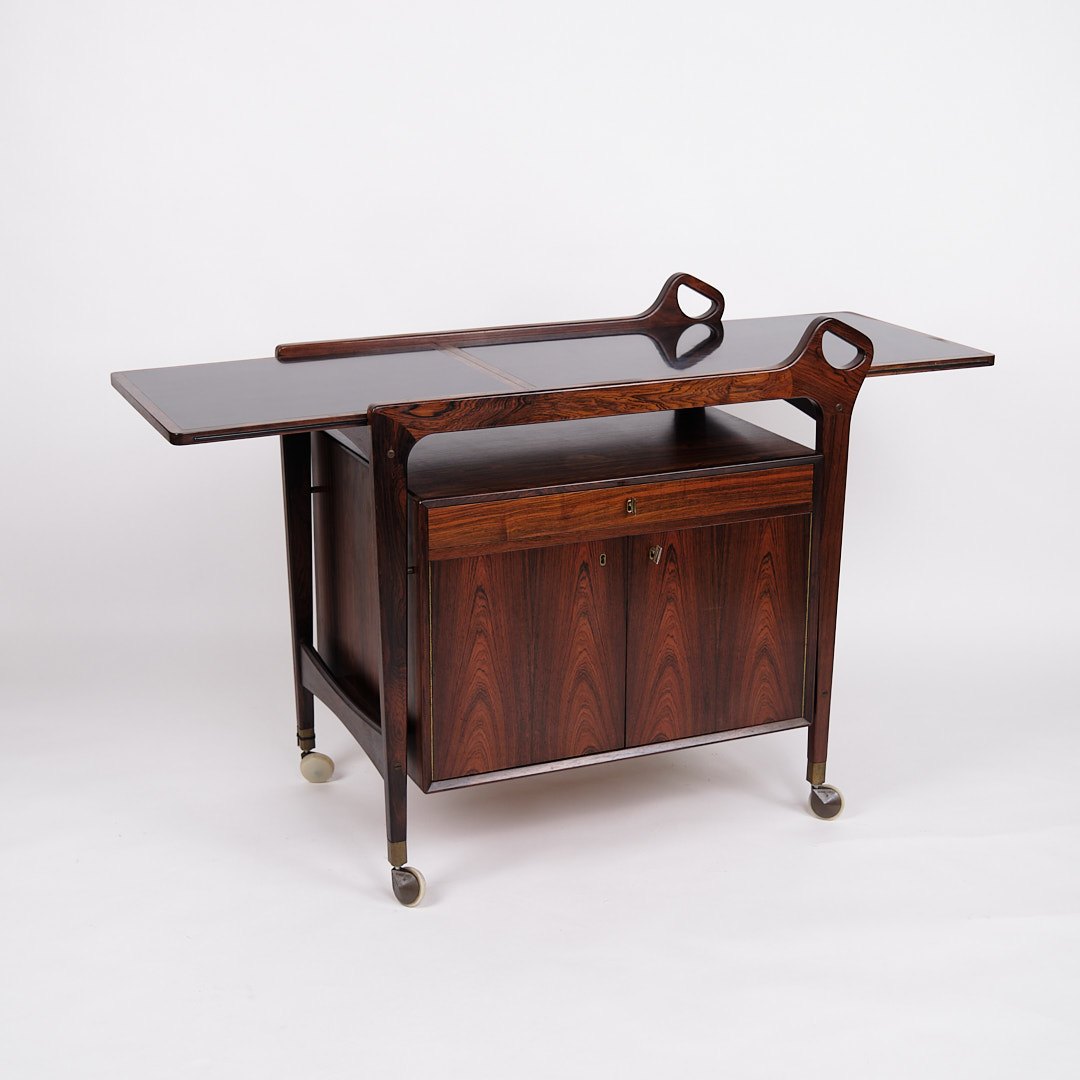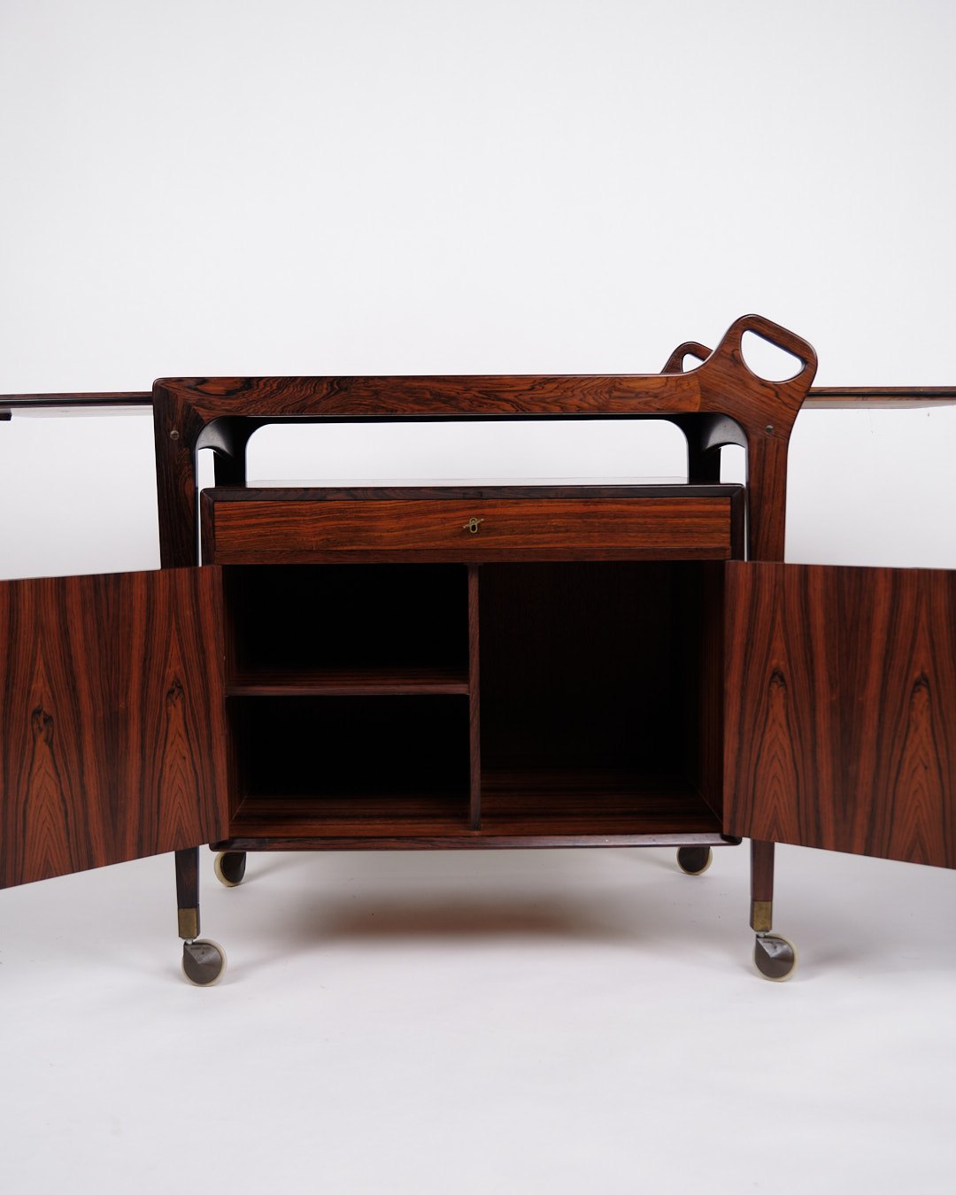 bar cabinet from Dyrlund, made of rosewood with black formica and handles in solid rosewood. The cabinet is mounted on wheels for easy mobility and has a foldable top that can expand the width from 86 cm to 142 cm. The combination of exclusive materials and functional design makes this bar cabinet a classic example of Danish furniture craftsmanship from the 1960s.