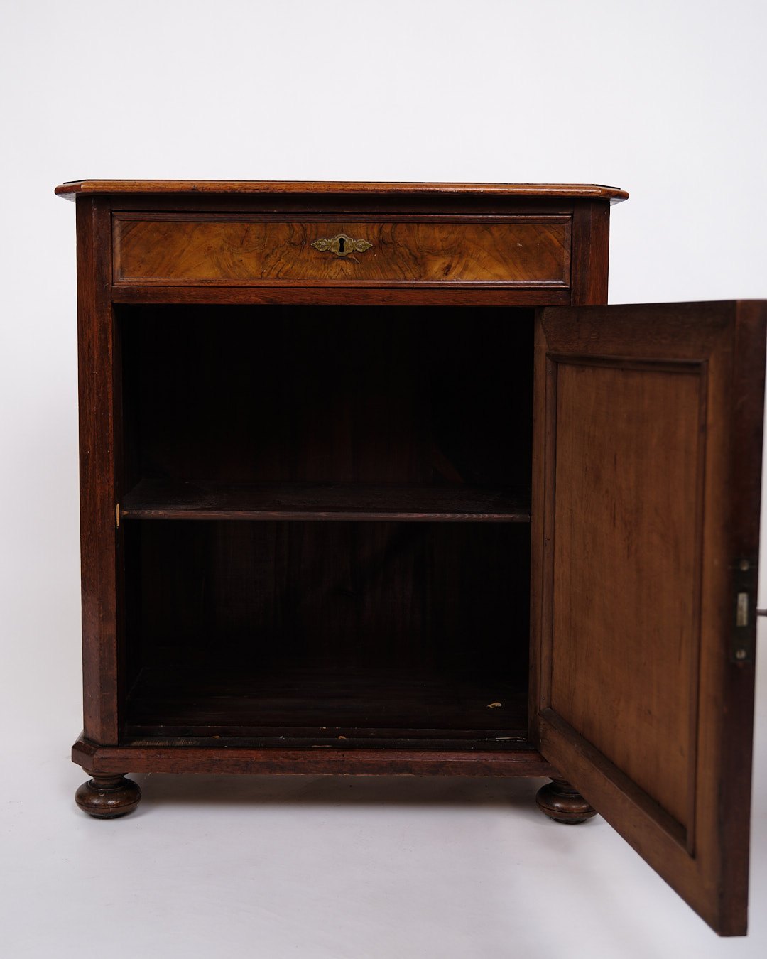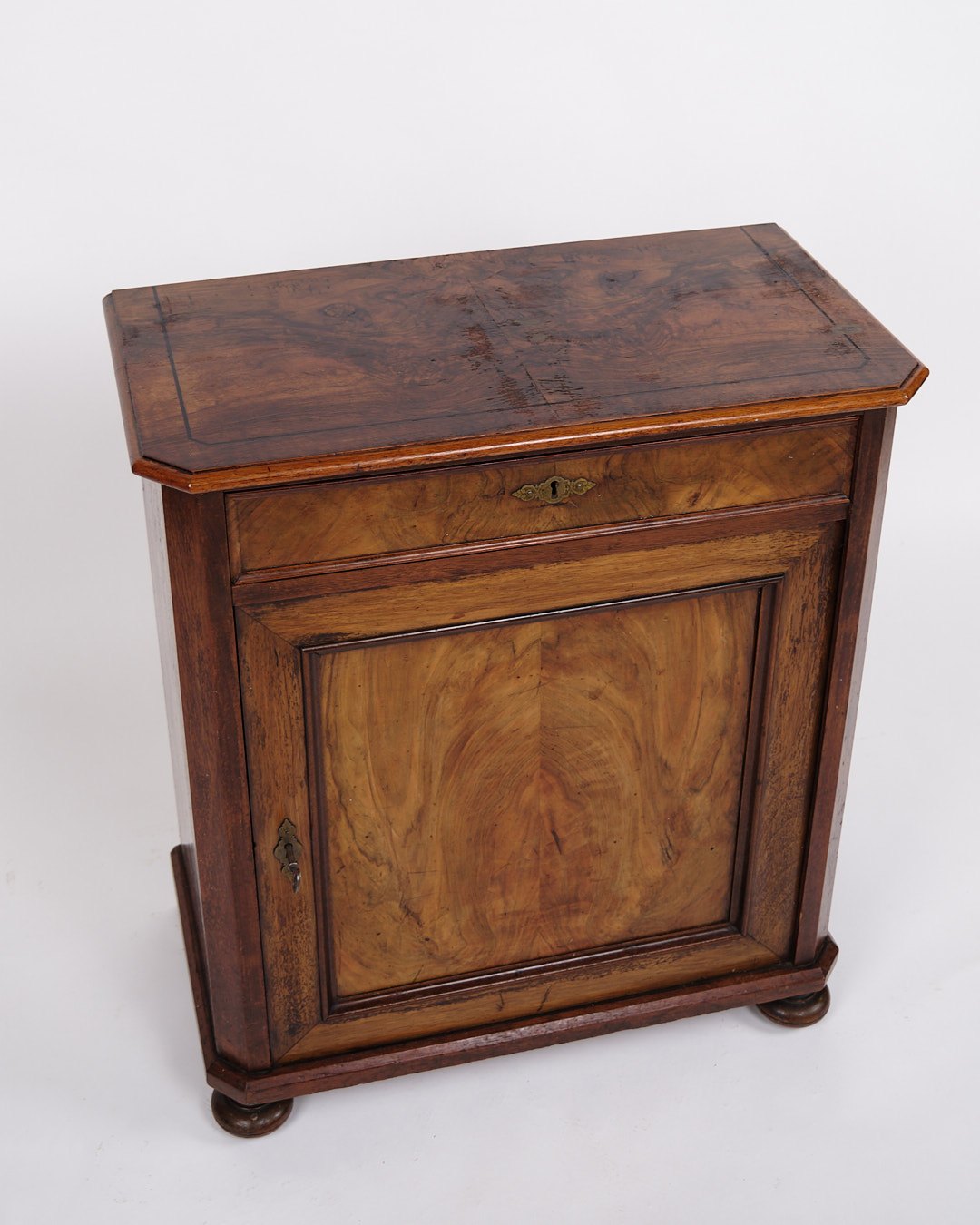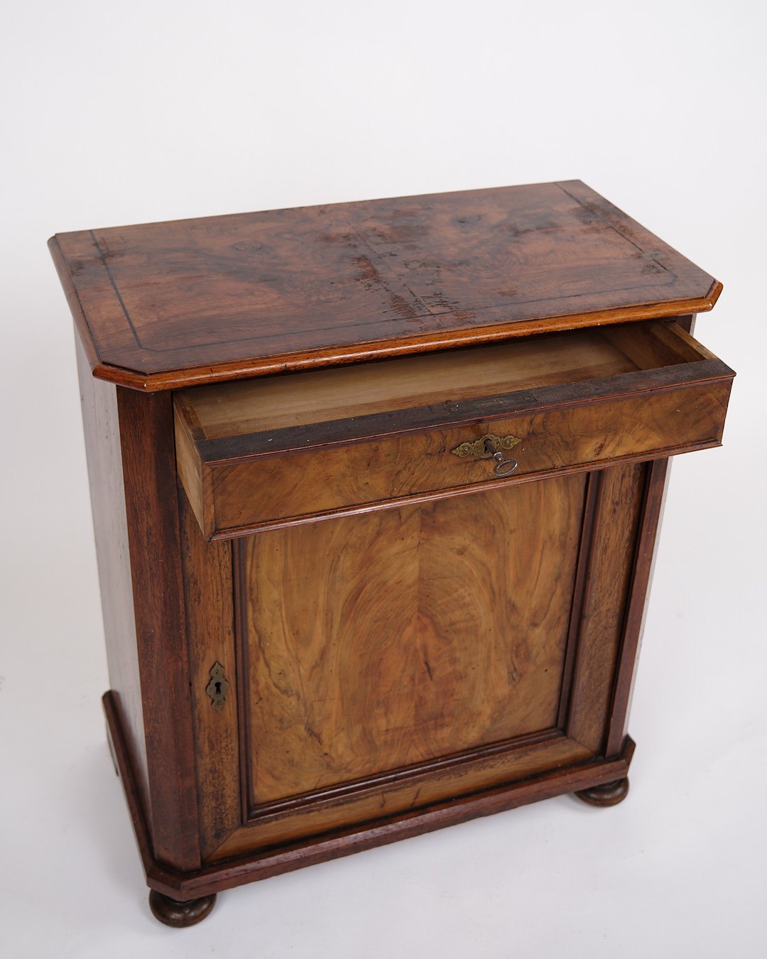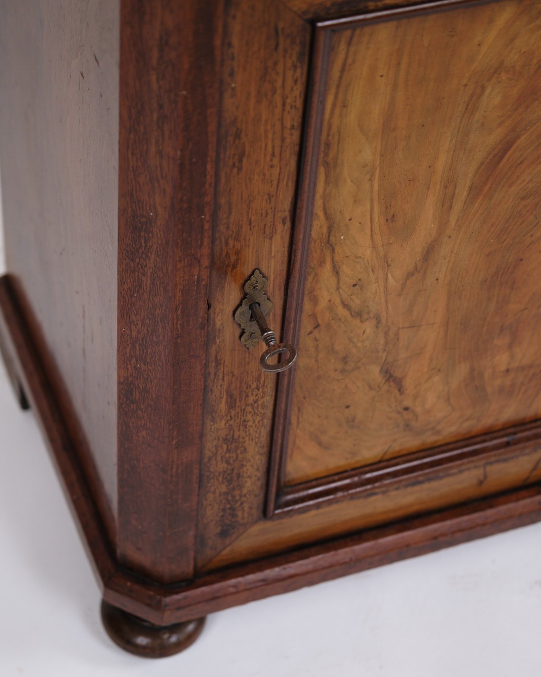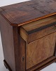 Small antique console/hallway cabinet from the 1880s. Mahogany and walnut with round legs.