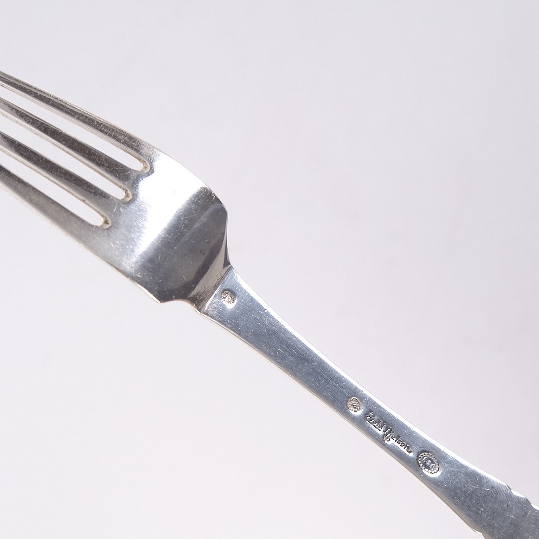 Middagsgaffel i mønster nr. 13 af Evald Nielsen. Tretårnet sølv, stemplet. Klassisk dansk sølvdesign.