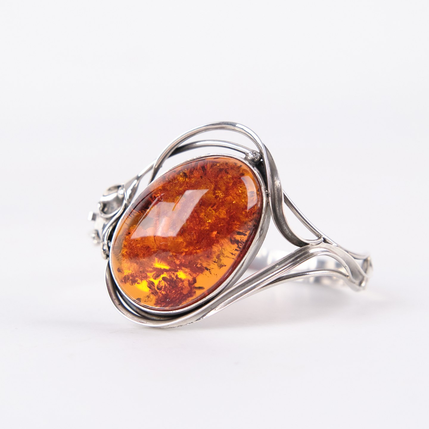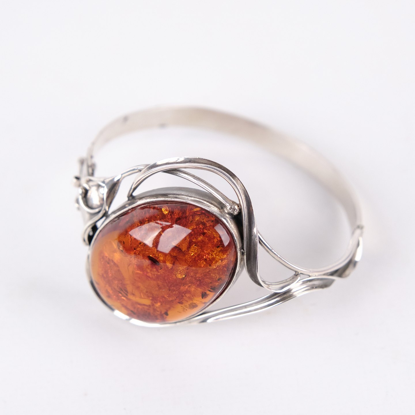 Armreif aus Silber mit Bernstein und Sicherheitsverschluss. Einzigartiges Schmuckdesign mit Bernstein.