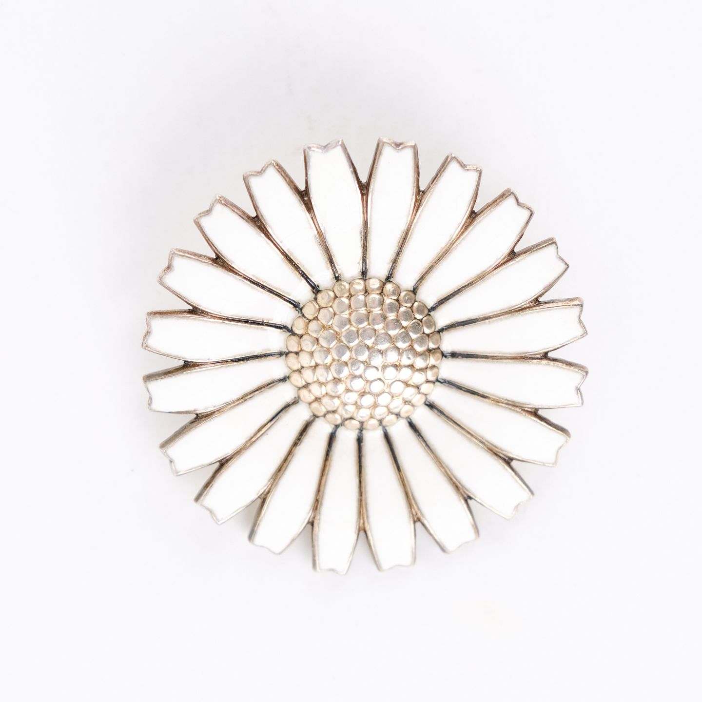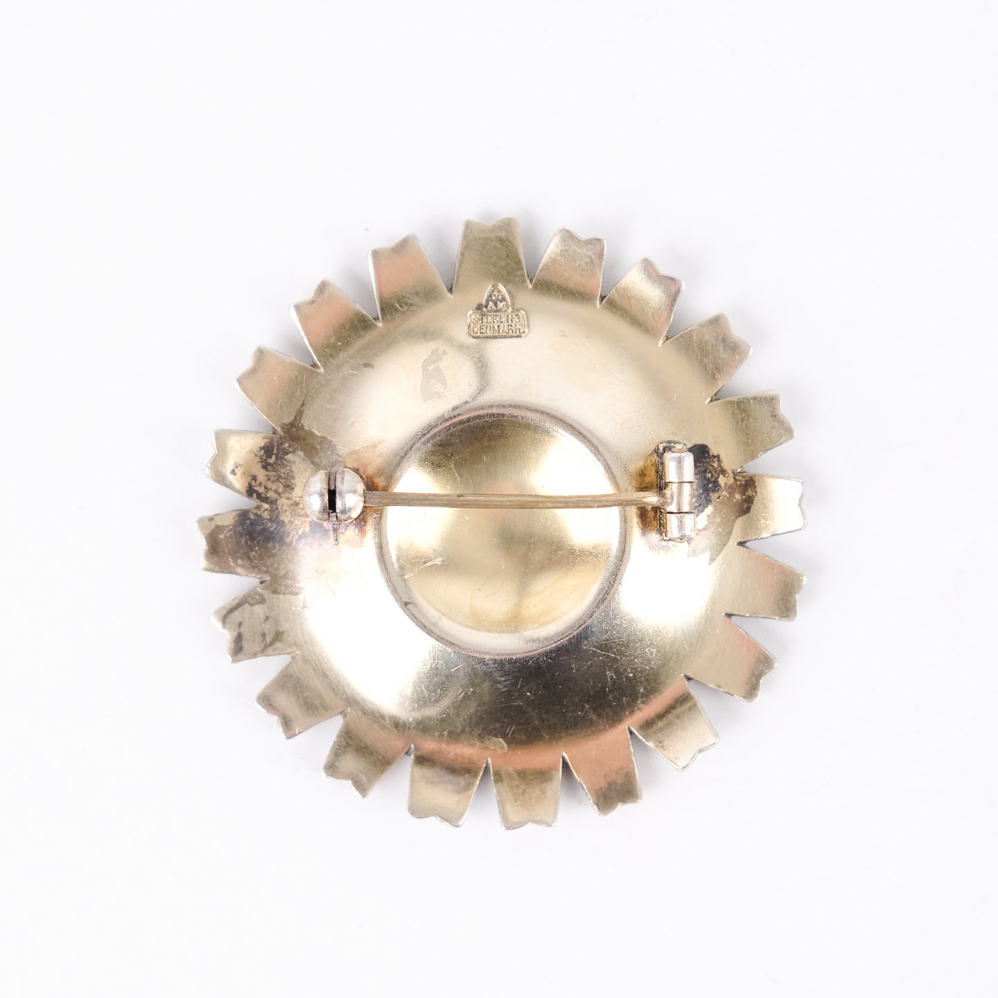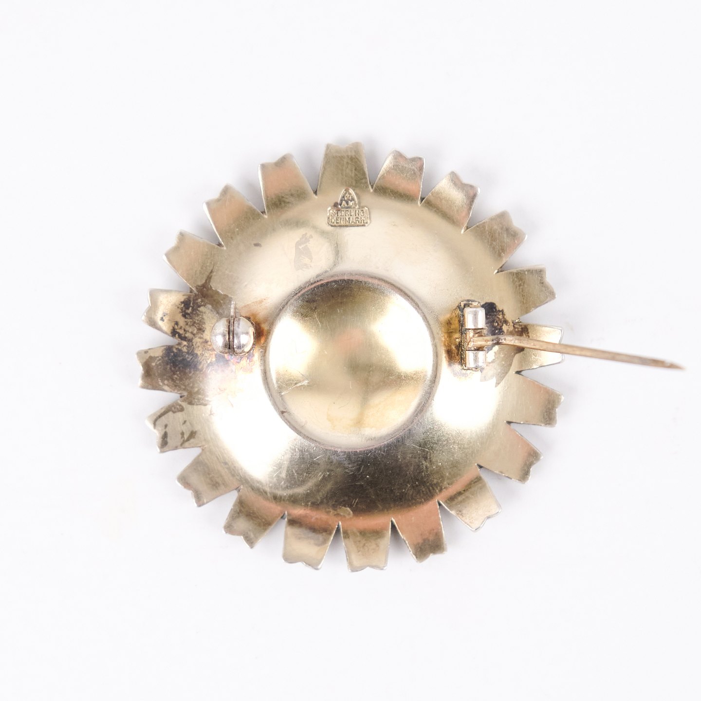 Gilded brooch from the 1940s by Anton Michelsen, stamped AM Sterling Denmark. The enamel is intact, and the piece represents classic Danish jewellery craftsmanship from the period. A decorative and well-preserved brooch by a renowned maker.