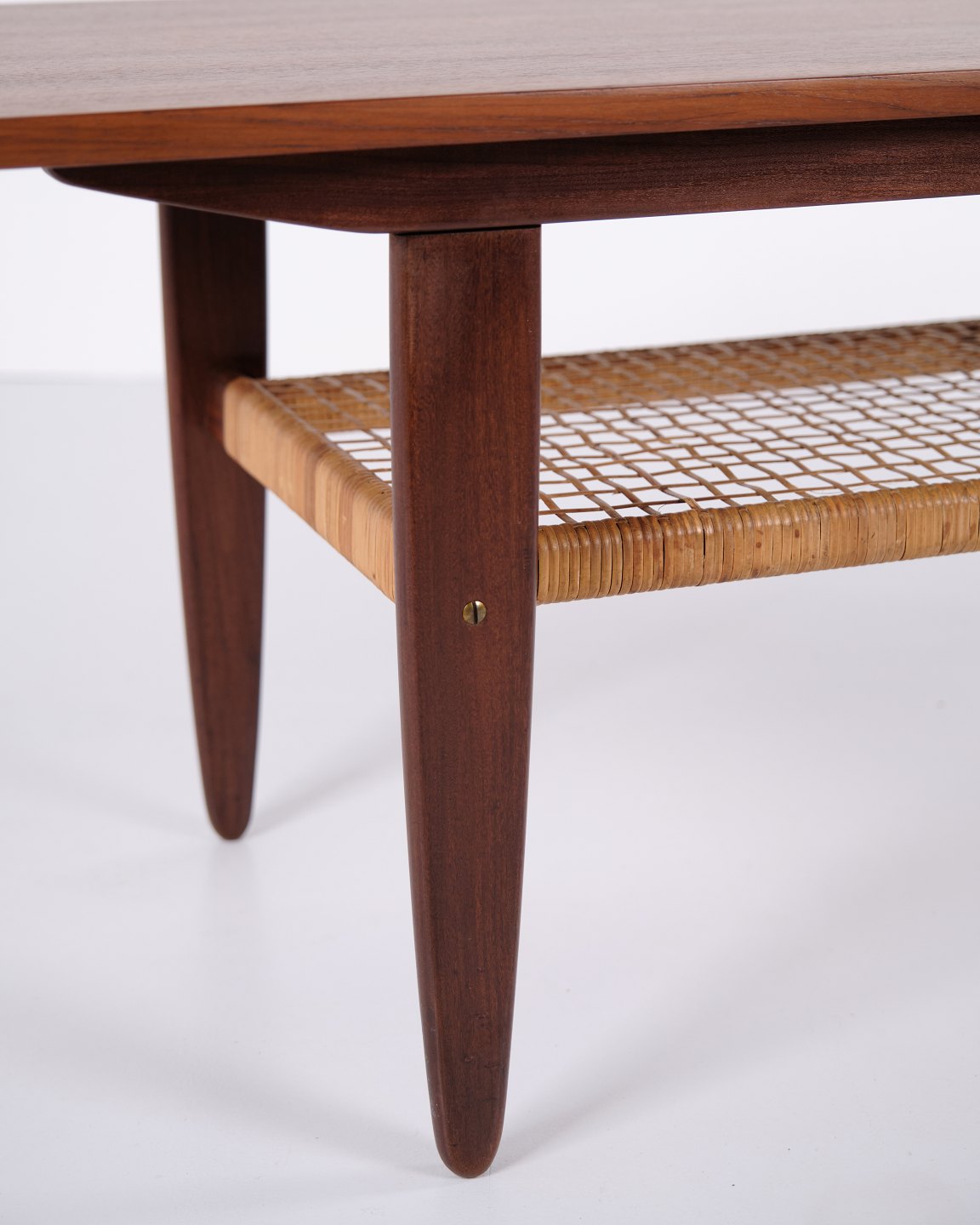 Coffee table made of teak with a shelf made of wicker from the 1960s. Classic Danish design.
