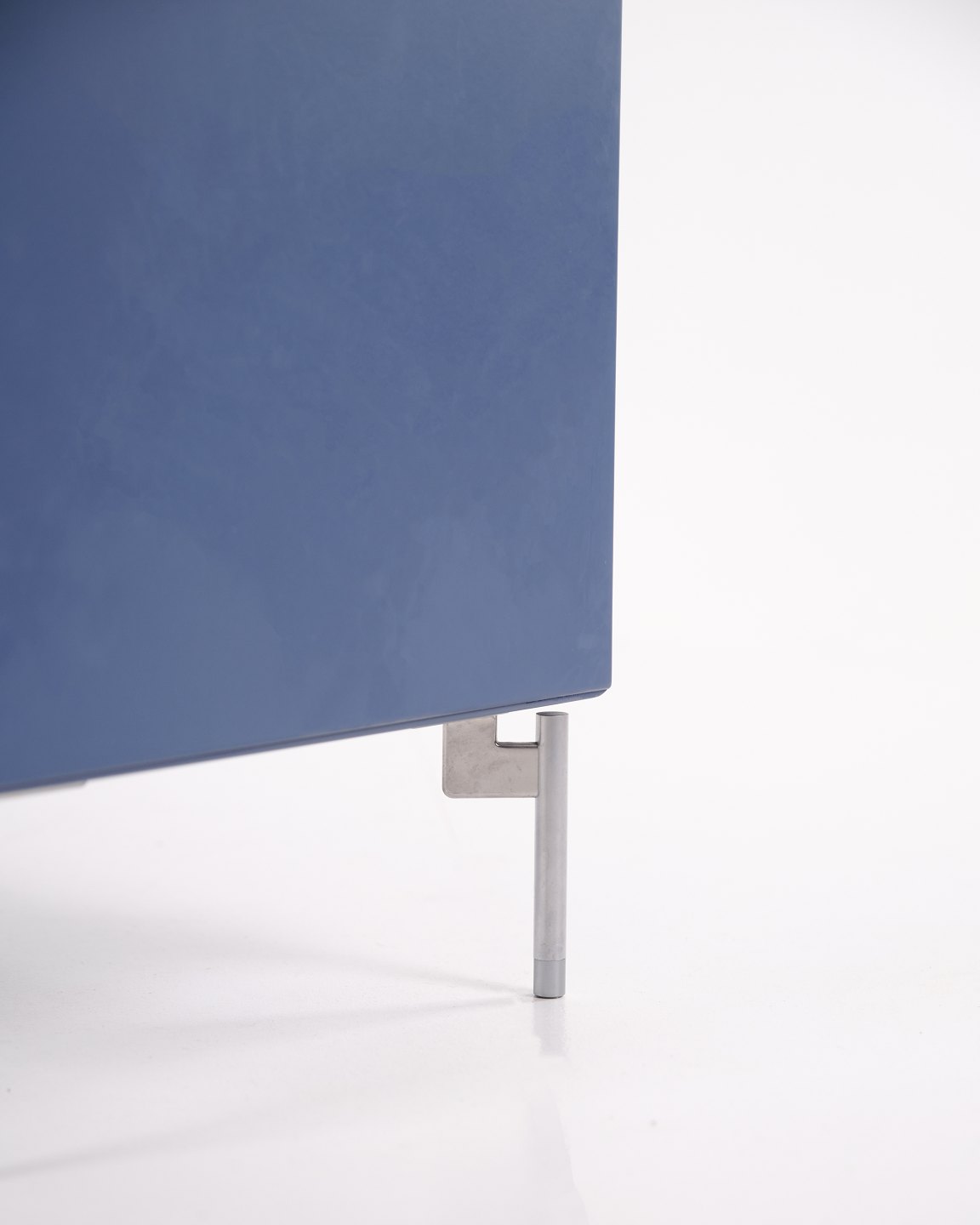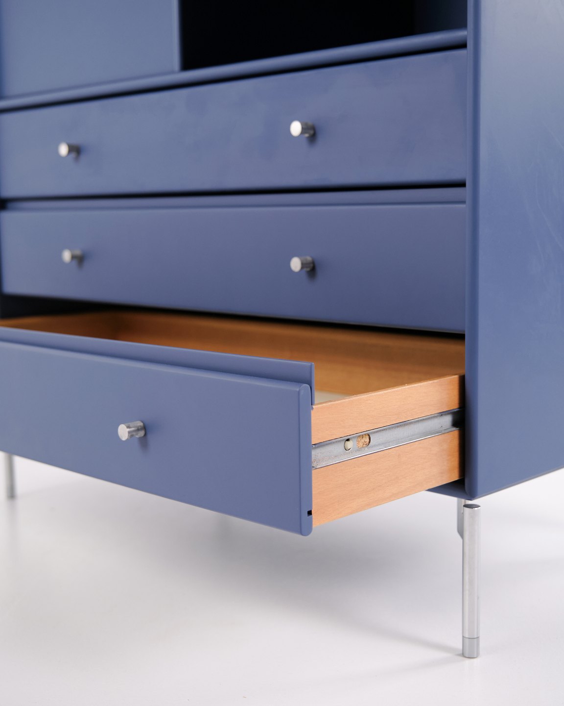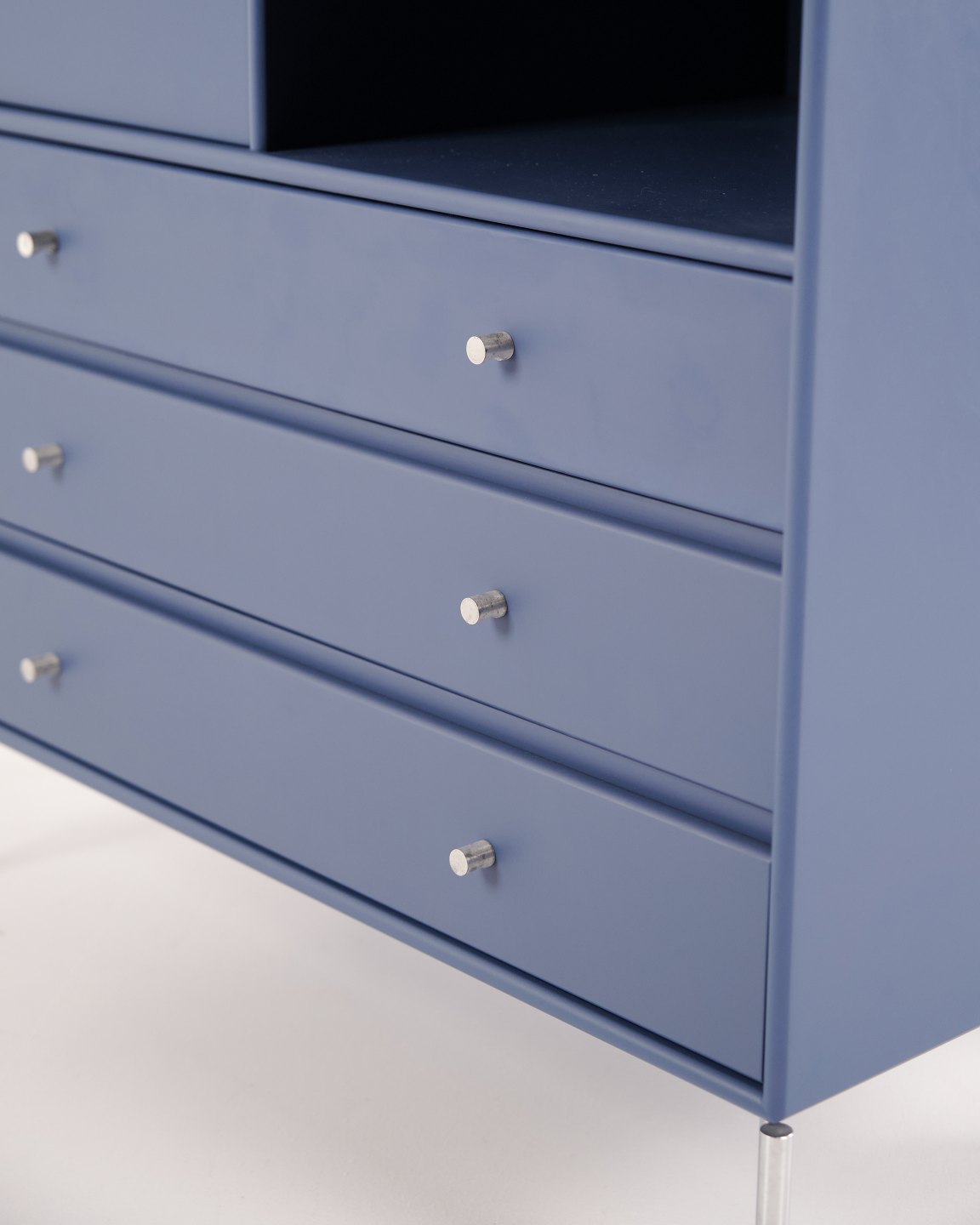 Montana chest of drawers in blue with chrome legs. Designed with three drawers and one door, offering practical and flexible storage. A classic Montana design with clean lines and high functionality.
