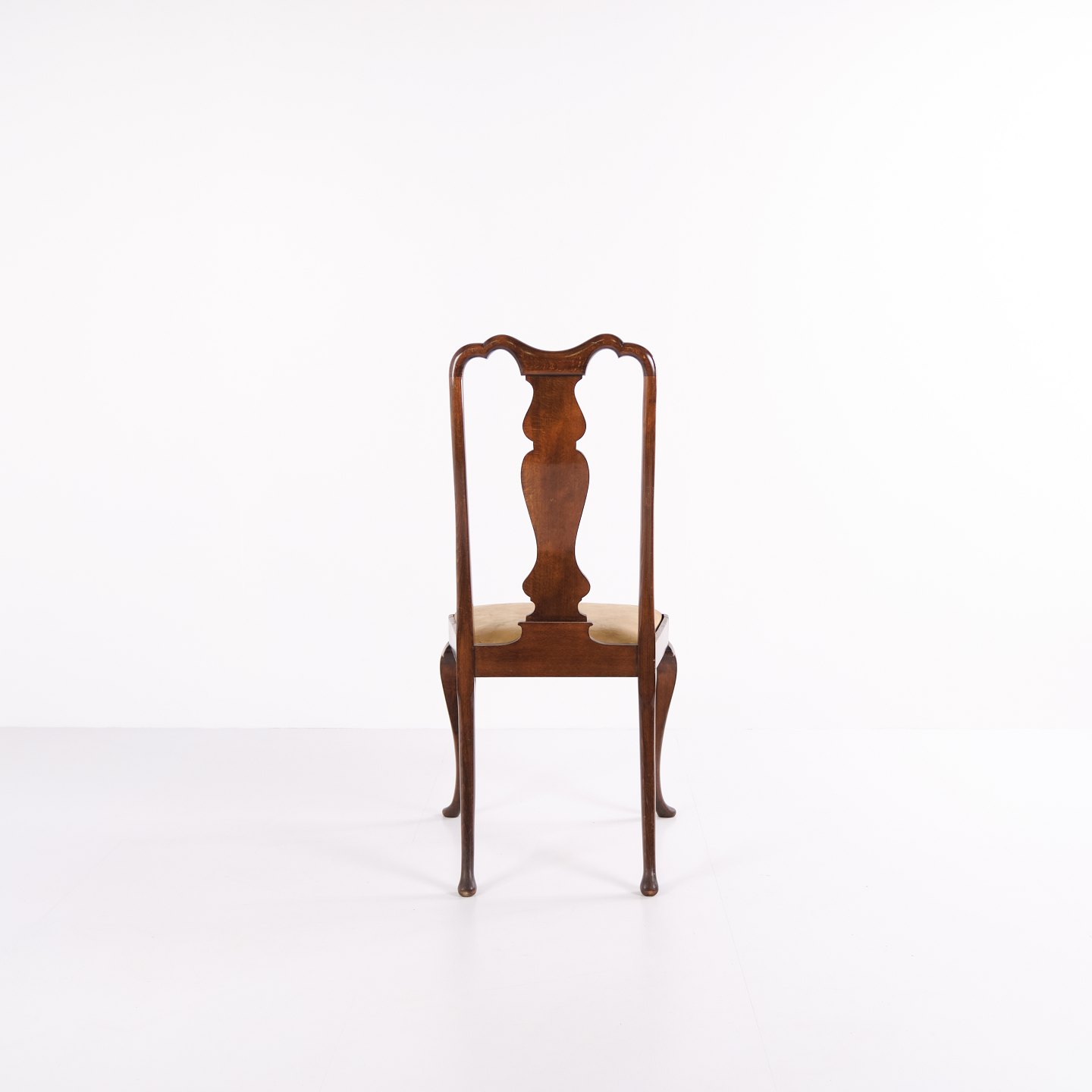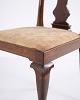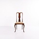 Sæt af tre spisebordsstole i Louis XV stil fra 1900-tallet, udført i mahogni med udskårne detaljer og polstret med blomstret stof. Klassiske og dekorative stole, velegnede til spiseområde eller stue. Solidt håndværk med tidstypisk formsprog.