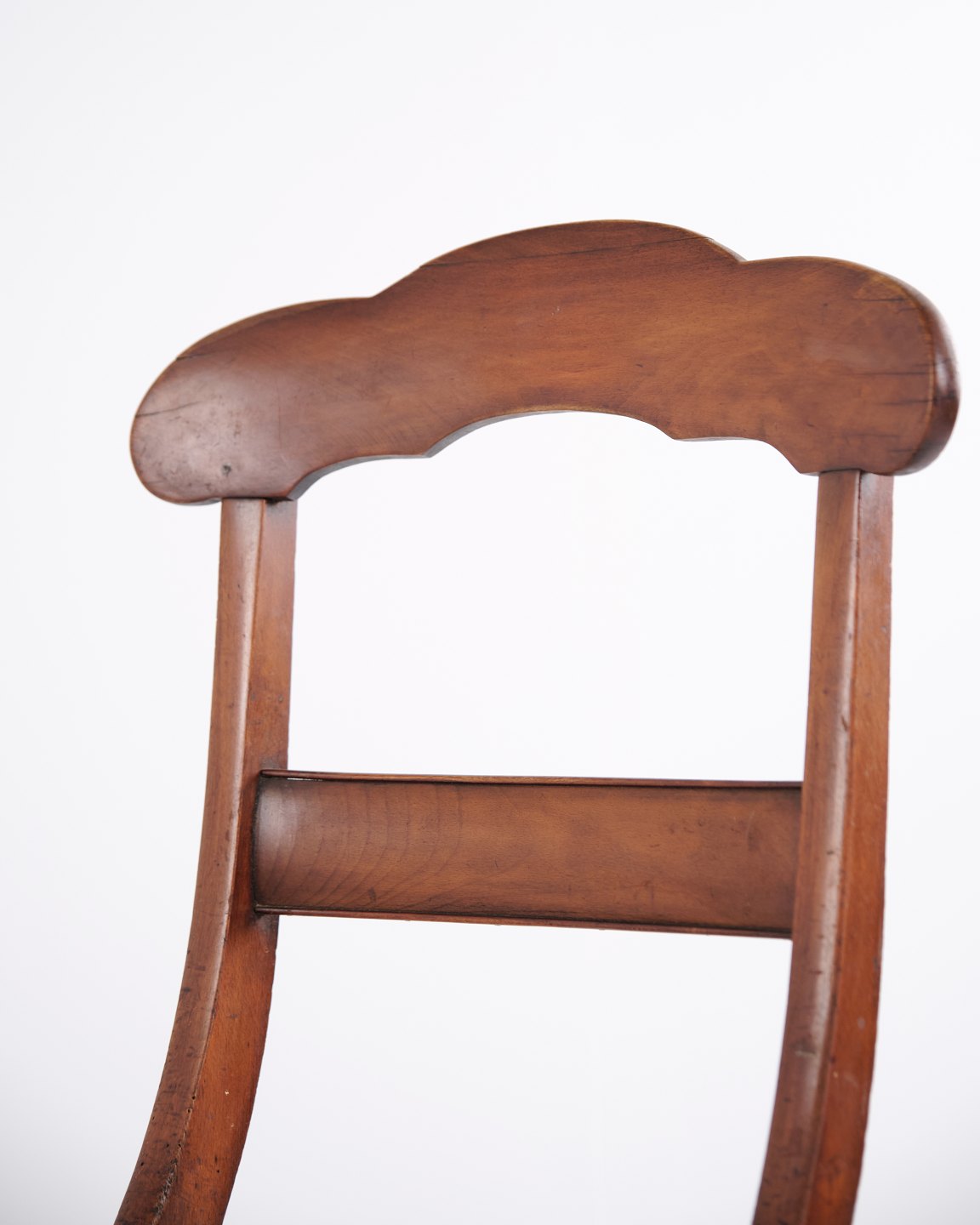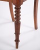 Dining or hall chair in late Empire style, crafted in mahogany and upholstered in floral fabric. Classic design with period-typical lines and a gently curved back. A decorative chair suitable for both dining spaces and hallways.