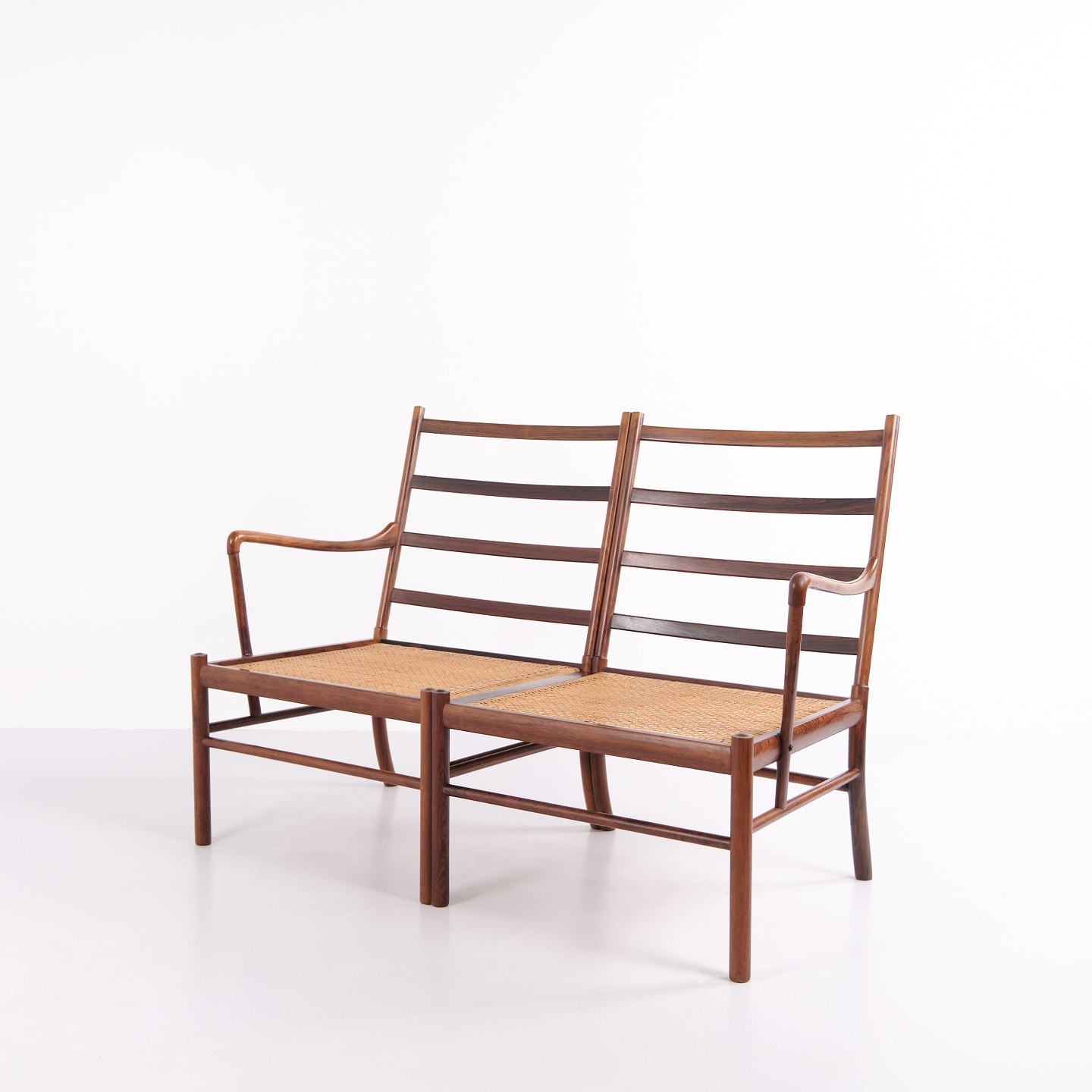Colonial 2-seater sofa, model OW149-2, designed by Ole Wanscher and produced by P. Jeppesen around 1960. Made in rosewood with woven seat and loose cushions. Ole Wanscher was a central figure in Danish furniture design, known for his refined, classic-inspired forms. P. Jeppesen served as his primary manufacturer for decades, executing Wanscher’s designs with exceptional craftsmanship. The Colonial series is among his most iconic works.