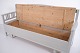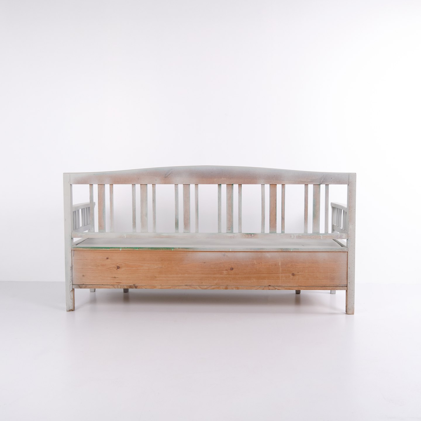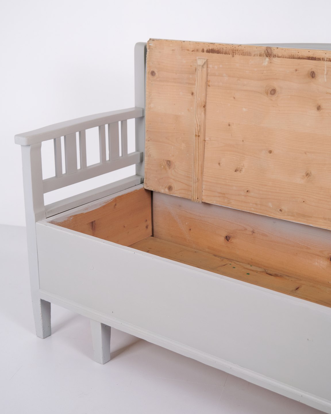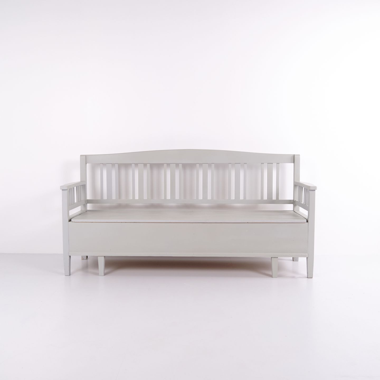 Svensk slagbænk fra ca. 1860’erne, udført i fyrretræ og gråmalet i senere tid. Klassisk skandinavisk møbel med dekorative bemalinger og god opbevaringsplads under sædet. Velbevaret antikt møbel med tidstypiske detaljer.