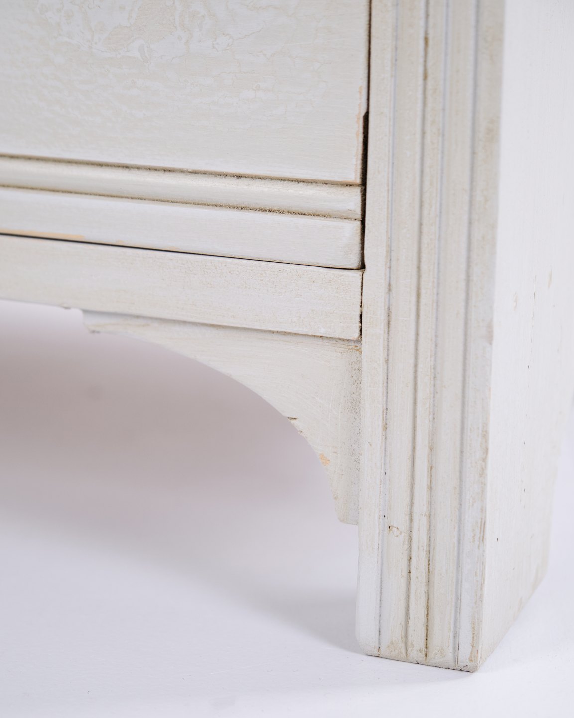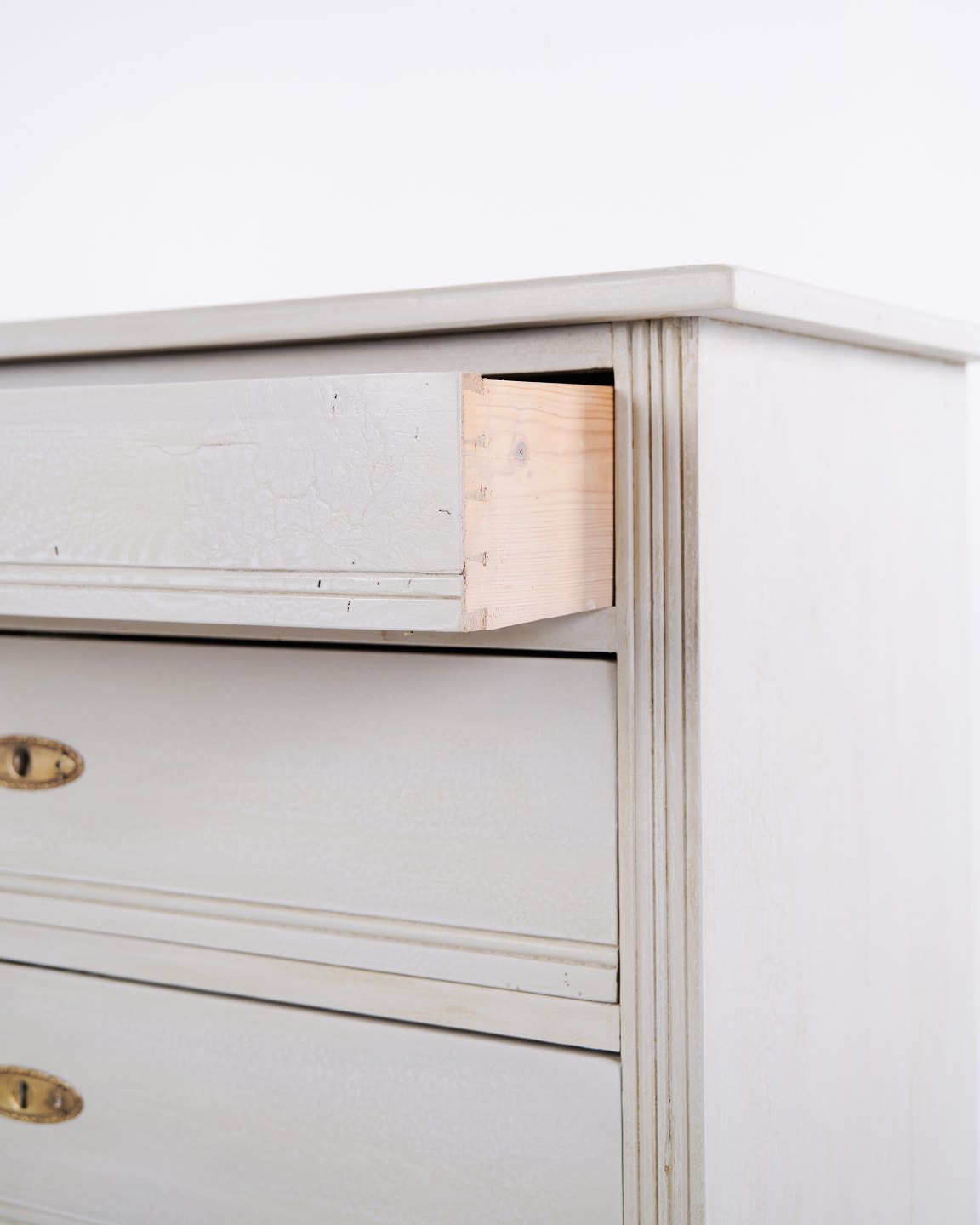 Antike Kommode aus den 1890er-Jahren mit vier Schubladen. Grau gestrichenes Holz und klassisches Formensprach mit schöner Patina.