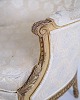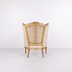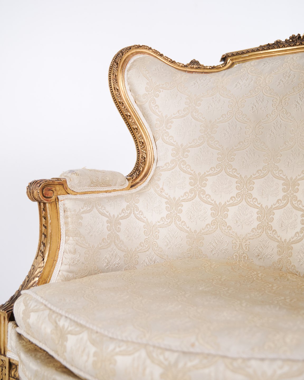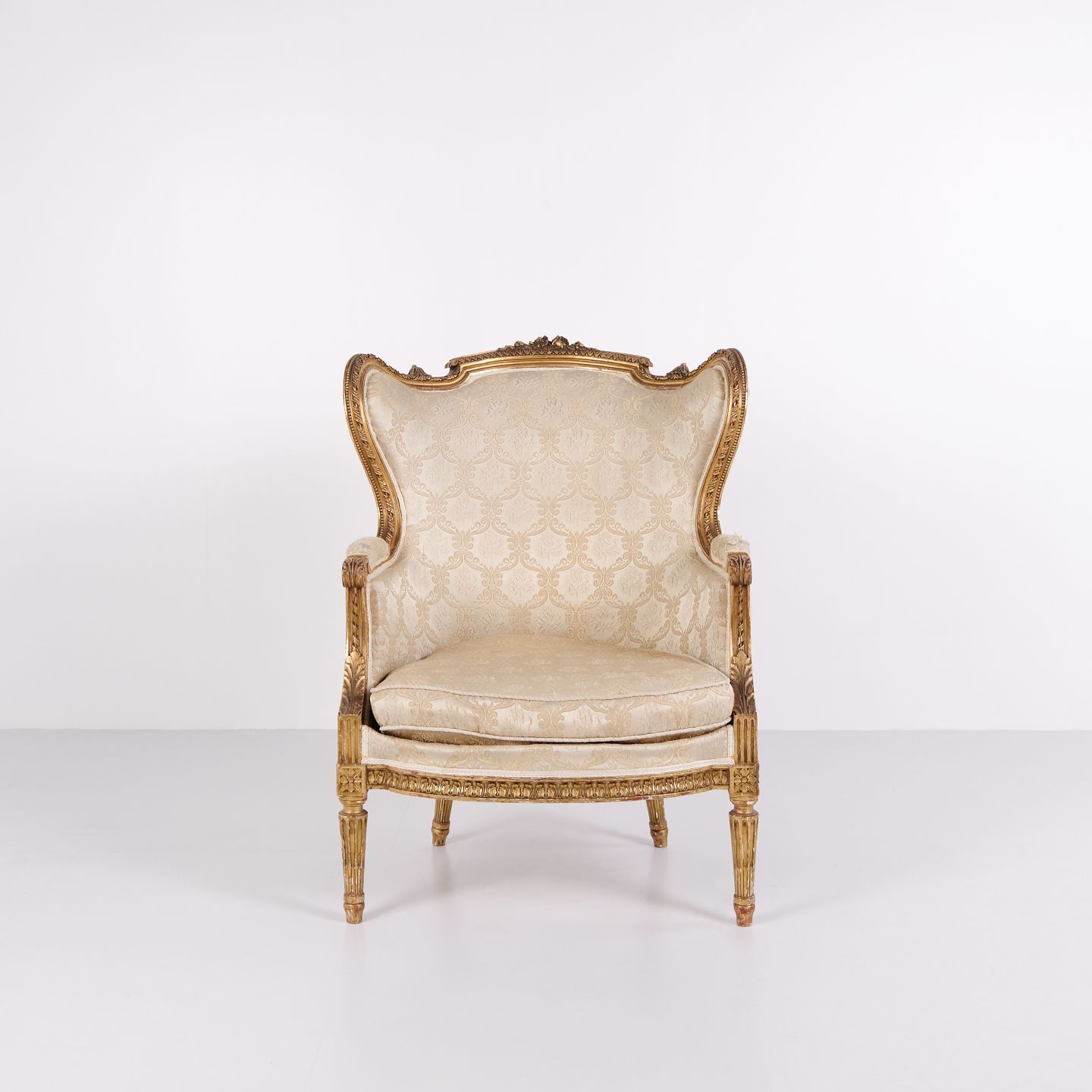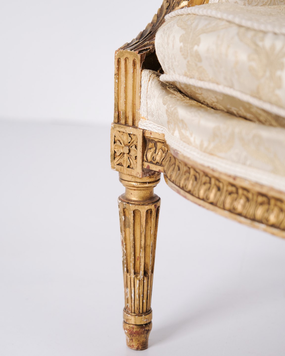 Antiker Bergère Sessel aus den 1860er Jahren im Louis XVI Stil. Vergoldetes Holz und heller Polsterstoff.