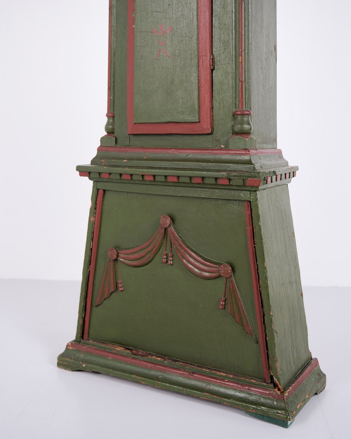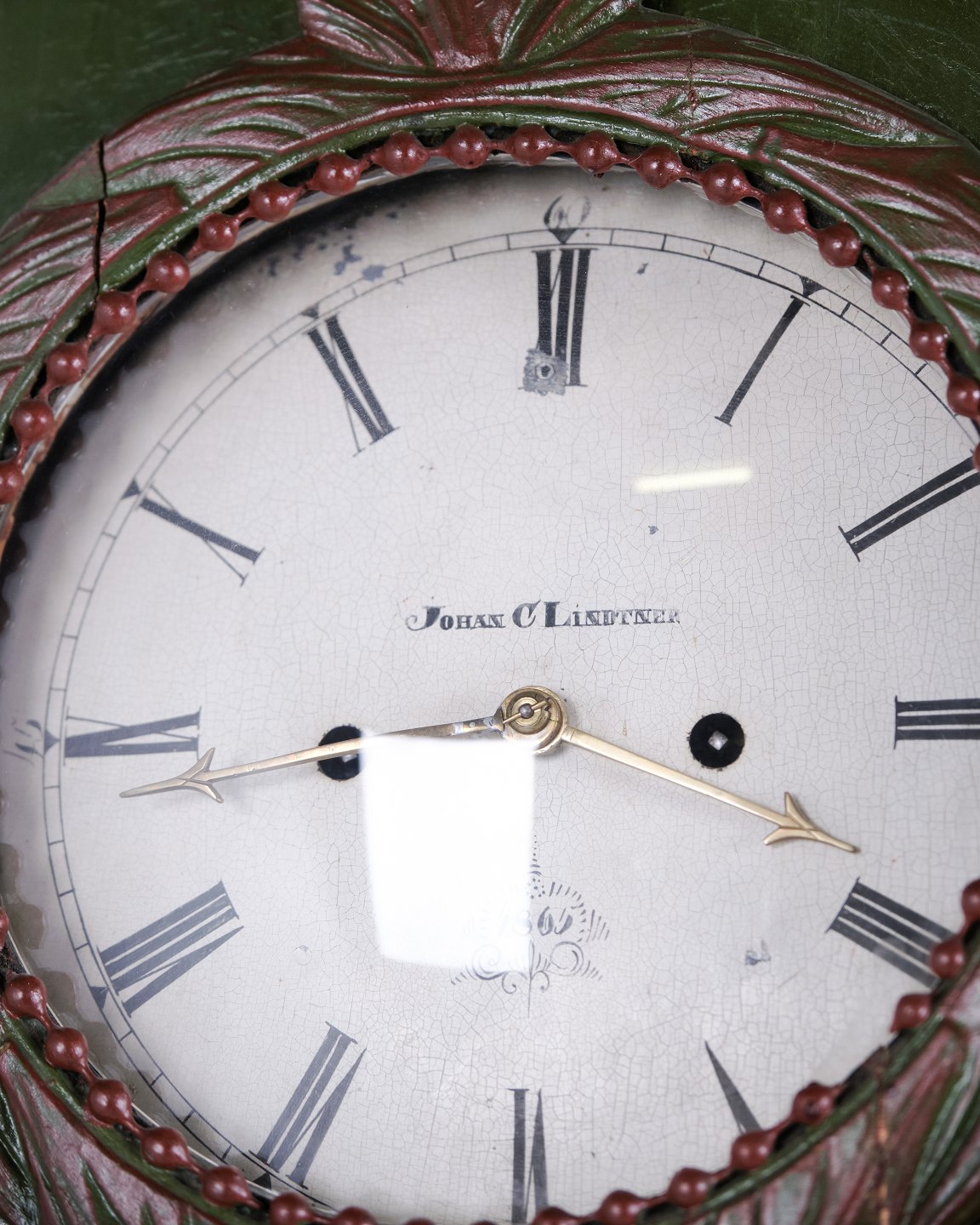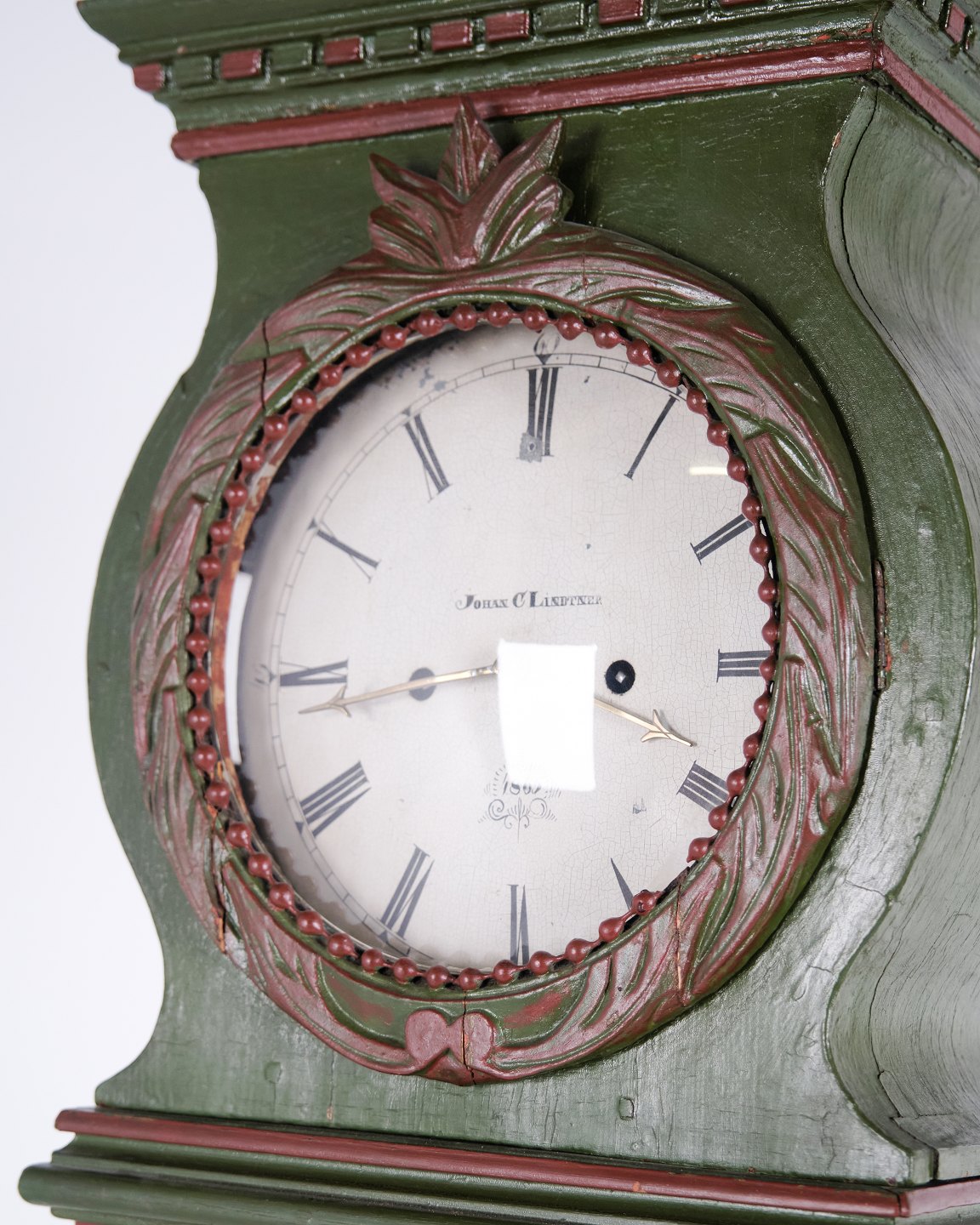 Bornholmeruhr “Frøken”-Modell aus den 1860er Jahren, handbemalt mit geschnitzten Details in grüner/roter Bemalung. Antike Bornholmer Uhr aus dem 19. Jahrhundert.