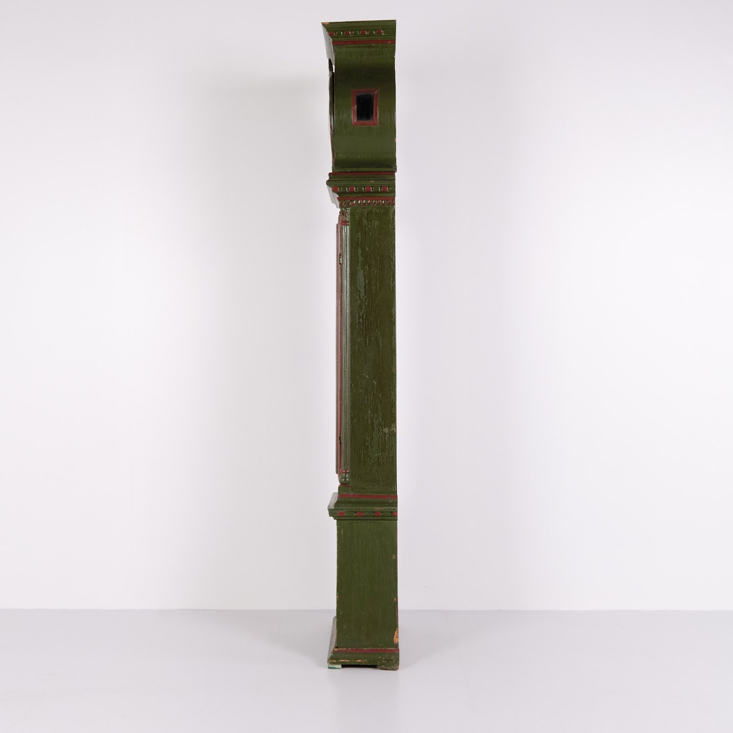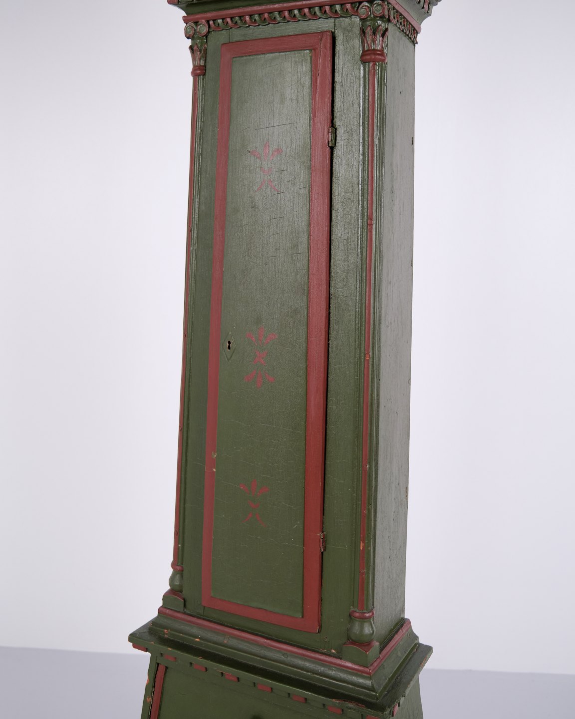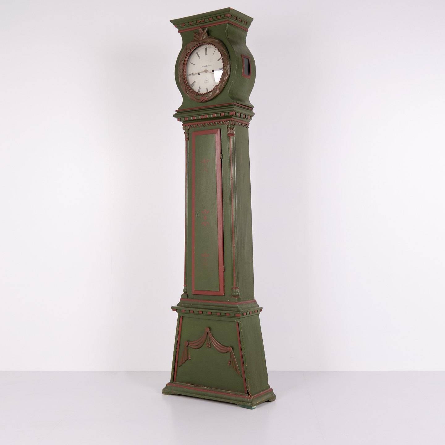 Bornholmeruhr “Frøken”-Modell aus den 1860er Jahren, handbemalt mit geschnitzten Details in grüner/roter Bemalung. Antike Bornholmer Uhr aus dem 19. Jahrhundert.