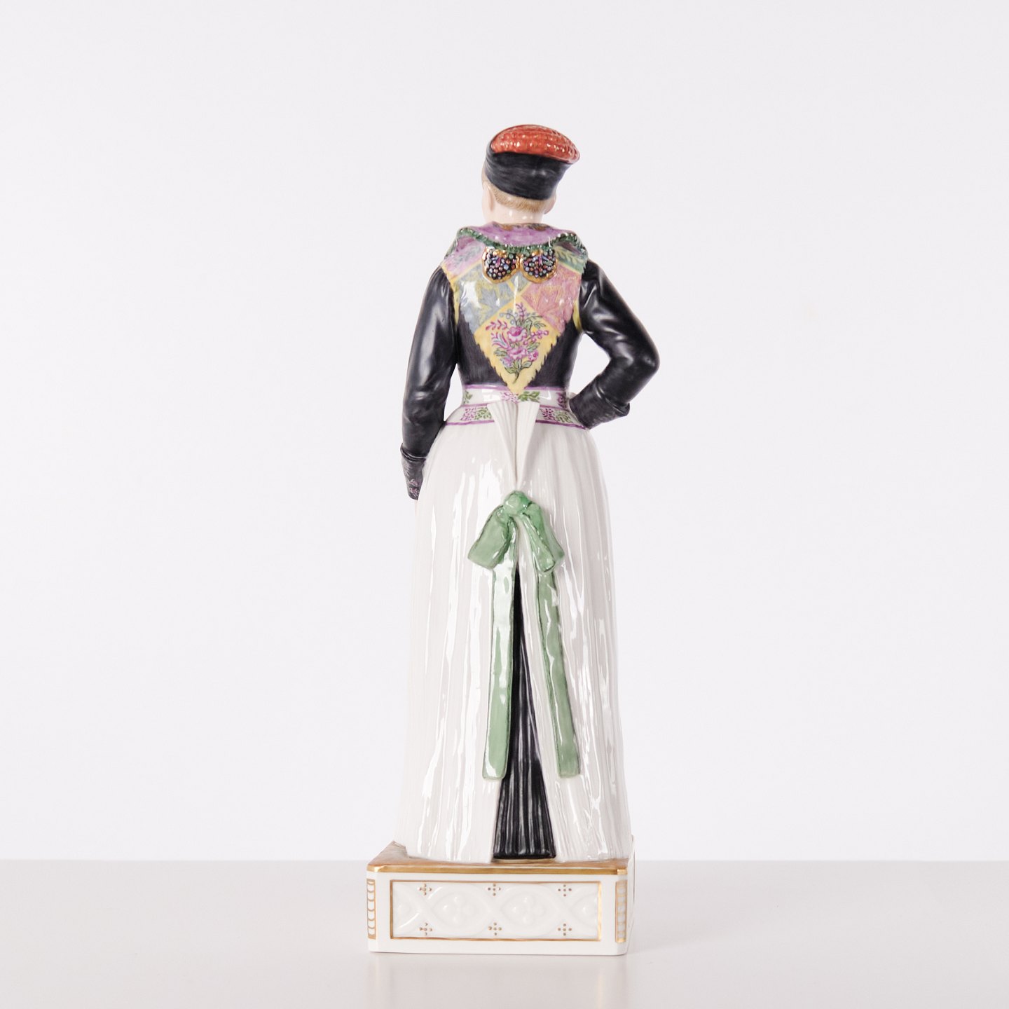 Überglasur-Porzellanfigur in dänischer Nationaltracht, Modell 12104, mit Darstellung einer Kochtracht aus Amager. Entworfen von Carl Martin-Hansen (1877–1941) für Royal Copenhagen und Teil der Serie Dänische Nationaltrachten.