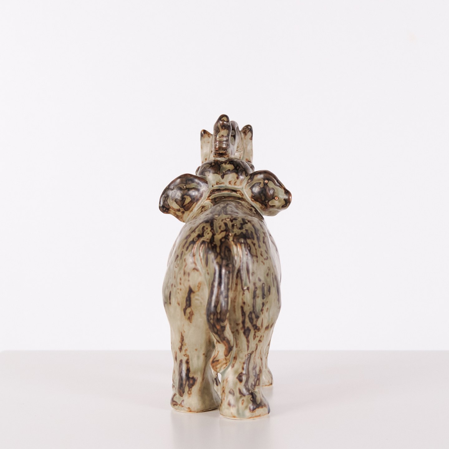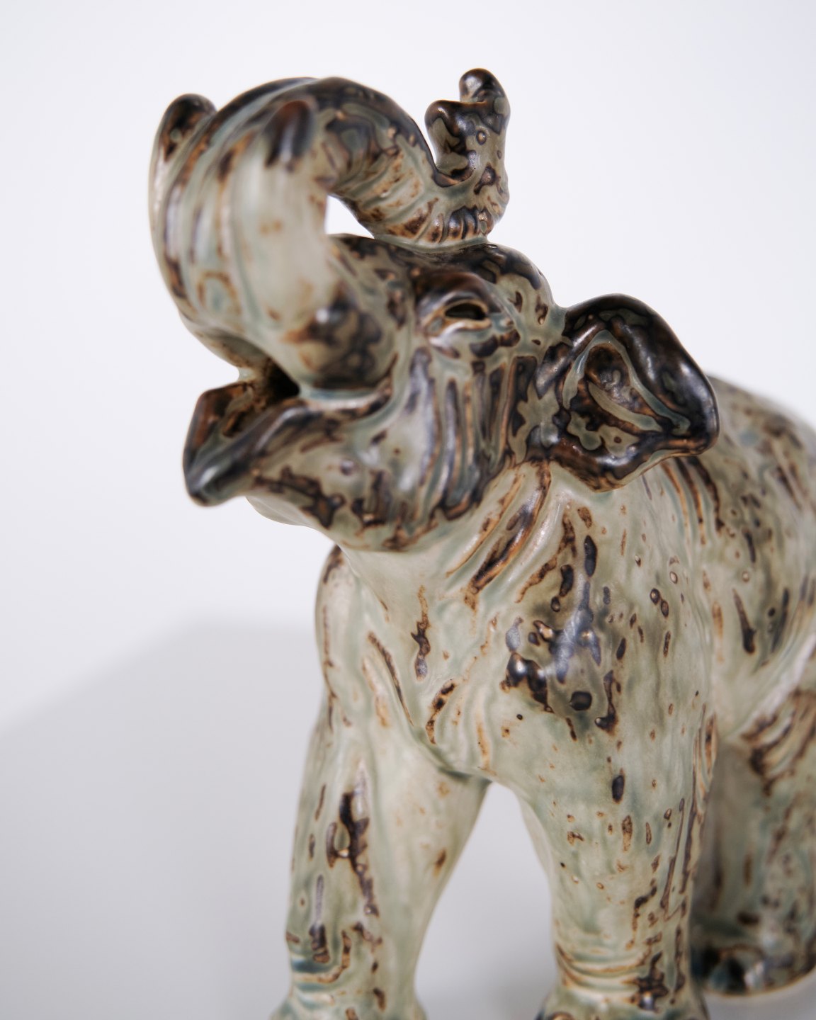 Steinzeugfigur in Form eines stehenden Elefanten, Modell 21517, entworfen von Knud Kyhn für Royal Copenhagen. Die Figur wurde aus Steinzeug gefertigt und gehört zu Knud Kyhns bekannten Tierdarstellungen, die bei Royal Copenhagen vor allem ab den 1930er-Jahren produziert wurden. Kyhns Arbeiten sind für ihre klare Formgebung und materialbetonte Ausführung bekannt und werden von Sammlern dänischer Keramik geschätzt.