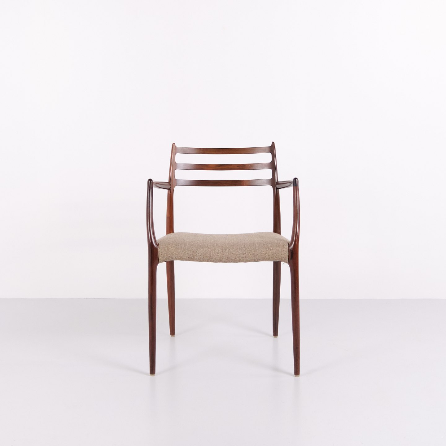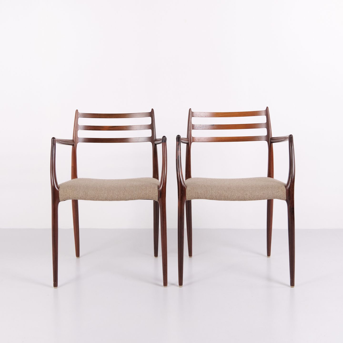 Armlehnstühle, Modell 62, entworfen im Jahr 1962. Aus Palisander gefertigt und bekannt für präzise Schreinerarbeit und ergonomische Konstruktion. Modell 62 zählt zu den bekanntesten Stuhlentwürfen von Niels Otto Møller und steht für dänisches Möbeldesign der frühen 1960er-Jahre.