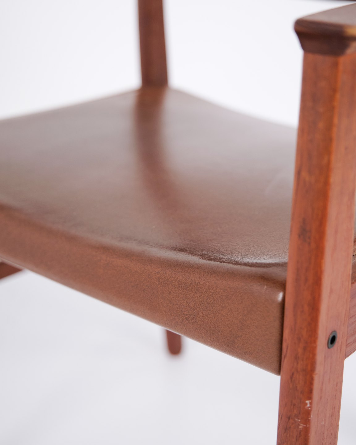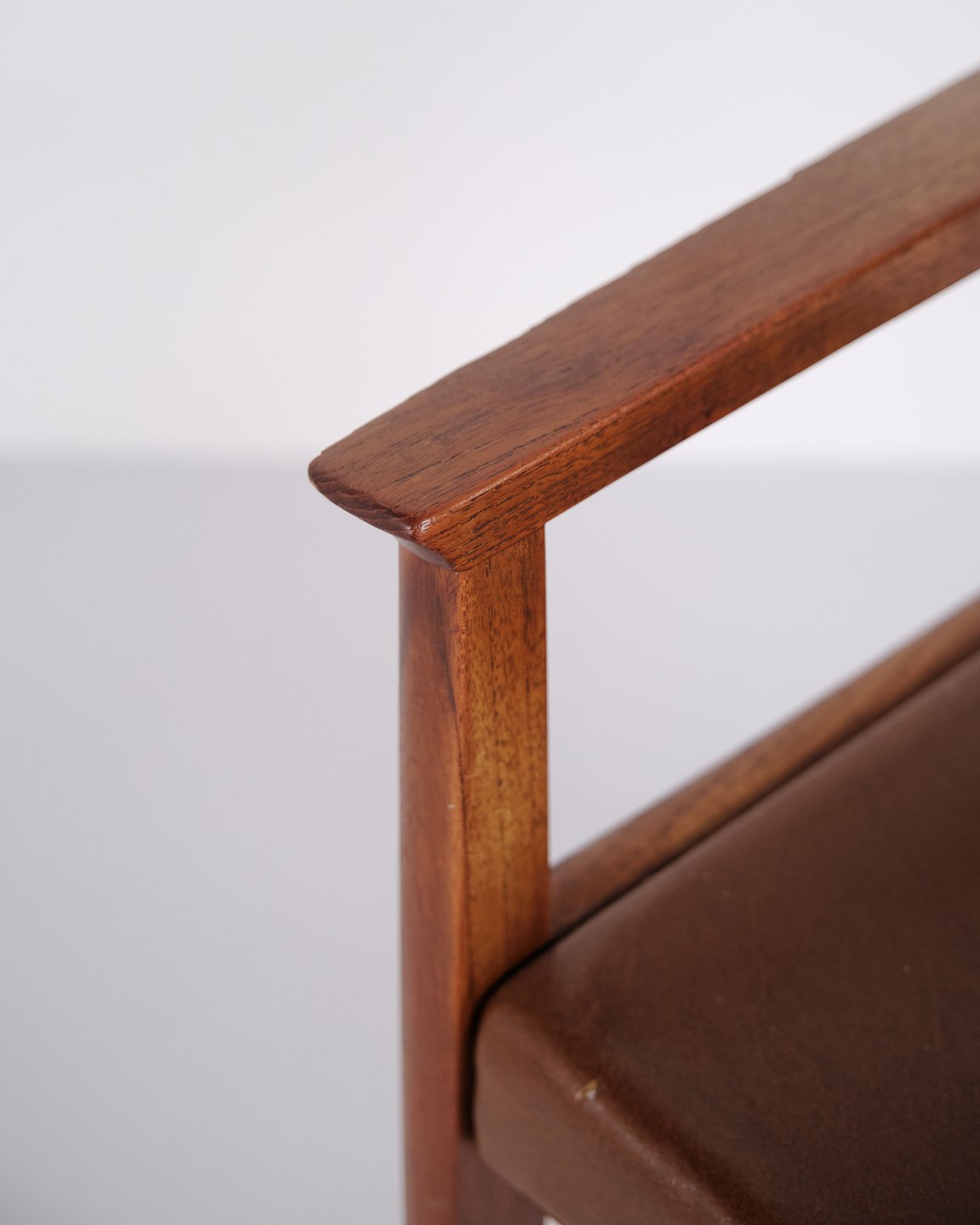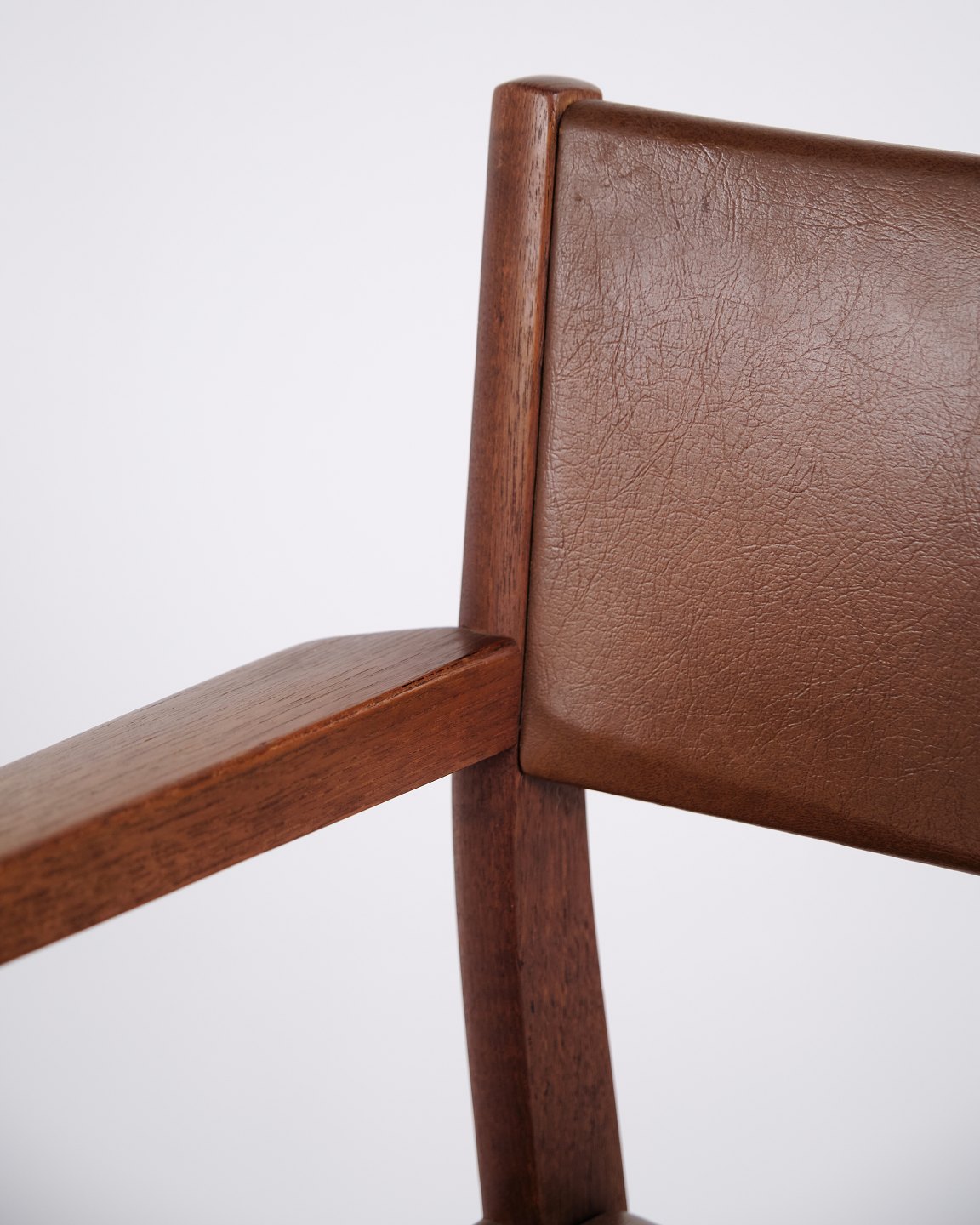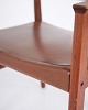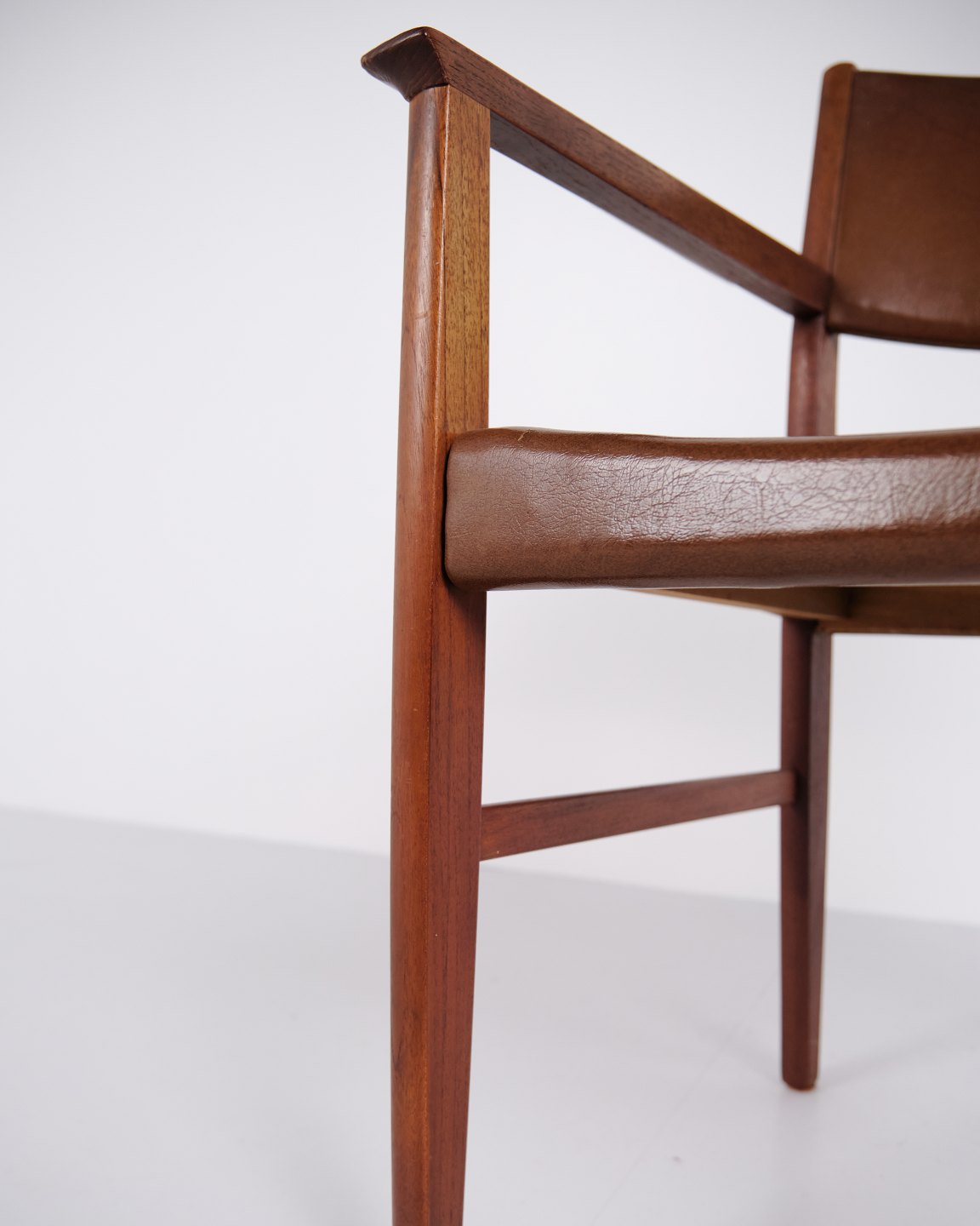 Armlehnstuhl aus Teakholz mit Sitz und Rücken aus braunem Leder. Der Stuhl ist ein Beispiel für dänisches Möbeldesign der 1960er-Jahre und zeichnet sich durch Materialqualität und funktionale Konstruktion aus. Geeignet als Esszimmerstuhl, Schreibtischstuhl oder freistehender Armlehnstuhl.
