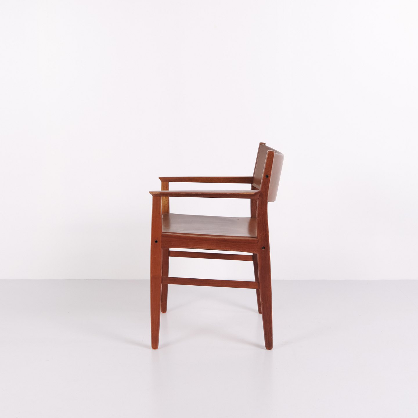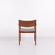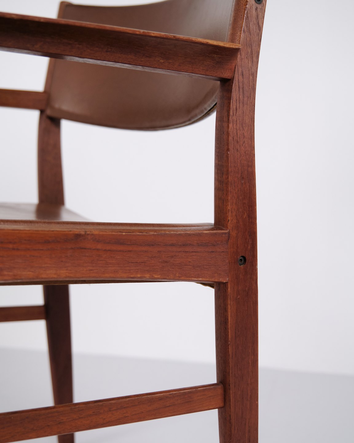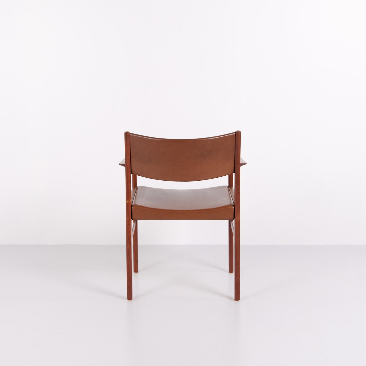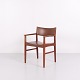 Armlehnstuhl aus Teakholz mit Sitz und Rücken aus braunem Leder. Der Stuhl ist ein Beispiel für dänisches Möbeldesign der 1960er-Jahre und zeichnet sich durch Materialqualität und funktionale Konstruktion aus. Geeignet als Esszimmerstuhl, Schreibtischstuhl oder freistehender Armlehnstuhl.