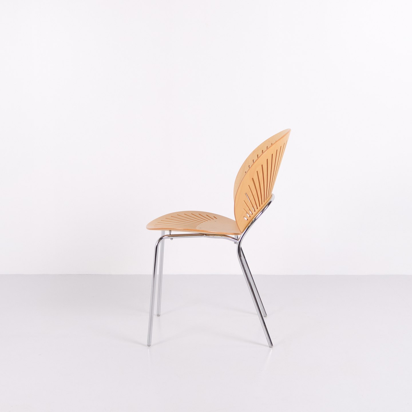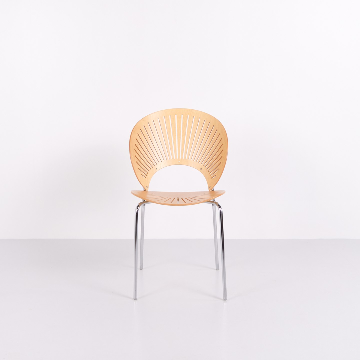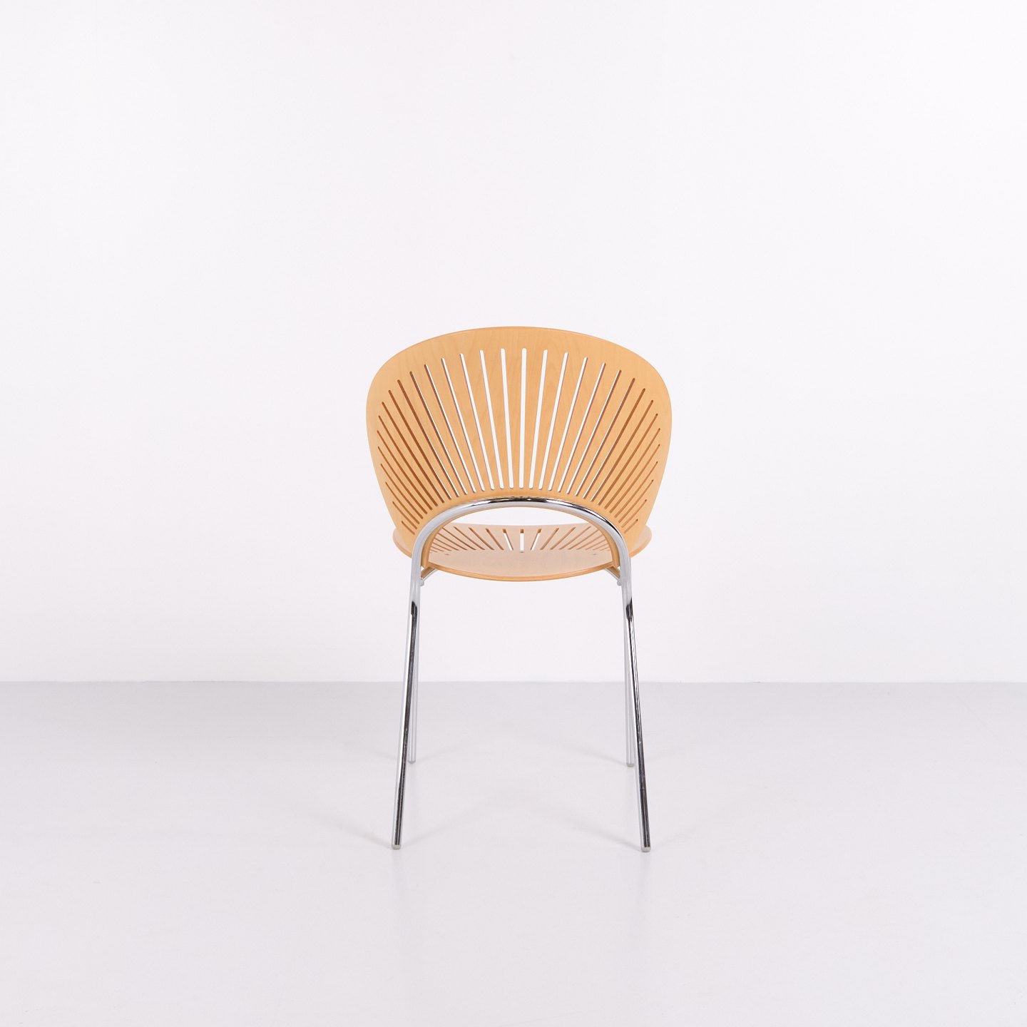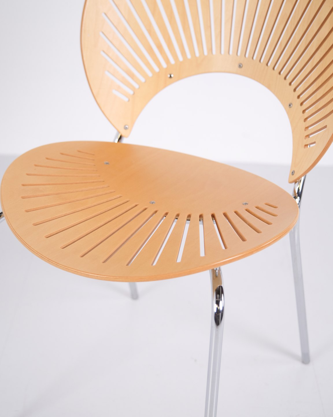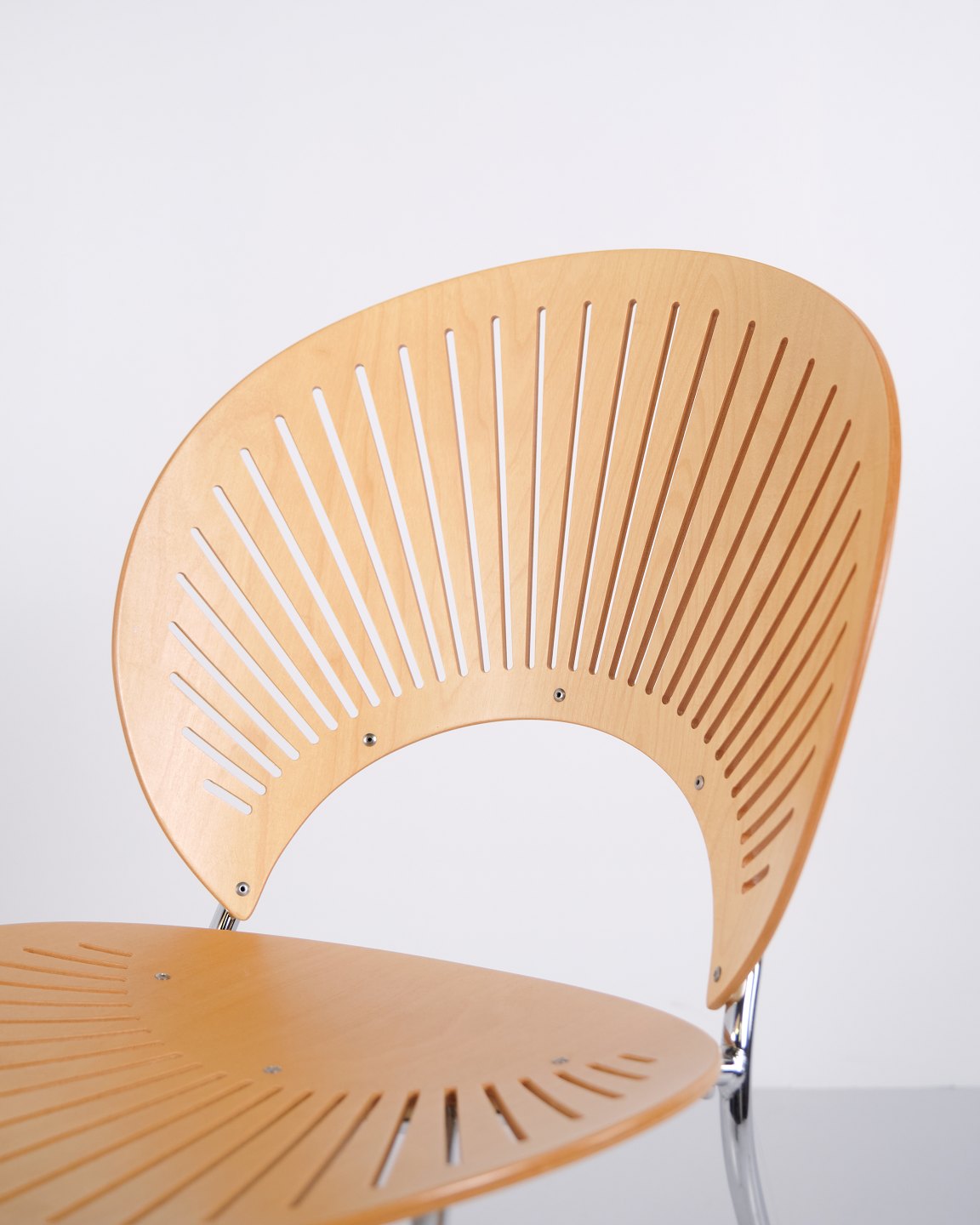 Satz bestehend aus fünf Esszimmerstühlen, Modell Trinidad 3398, entworfen von Nanna Ditzel. Der Trinidad-Stuhl ist bekannt für seine charakteristische ausgeschnittene Rückenlehne und wurde in den 1990er-Jahren eingeführt. Das Modell wurde sowohl als Esszimmer- als auch als Konferenzstuhl verwendet und gehört zum dänischen Möbeldesign des späten 20. Jahrhunderts.