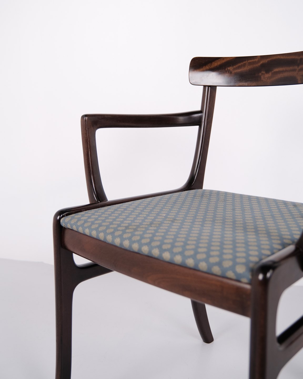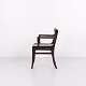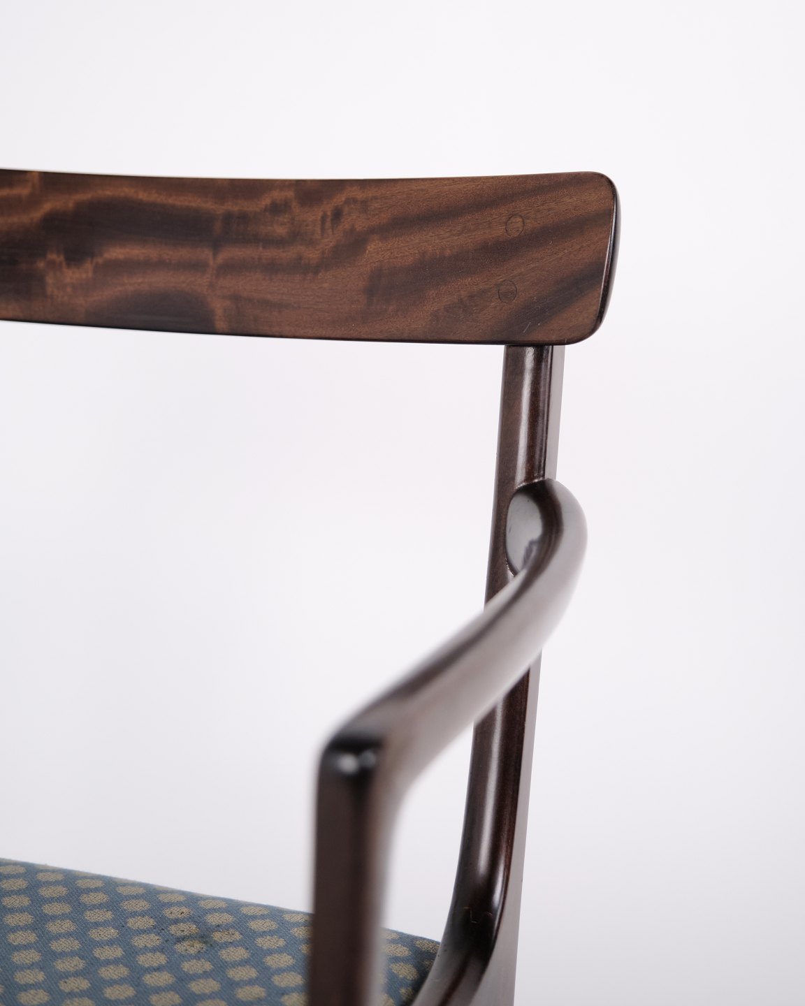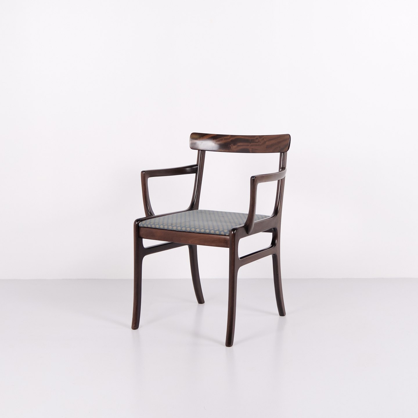 Armlehnstuhl aus der Serie Rungstedlund, entworfen von Ole Wanscher und hergestellt bei Poul Jeppesen Møbelfabrik in Dänemark in den 1950er Jahren. Der Stuhl zeichnet sich durch ausgewogene Proportionen und präzise Schreinerarbeit aus und spiegelt die dänische Möbeltradition der Mitte des 20. Jahrhunderts wider.