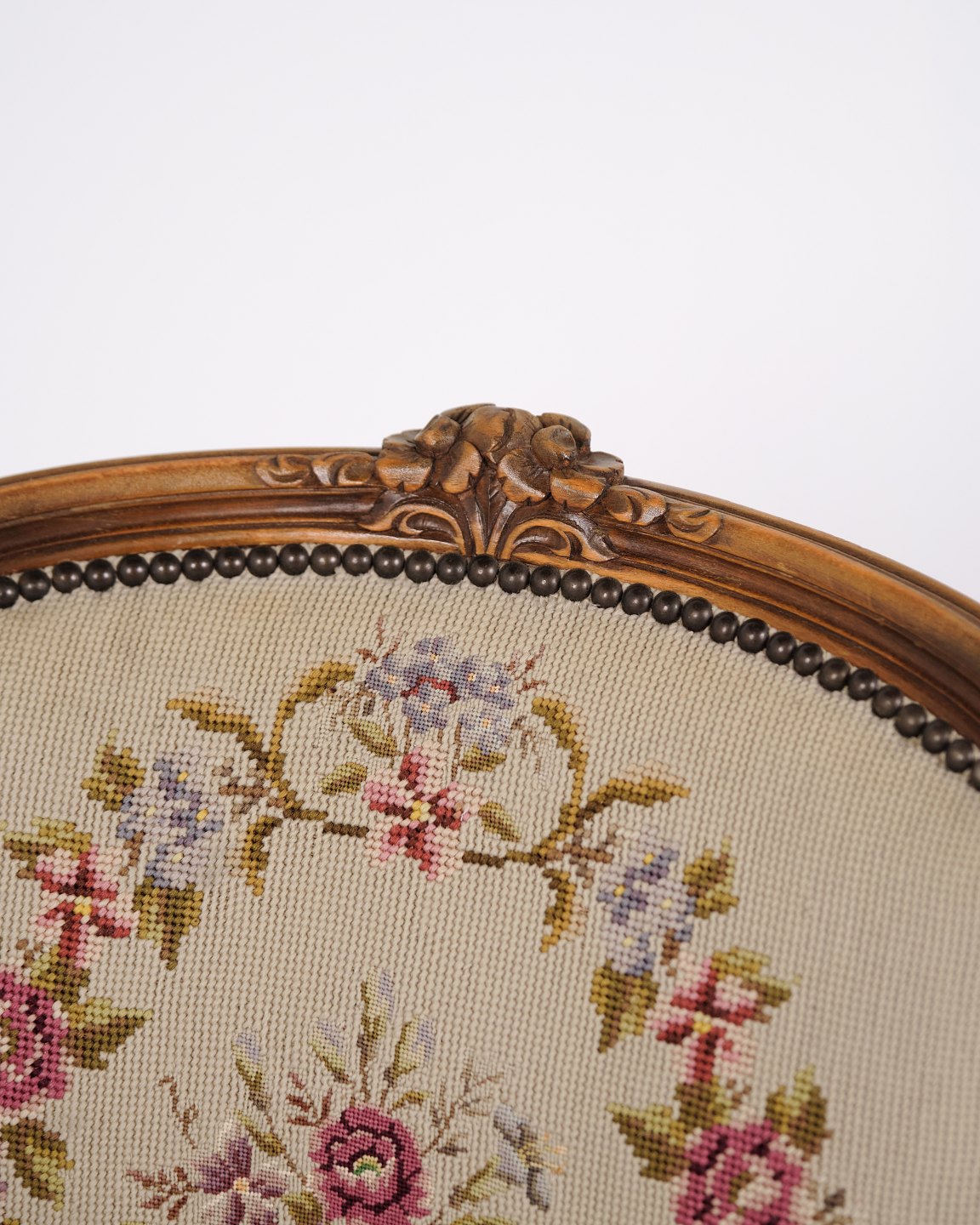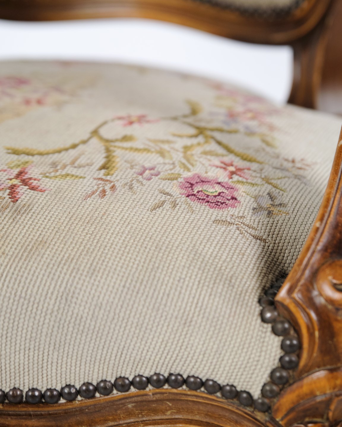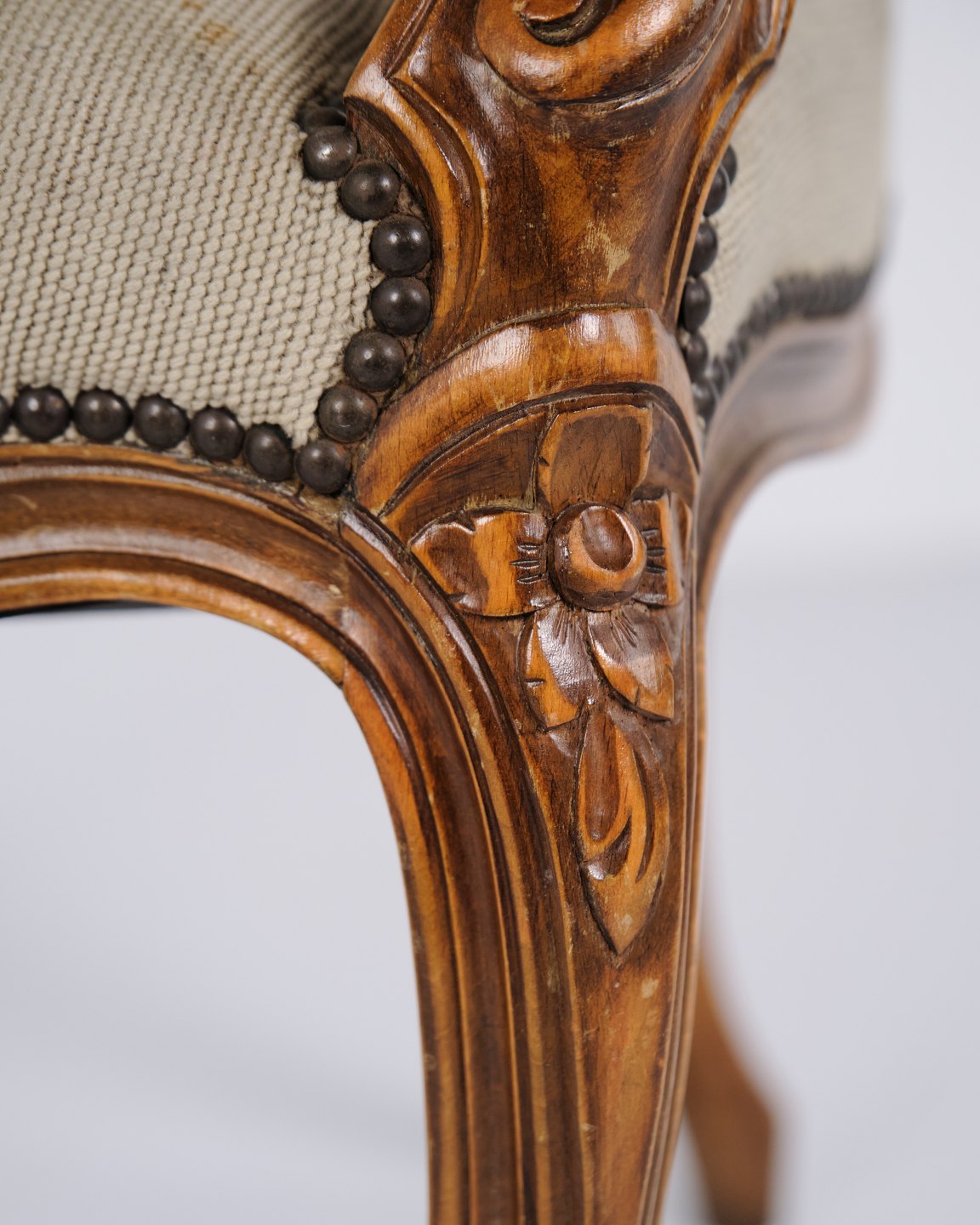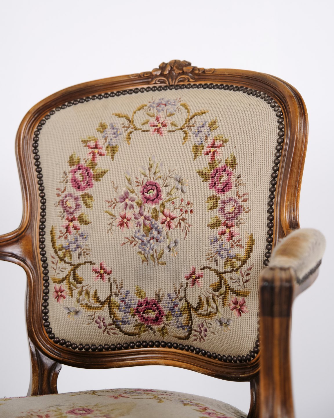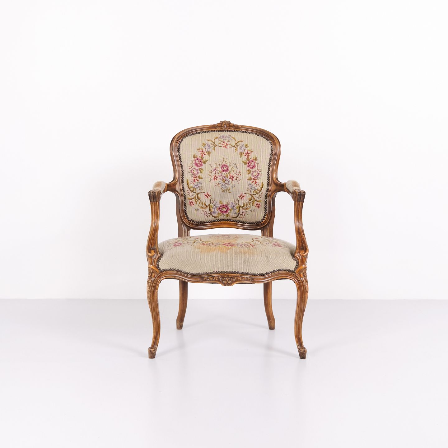 Neorokoko Sessel aus den 1930er Jahren mit geschwungenen Beinen und floralem Stoff. Klassisches und dekoratives Möbelstück mit romantischem Ausdruck.