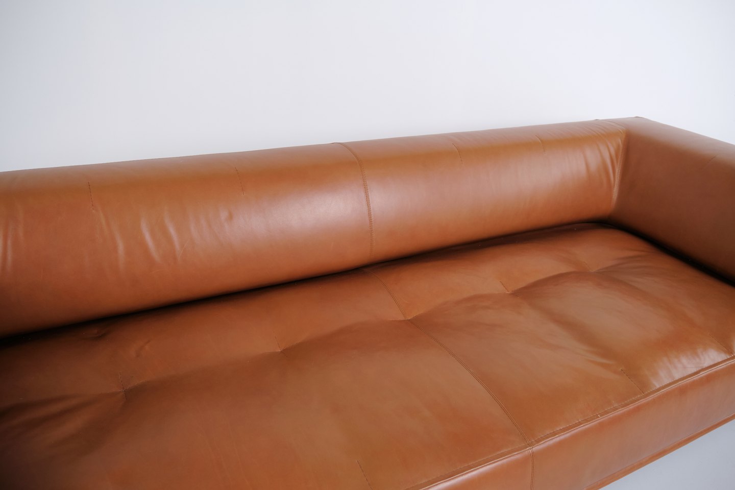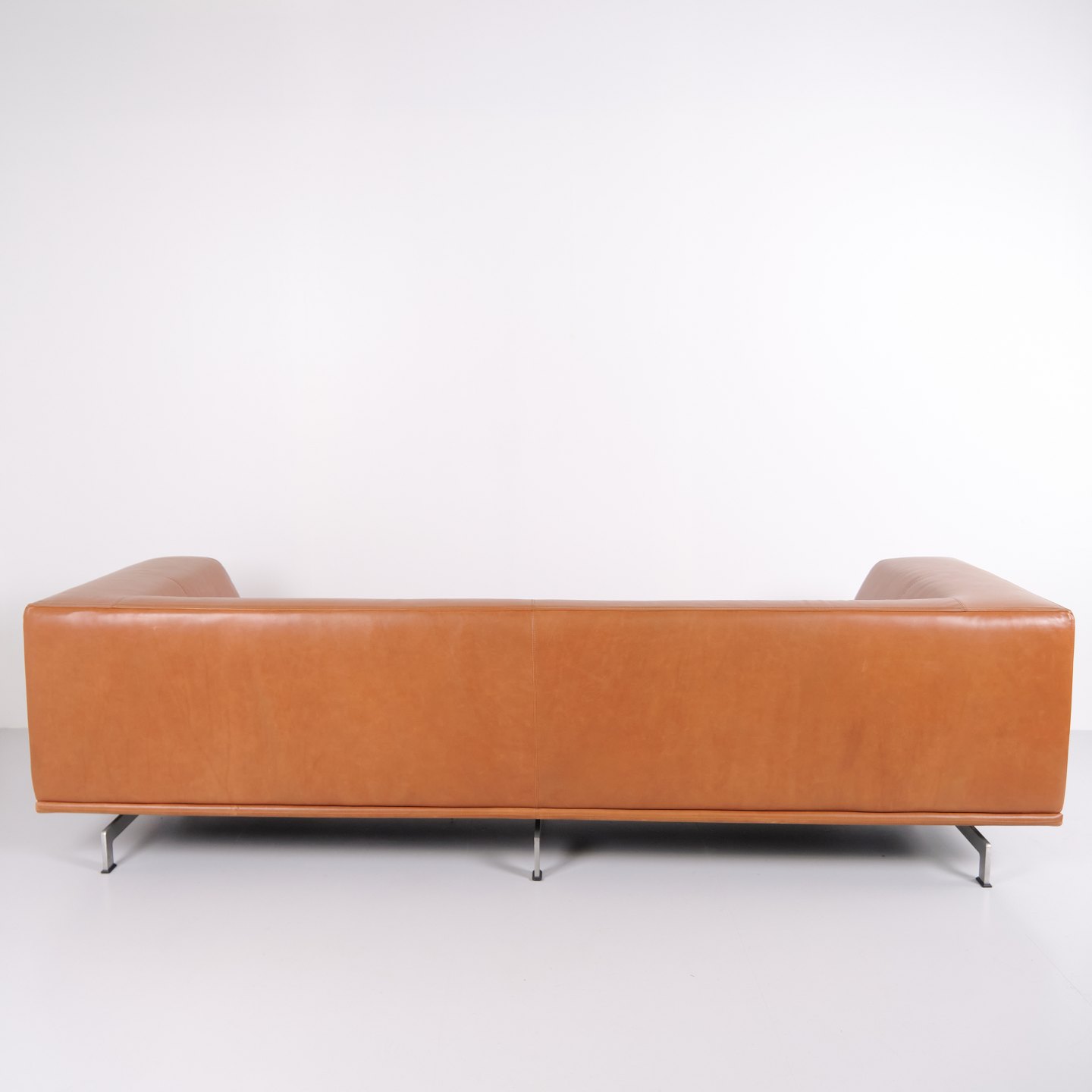 Erik Jørgensen Delphi Sofa Modell EJ 450, entworfen von Hannes Wettstein, aus Cognac-Leder mit Gestell aus gebürstetem Aluminium. Modernes skandinavisches Design.