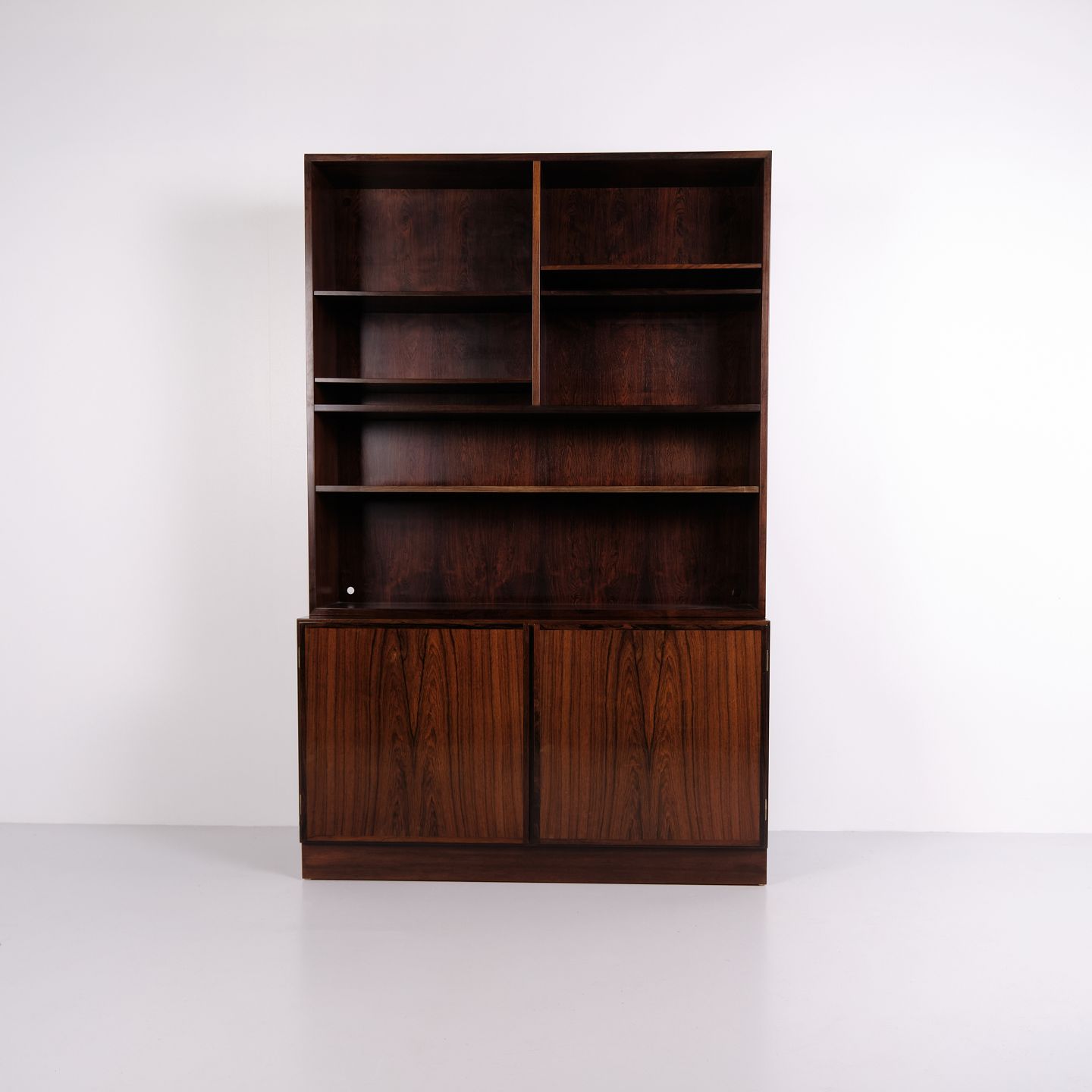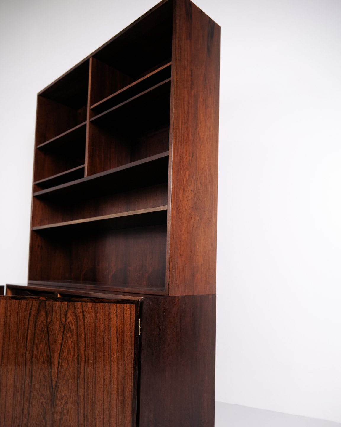 Regal, Modell 5, entworfen von Gunni Omann und hergestellt bei Poul Hundevad in Dänemark in den 1960er Jahren. Das Möbel ist aus Palisander gefertigt und spiegelt die klaren Linien und die funktionale Gestaltung wider, die typisch für das dänische Möbeldesign dieser Zeit sind.