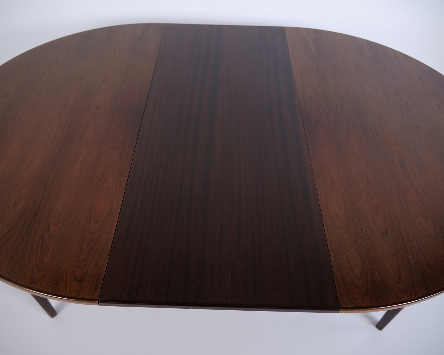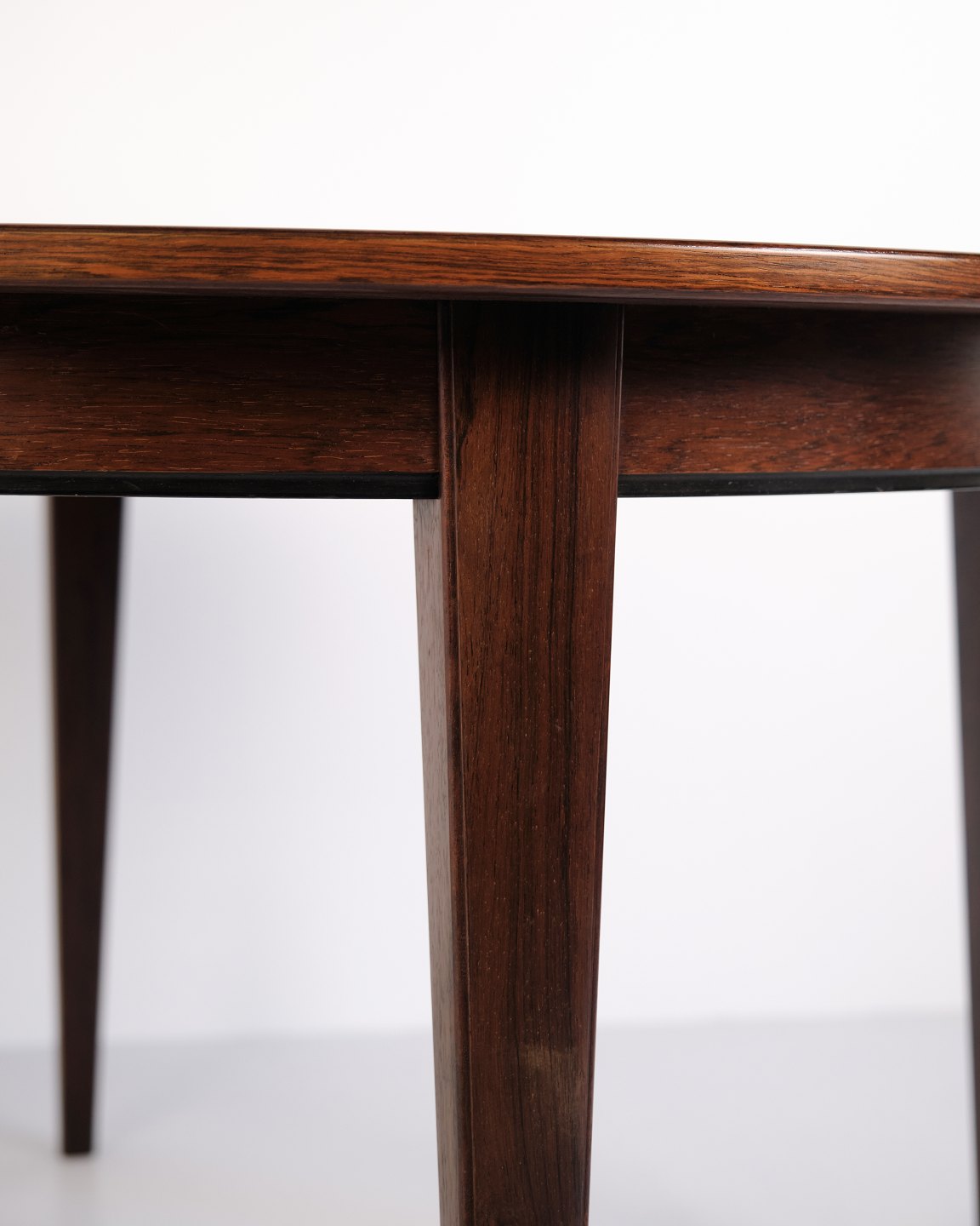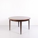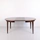 Runder Esstisch Modell 55, entworfen und hergestellt von Omann Jun im Jahr 1964. Der Tisch ist aus Palisanderfurnier gefertigt und steht auf eleganten, konischen Beinen, die typisch für das dänische Möbeldesign dieser Zeit sind. Die runde Form und das schlichte Design verleihen dem Tisch einen klassischen und zeitlosen Ausdruck.
