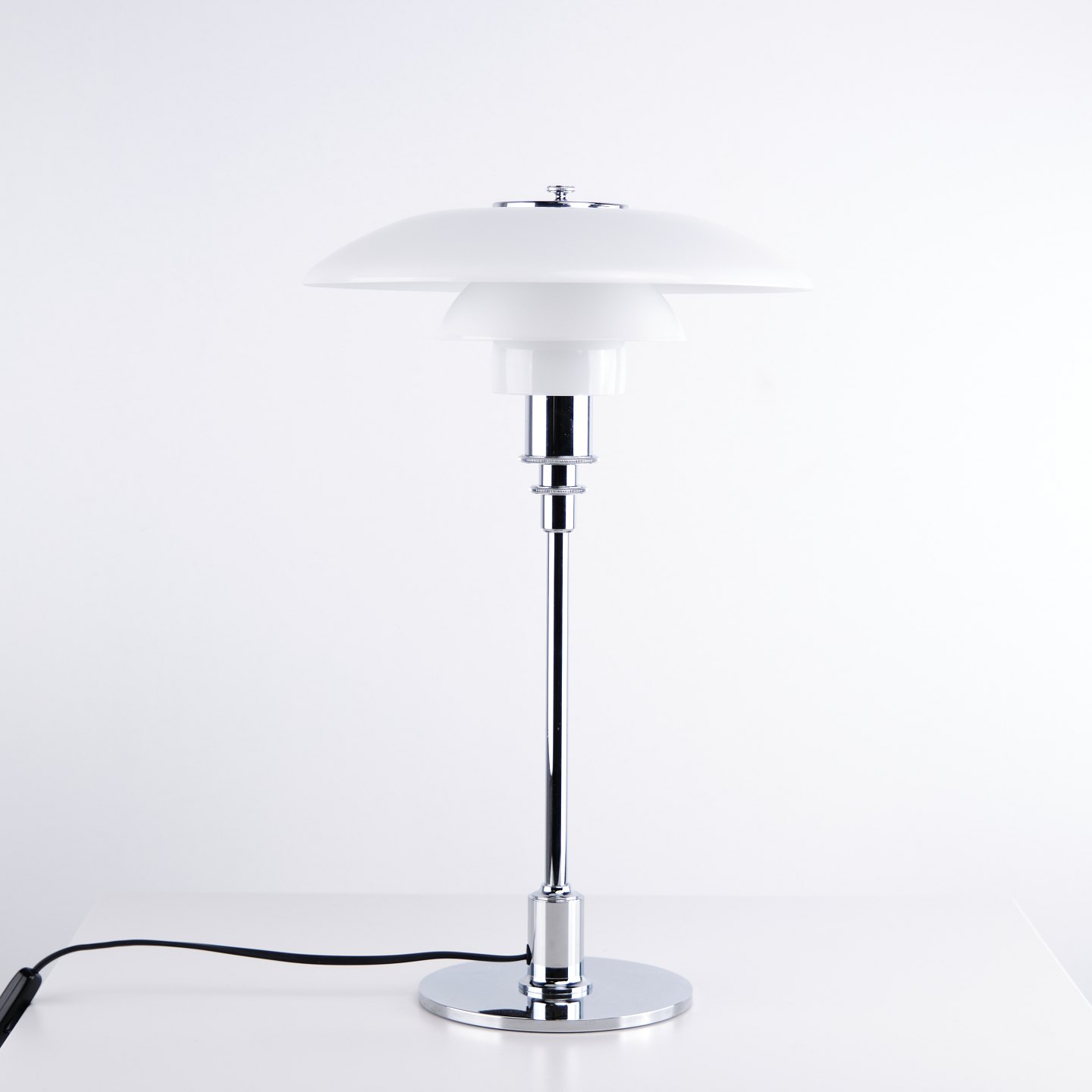 PH 3/2 Tischlampe, entworfen von Poul Henningsen und hergestellt von Louis Poulsen. Die Lampe ist mit Schirmen aus weißem Opalglas ausgeführt, die ein weiches und blendfreies Licht gewährleisten. Das ikonische Dreischirmsystem wurde für eine optimale Lichtverteilung entwickelt und ist ein zentrales Element in Henningsens Designphilosophie.