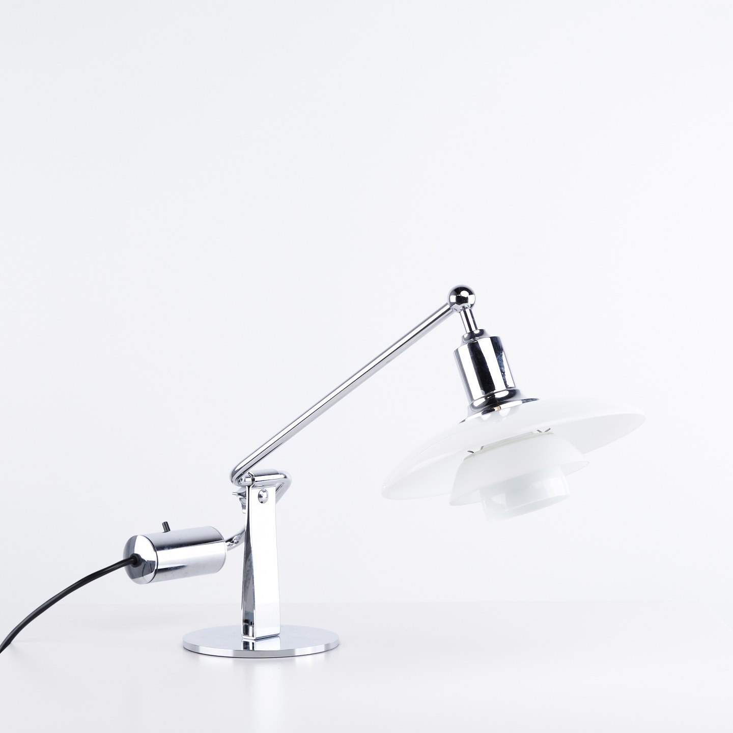 PH 2/1 Klavier-/Kipplampe, entworfen von Poul Henningsen und hergestellt von Louis Poulsen. Die Lampe ist mit Schirmen aus weißem Opalglas und einem verstellbaren Arm ausgeführt, der eine flexible Lichtausrichtung und ein weiches, blendfreies Licht ermöglicht.