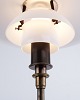 PH 3/2 Treph Tischlampe, entworfen von Poul Henningsen und als Jubiläumsmodell im Jahr 1994 von Louis Poulsen herausgegeben. Die Lampe ist mit einem brünierten Gestell und klassischen Schirmen aus weißem Opalglas ausgeführt, die ein weiches und blendfreies Licht gewährleisten. Das ikonische Dreischirmsystem wurde für eine optimale Lichtverteilung entwickelt und ist ein zentrales Element in Henningsens Designphilosophie.