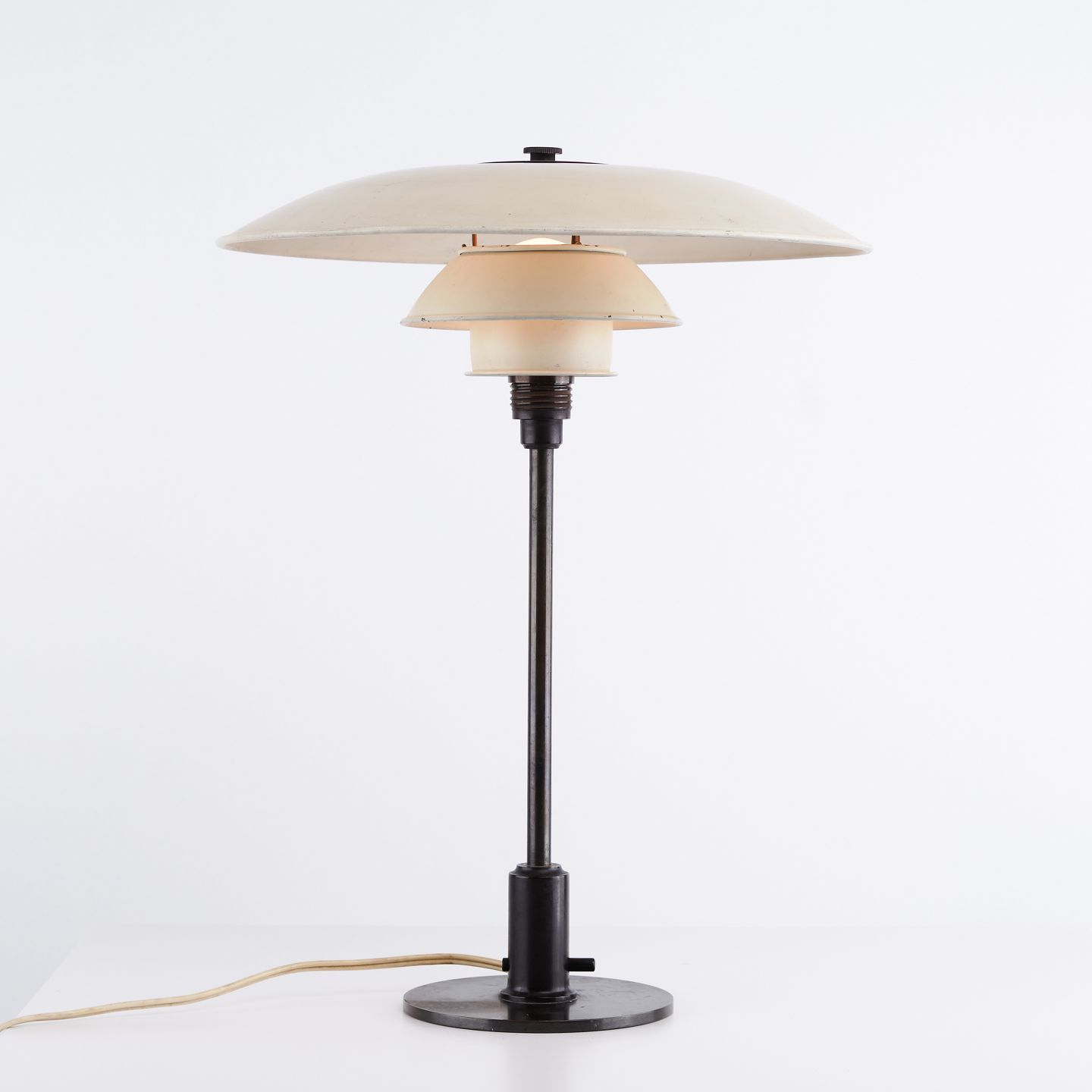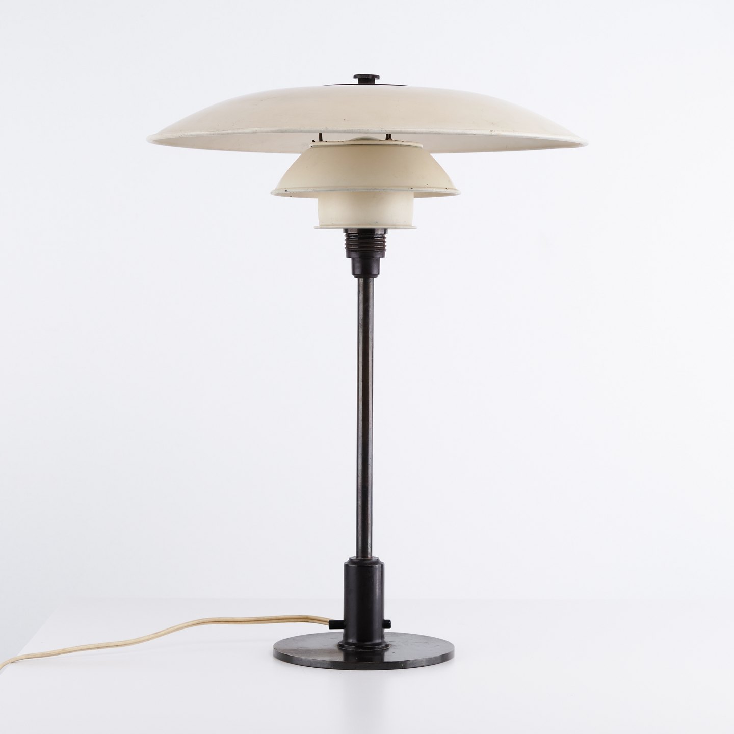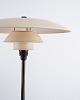 PH 3,5/2,5 Tischlampe, entworfen von Poul Henningsen und hergestellt von Louis Poulsen in den 1930er Jahren. Die Lampe ist mit weiß lackierten Metallschirmen ausgeführt, die ein weiches und gleichmäßig verteiltes Licht gewährleisten.