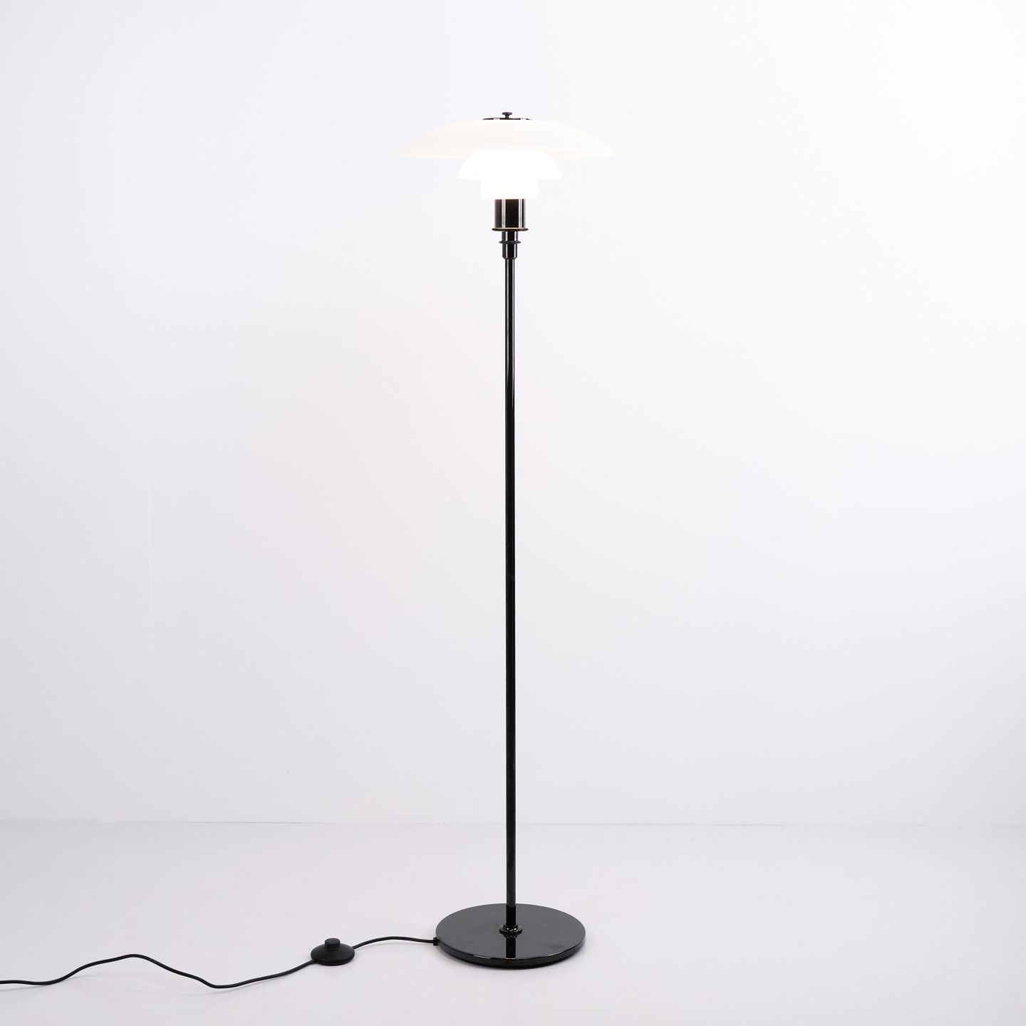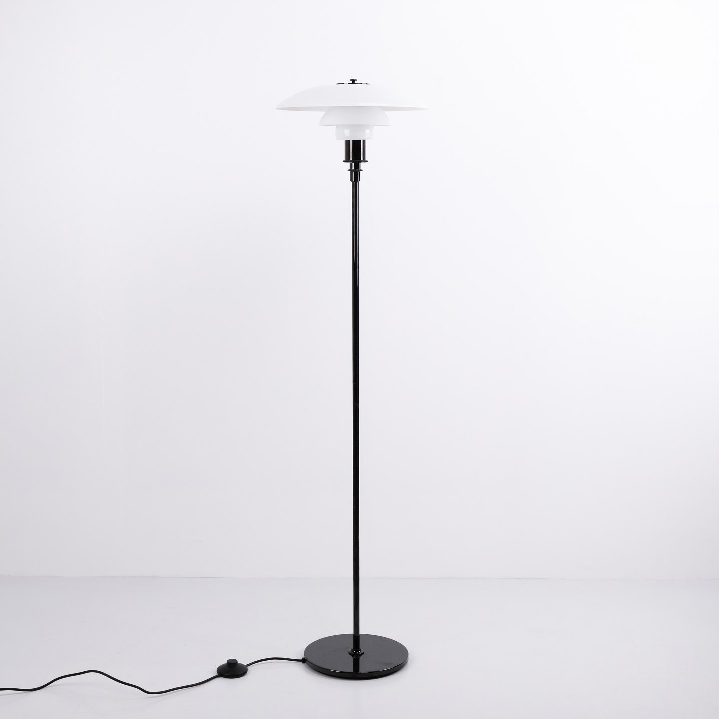 PH 3,5/2,5 Stehlampe, entworfen von Poul Henningsen und hergestellt von Louis Poulsen. Die Lampe ist mit einem schwarz lackierten Gestell und Schirmen aus weißem Opalglas ausgeführt, was ihr einen eleganten und ausgewogenen Ausdruck verleiht. Das ikonische Dreischirmsystem sorgt für ein weiches, blendfreies Licht und eine gleichmäßige Lichtverteilung.