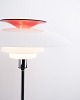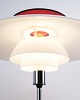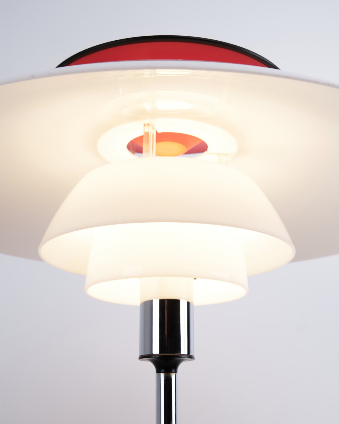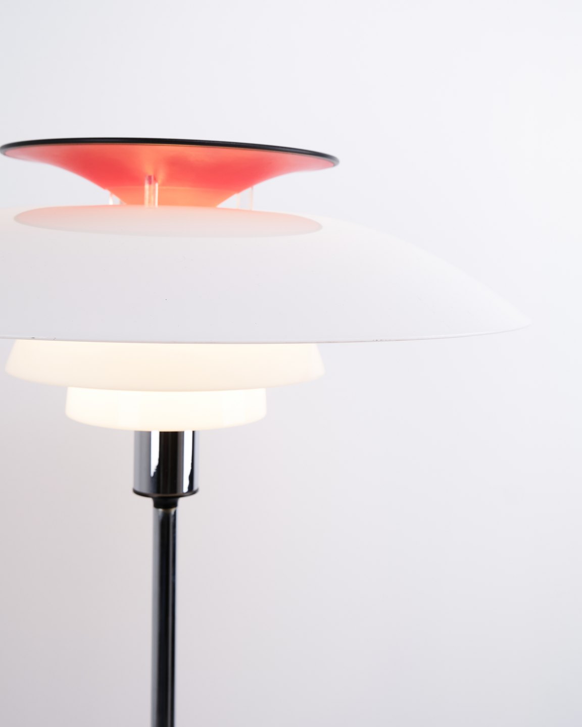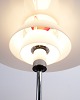 PH 80 Stehlampe, entworfen von Poul Henningsen und hergestellt von Louis Poulsen. Die Lampe wurde 1974 anlässlich des 80. Geburtstags von Poul Henningsen eingeführt. Sie ist mit Schirmen aus weißem Opal-Acryl und einem Gestell aus Chrom ausgeführt, was ihr einen leichten und modernen Ausdruck verleiht.