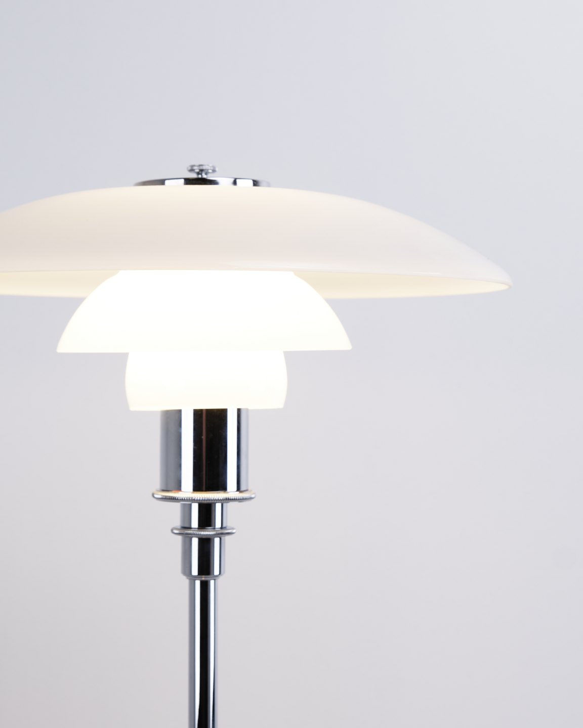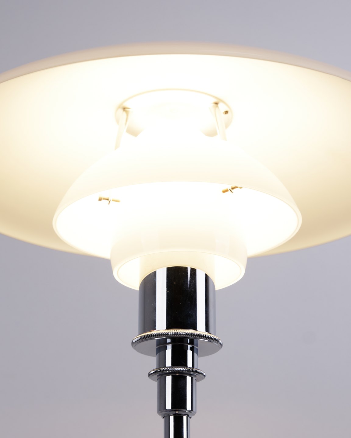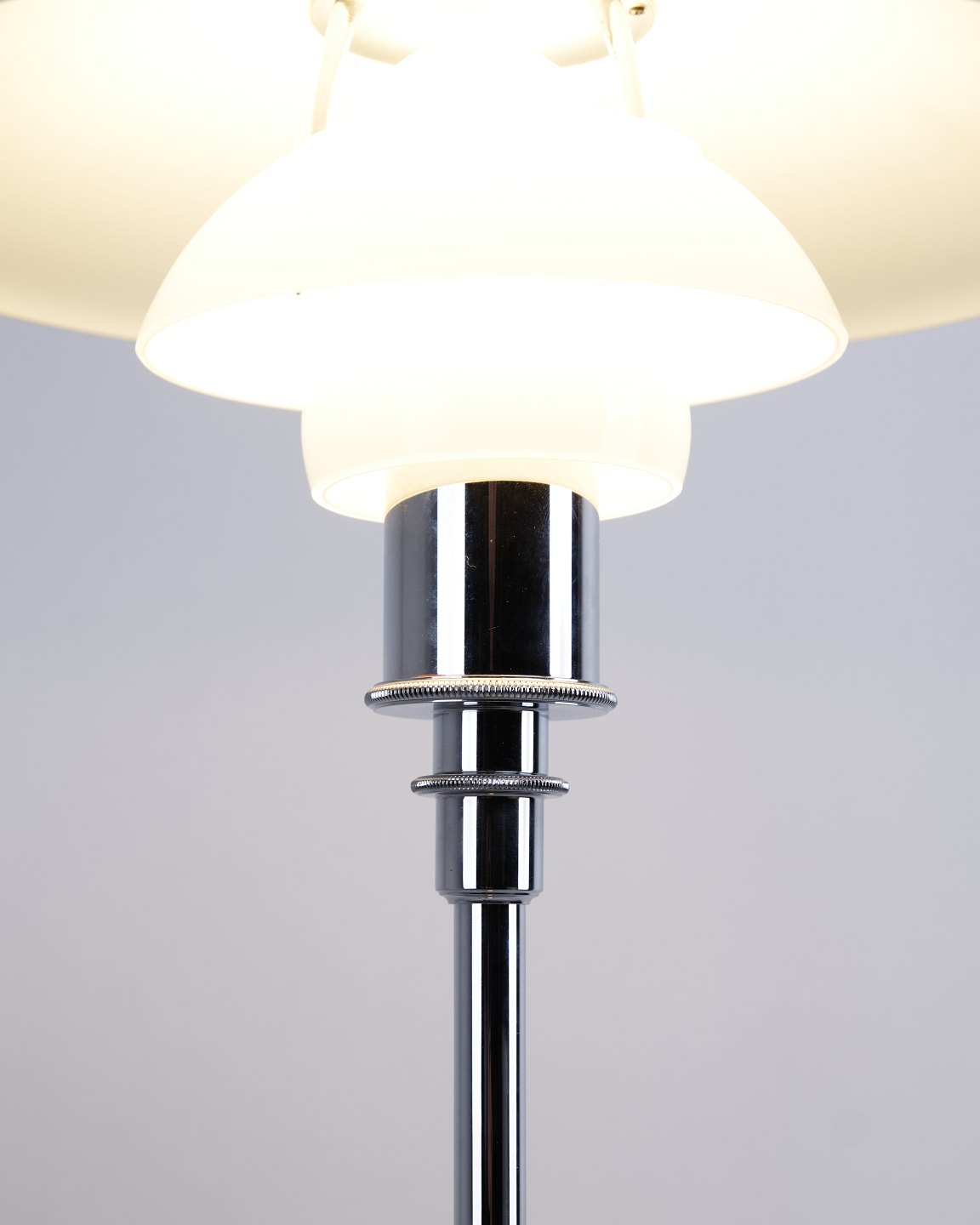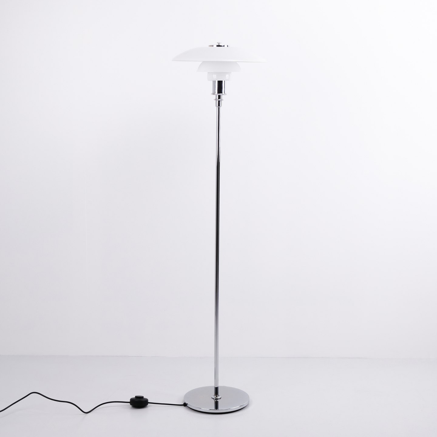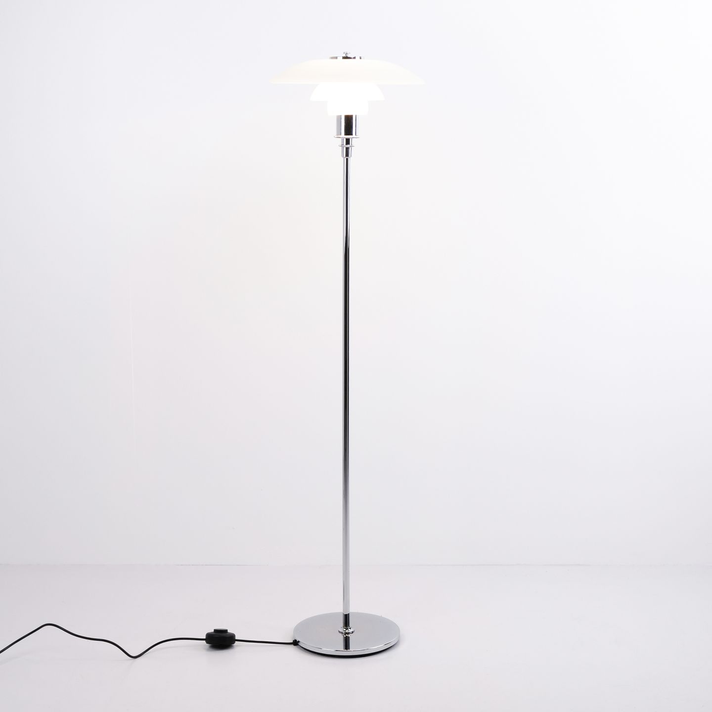 PH 3½-2½ Stehlampe in Chrom mit Opalglas von Louis Poulsen. Entworfen von Poul Henningsen mit klassischem dänischem Lichtdesign und elegantem Ausdruck.
