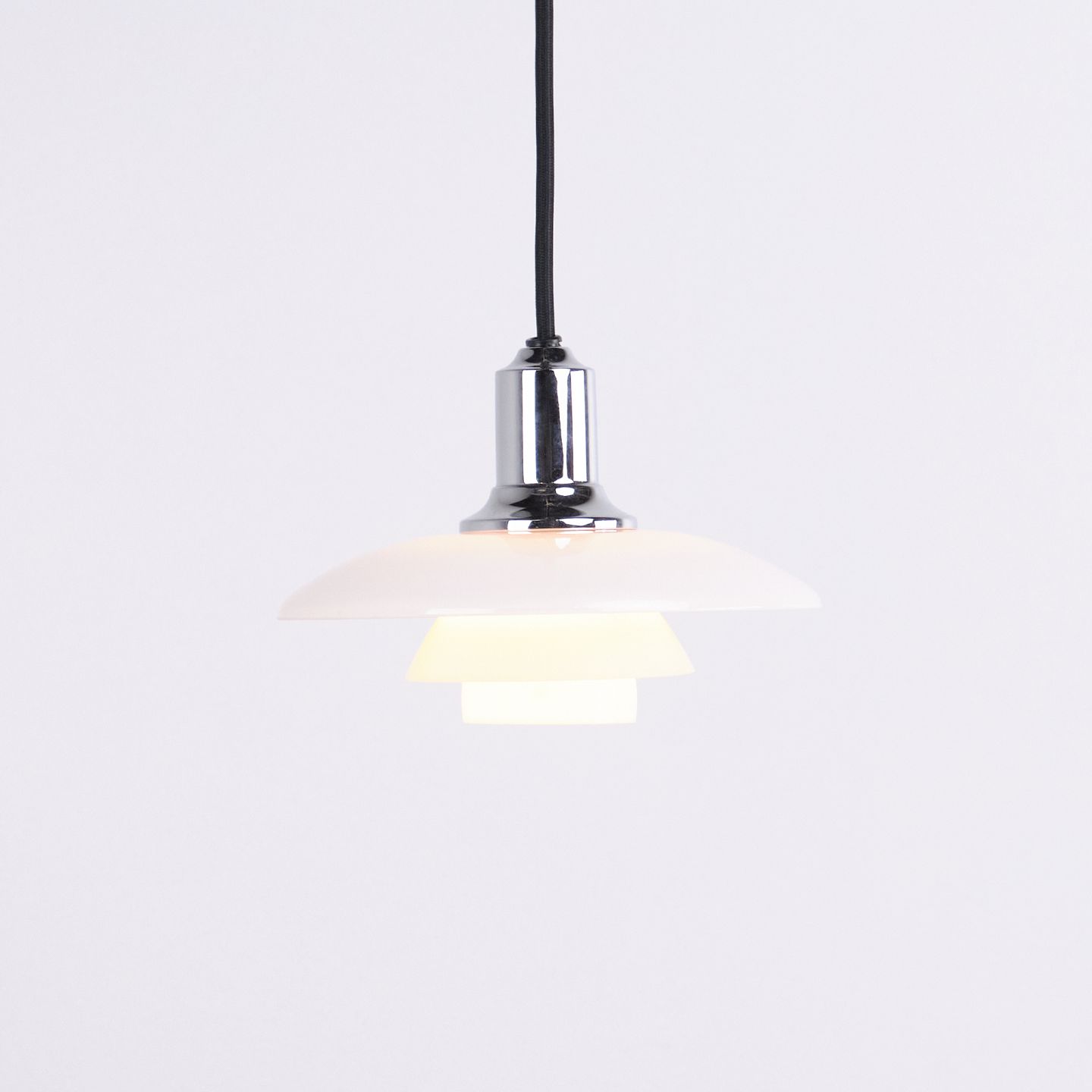 PH 2/1 Pendelleuchte in Chrom mit Opalglas von Louis Poulsen. Entworfen von Poul Henningsen mit klassischem dänischem Lichtdesign und blendfreier Beleuchtung.