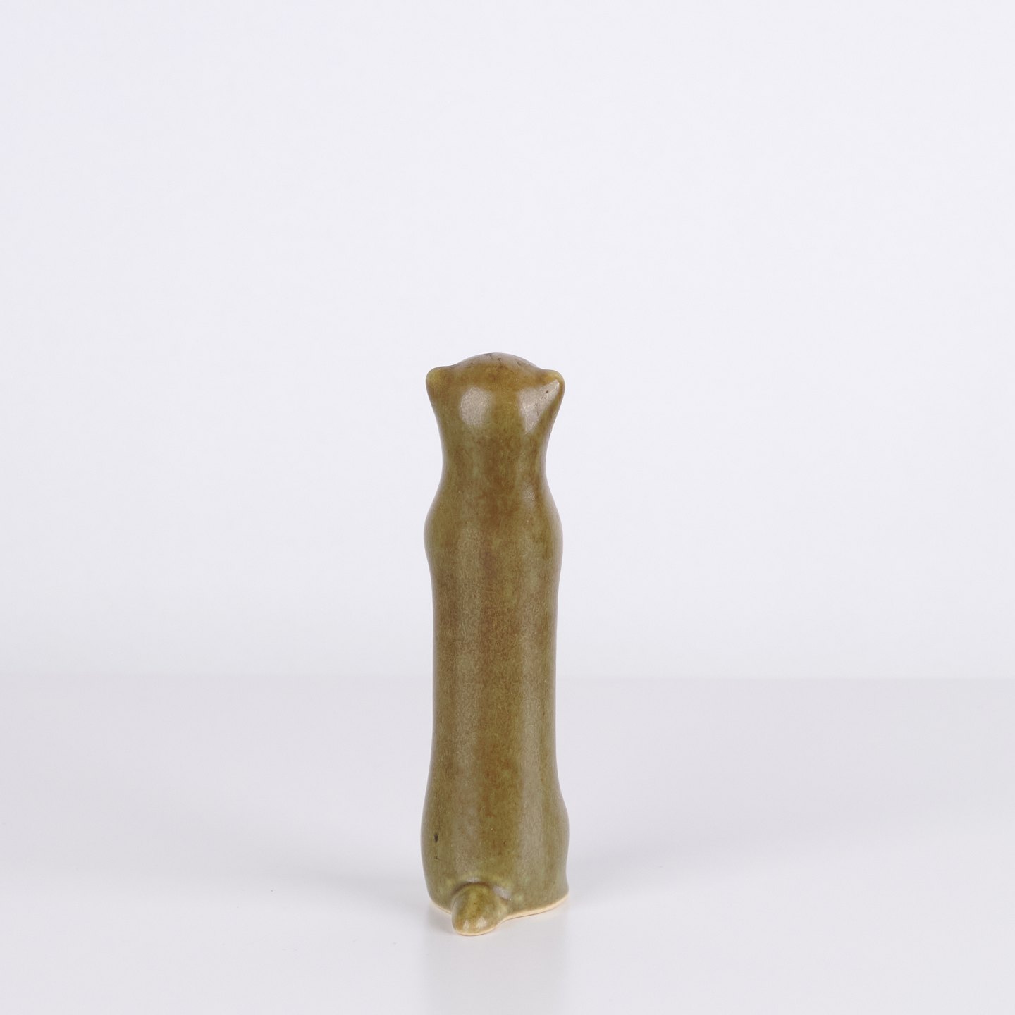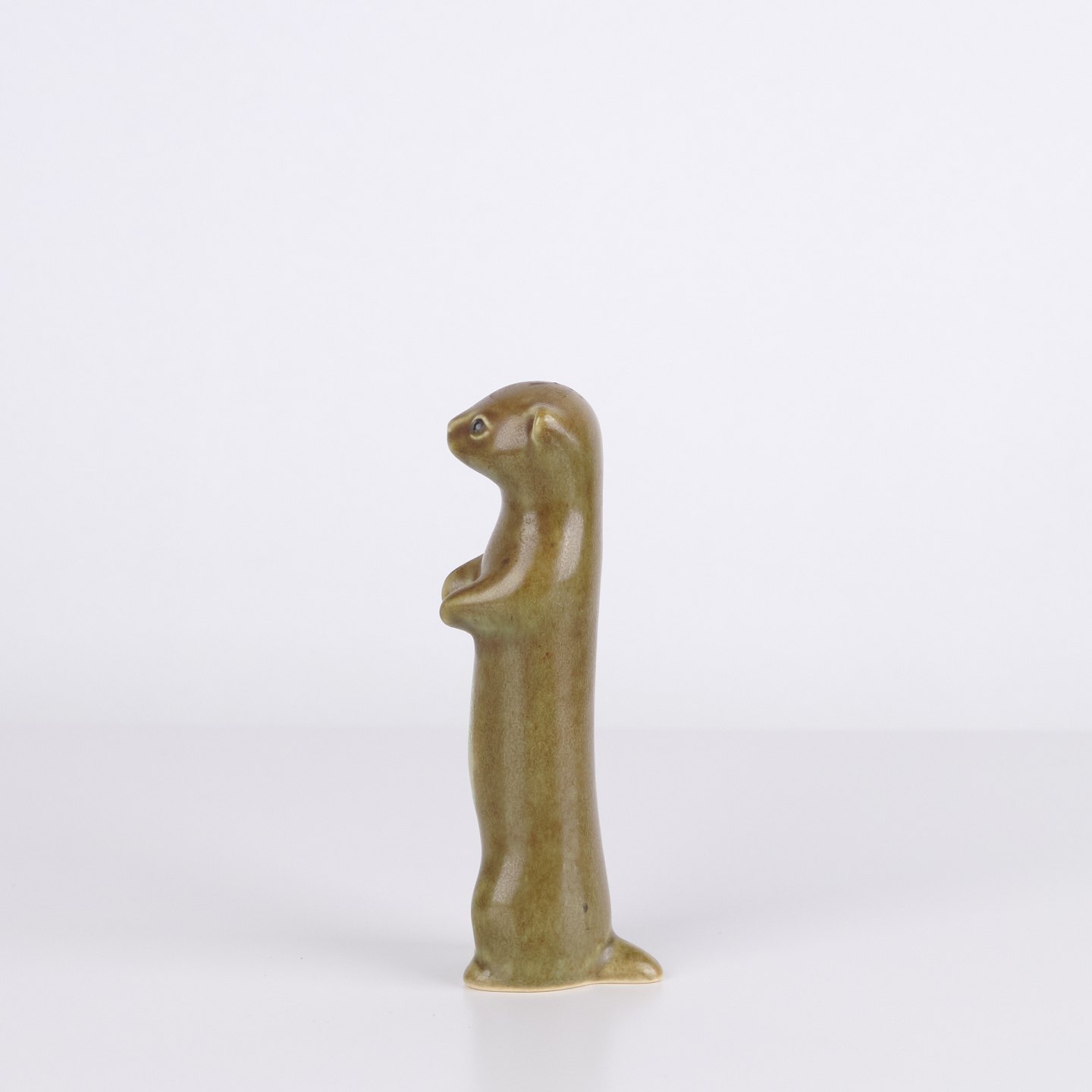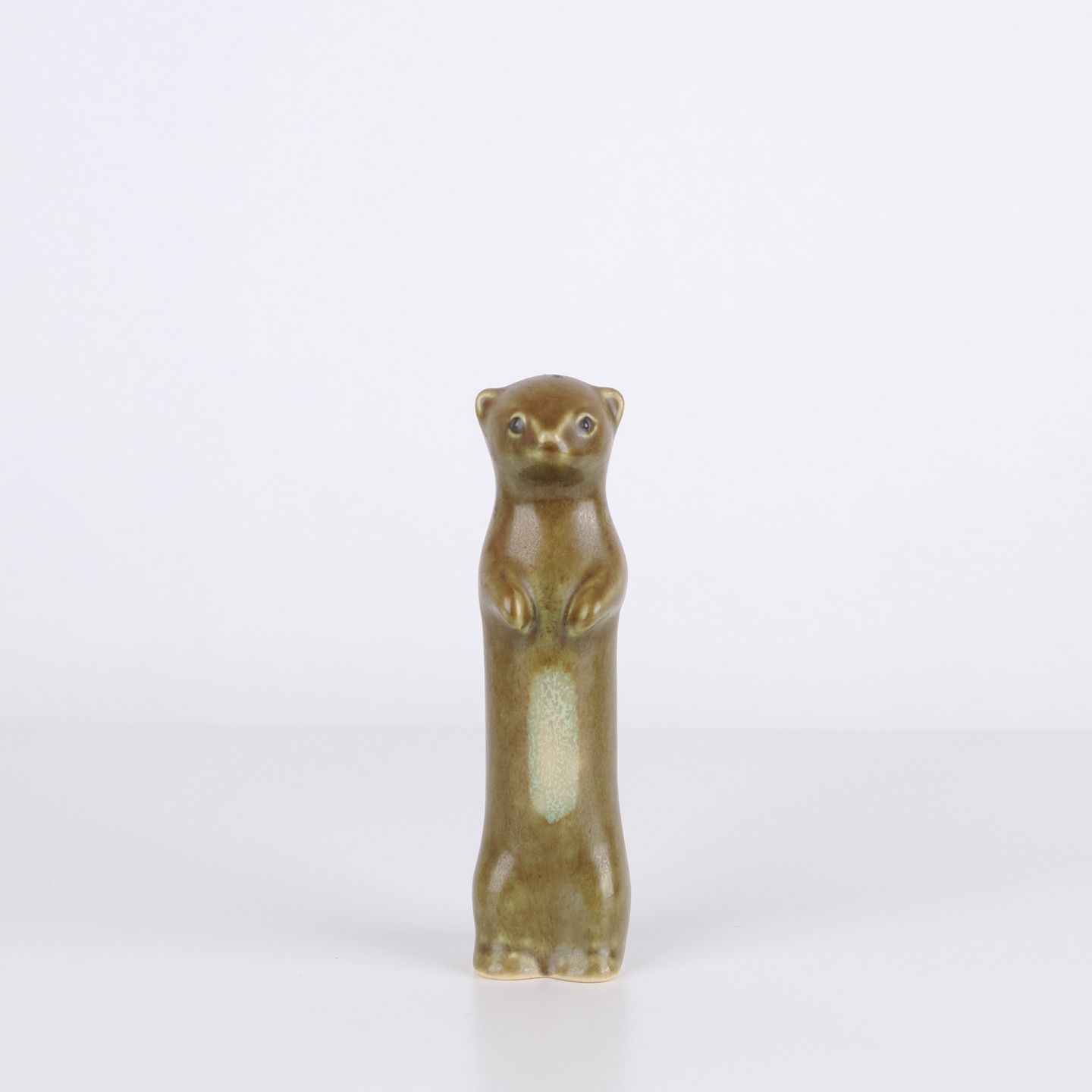 Tierfigur von Knud Basse aus glasierter Keramik. Die Figur stellt ein Frettchen oder Hermelin dar und wurde in den 1960er Jahren in Dänemark hergestellt. Knud Basse ist bekannt für keramische Tierfiguren mit Naturmotiven sowie kleinere Serien aus dieser Zeit.