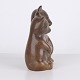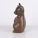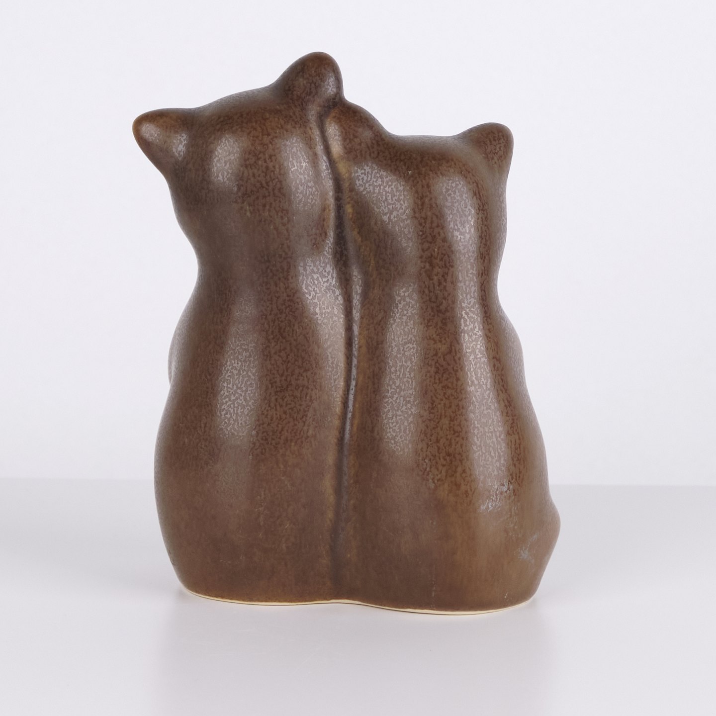Große Doppelfigur von Knud Basse aus braun glasierter Keramik. Das Modell zeigt zwei dicht nebeneinander sitzende Bären mit hervorgehobenen hellen Brustdetails. Eine größere und seltenere Figur aus Knud Basses Tierserie, hergestellt in Dänemark in den 1960er Jahren.