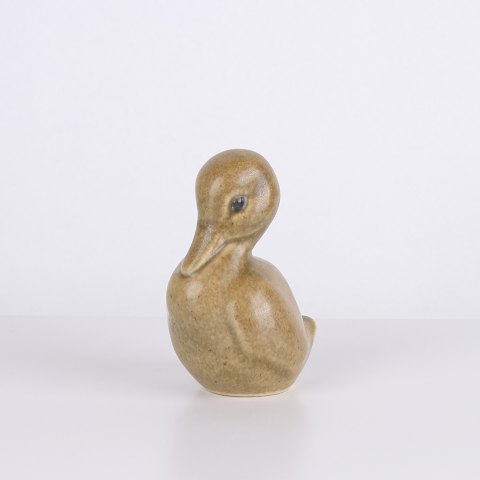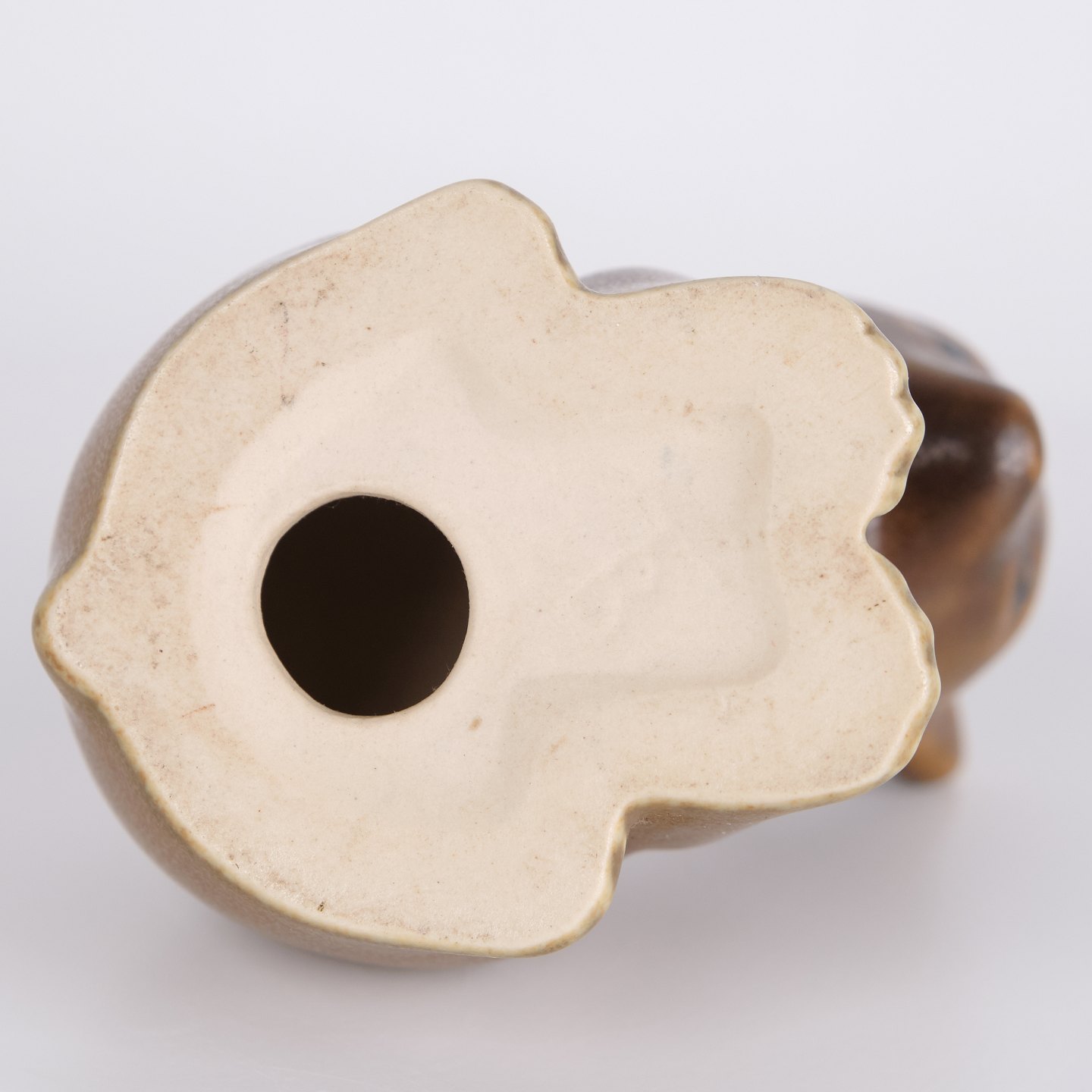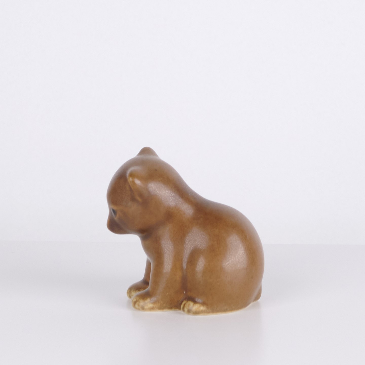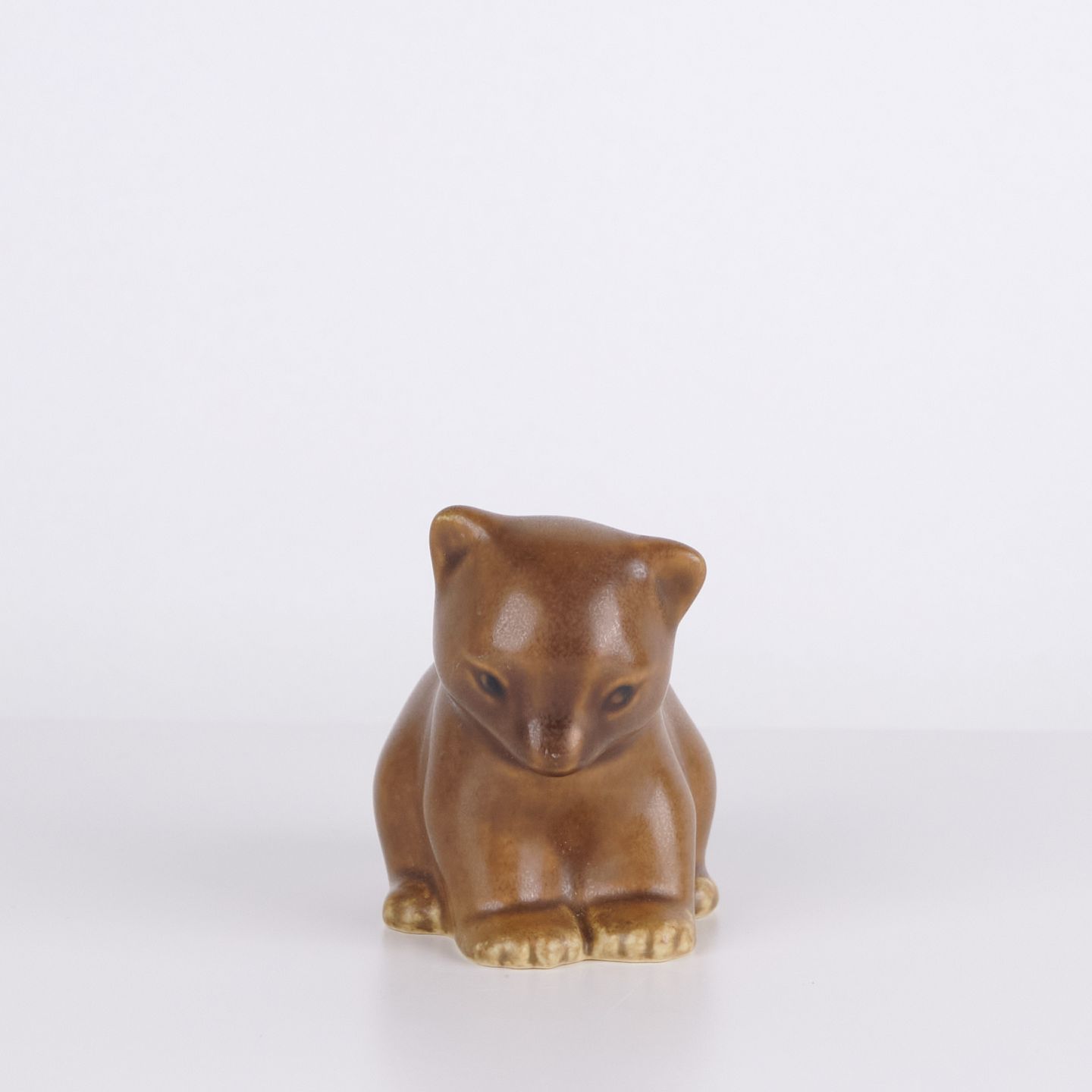 Bärenfigur von Knud Basse aus hellbraun glasierter Keramik. Die Figur zeigt einen sitzenden Bären mit gesenktem Kopf, markierten Pfoten und weichen organischen Formen. Ein klassisches kleineres Modell aus Knud Basses Serie von Tierfiguren, hergestellt in Dänemark in den 1960er Jahren.