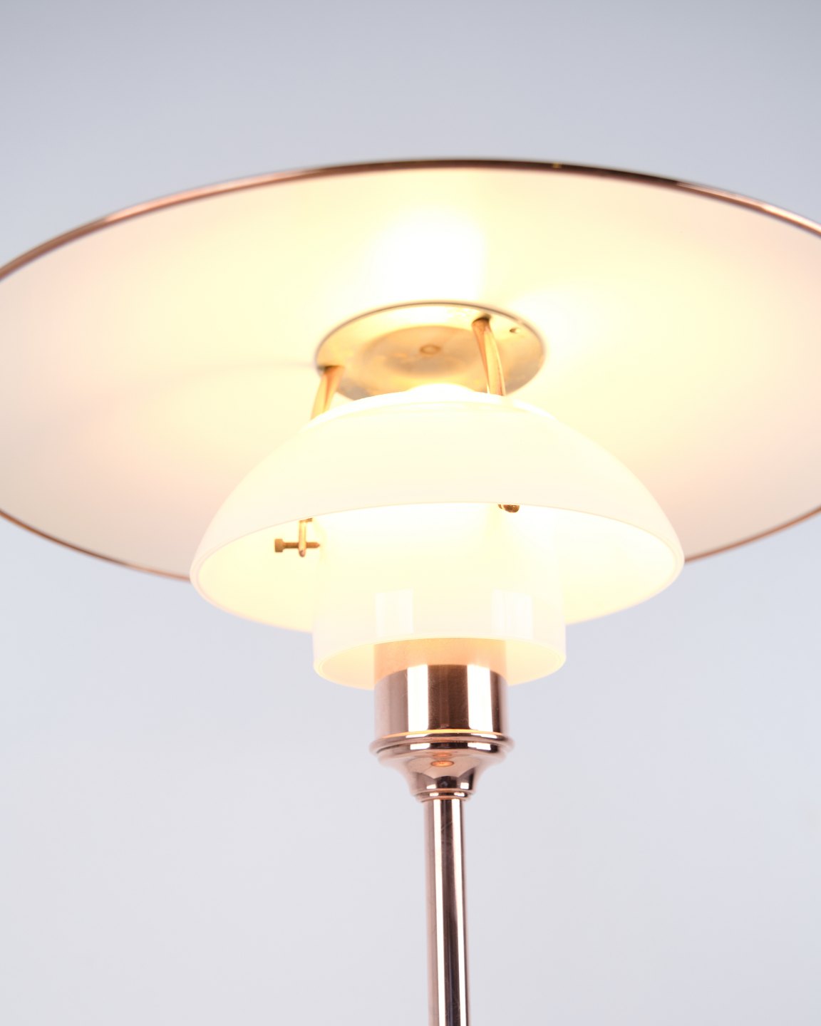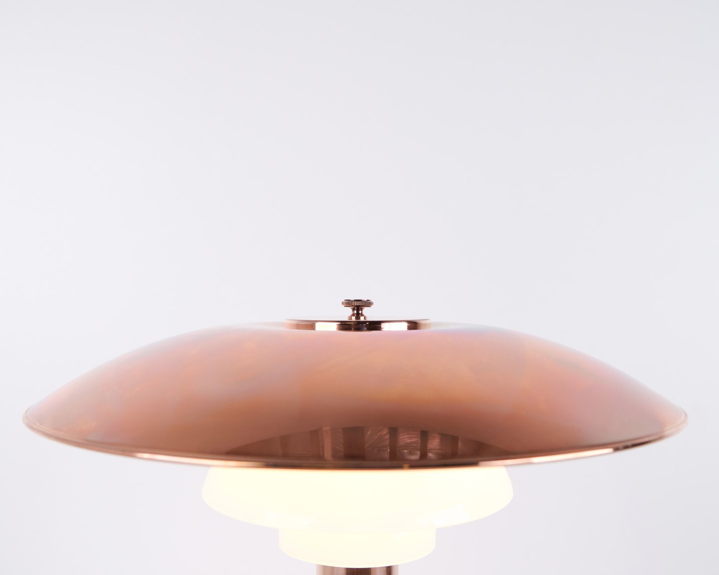 PH Tischlampe Modell PH 3½-2½ Limited Edition, entworfen von Poul Henningsen und hergestellt von Louis Poulsen. Die Lampe ist aus Kupfer gefertigt, mit oberem Schirm aus Kupfer sowie zwei unteren Schirmen aus weißem Opalglas. Bei dieser Ausführung ist nur der obere Kupferschirm enthalten. Das Modell wurde nur für einen begrenzten Zeitraum im Jahr 2015 produziert und verkauft und ist daher besonders begehrt bei Sammlern von PH Lampen und dänischem Lichtdesign.
